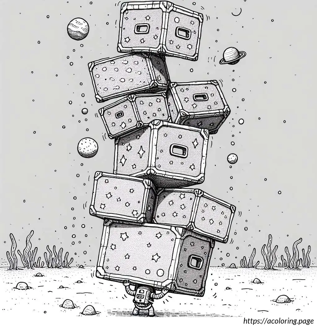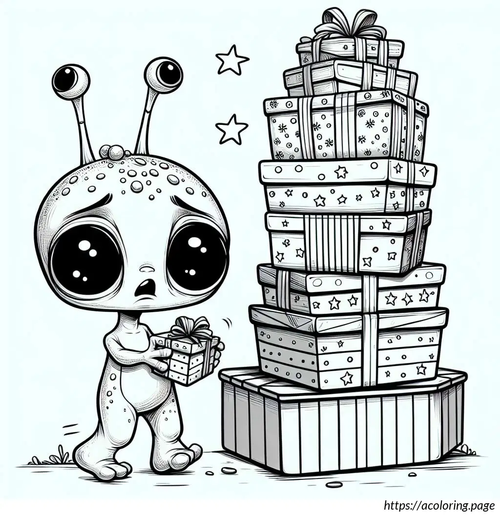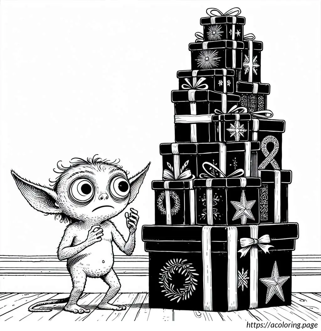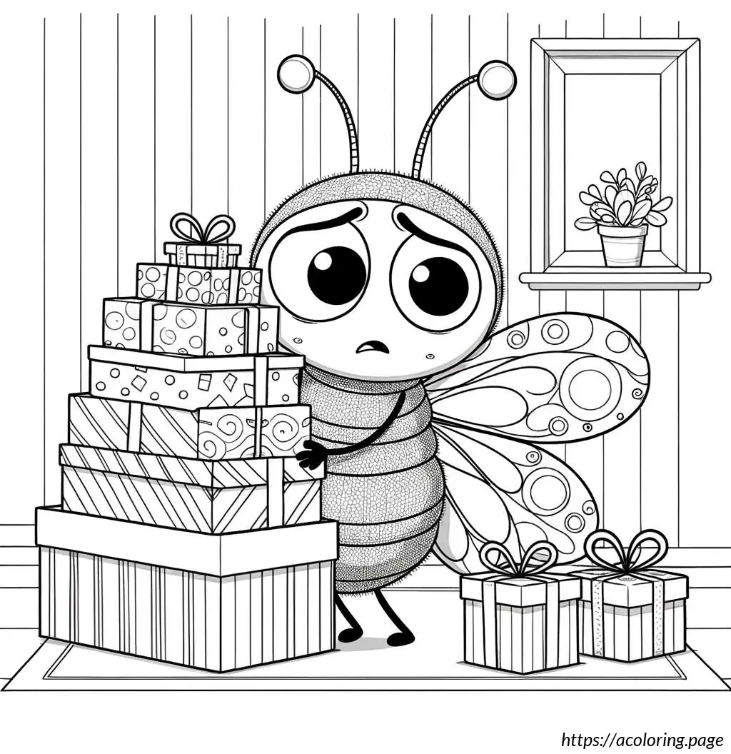 The image depicts a cartoon-style character carrying a large stack of gift boxes. The character appears a bit overwhelmed and is looking upwards with wide eyes towards the top of the stack it’s carrying. It has ant-like antennas and stands upright on two legs. The gift boxes vary in design and size, with features such as stars, dots, and ribbons. The bottom gift box is much larger than the others, adorned with a polka dot pattern, and the box on top has a simple bow. The background shows a simple indoor setting, indicating a room with an implied corner. Overall, it’s a playful illustration, possibly representing the challenges of balancing multiple tasks or responsibilities.