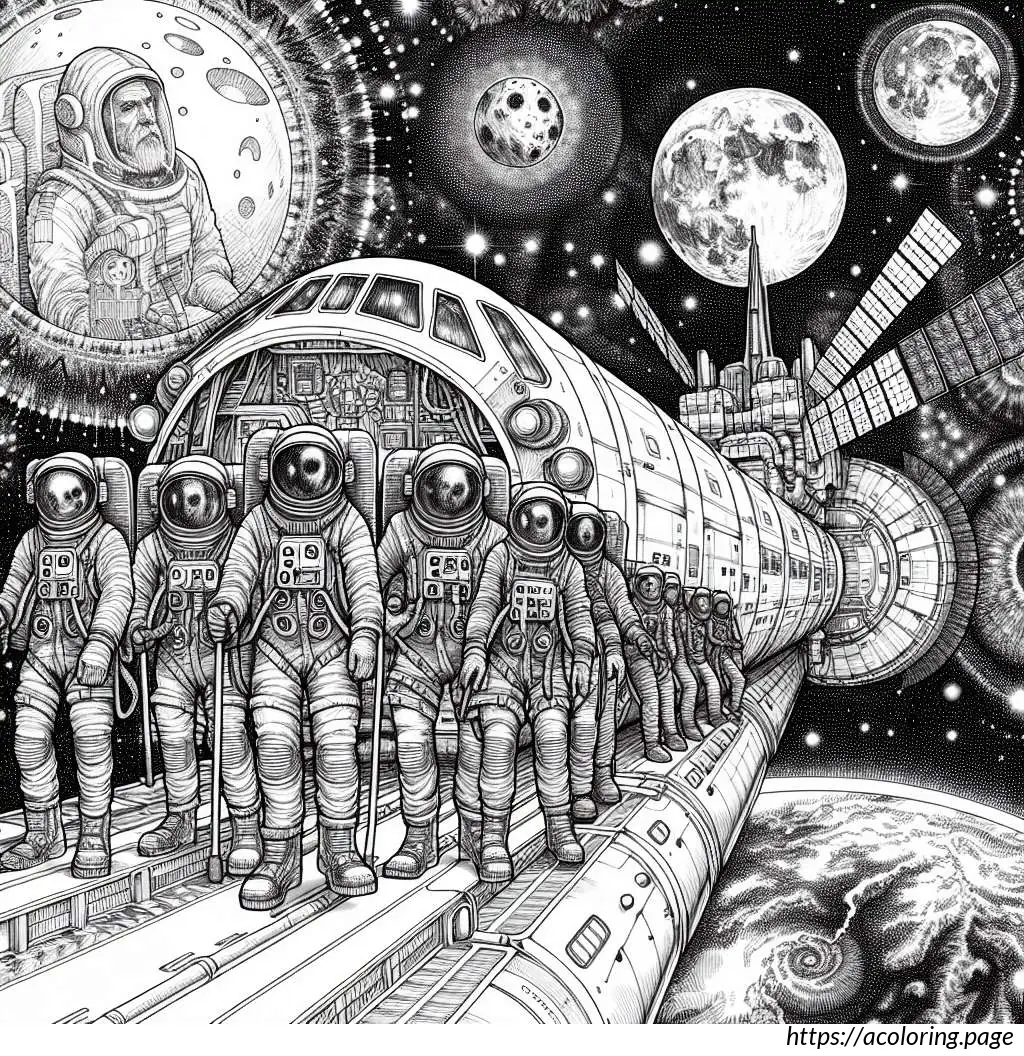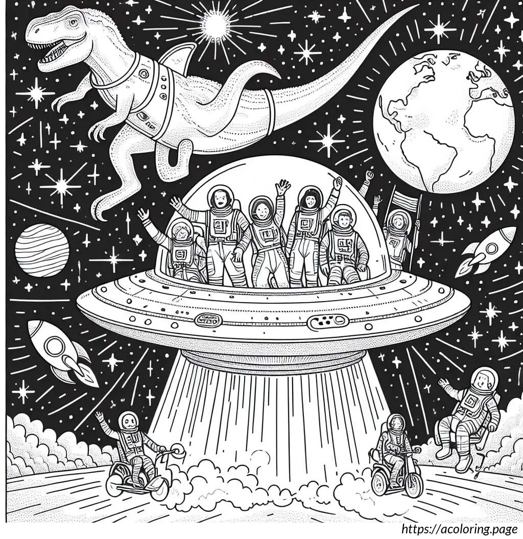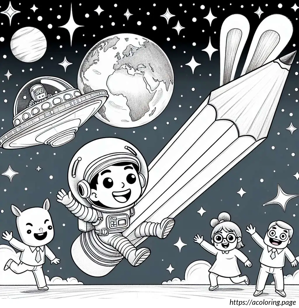 Overall, the illustration presents a playful and imaginative tableau of space travel and adventure, likely designed to engage young audiences in creative coloring and storytelling.