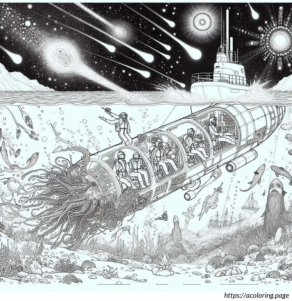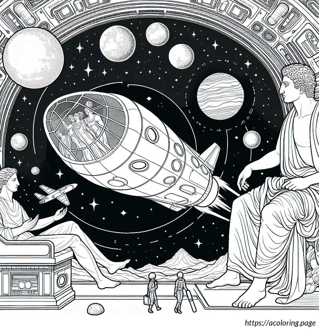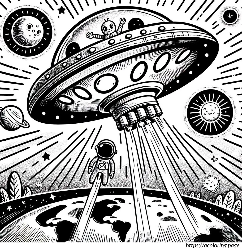 Overall, the illustration presents a playful and imaginative tableau of space travel and adventure, likely designed to engage young audiences in creative coloring and storytelling.