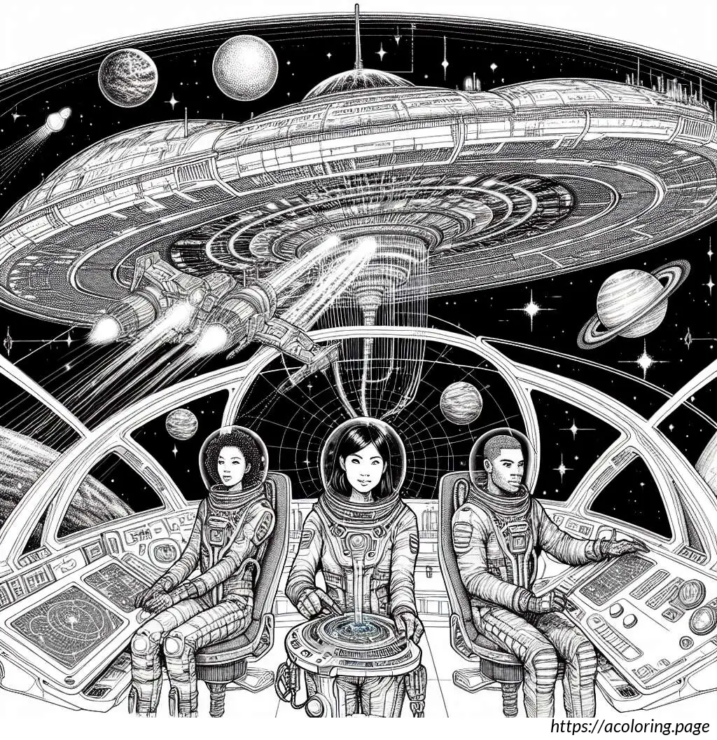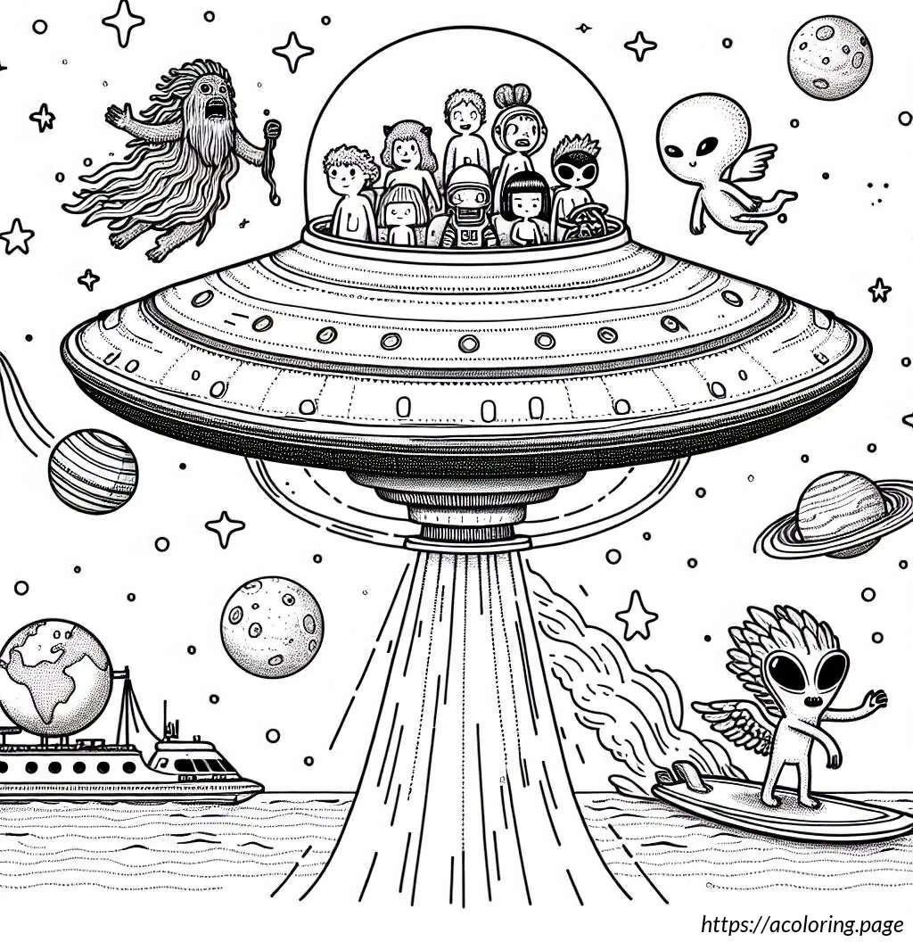 This image depicts an outer space scene composed primarily of line drawings suitable for coloring. It features a large spacecraft shaped like a saucer, controlled by a group of cheerful, cartoon-style characters. These characters include a mix of humans and an alien, identifiable by its larger head and different facial features. The craft emits a trail of exhaust behind it, indicating motion.