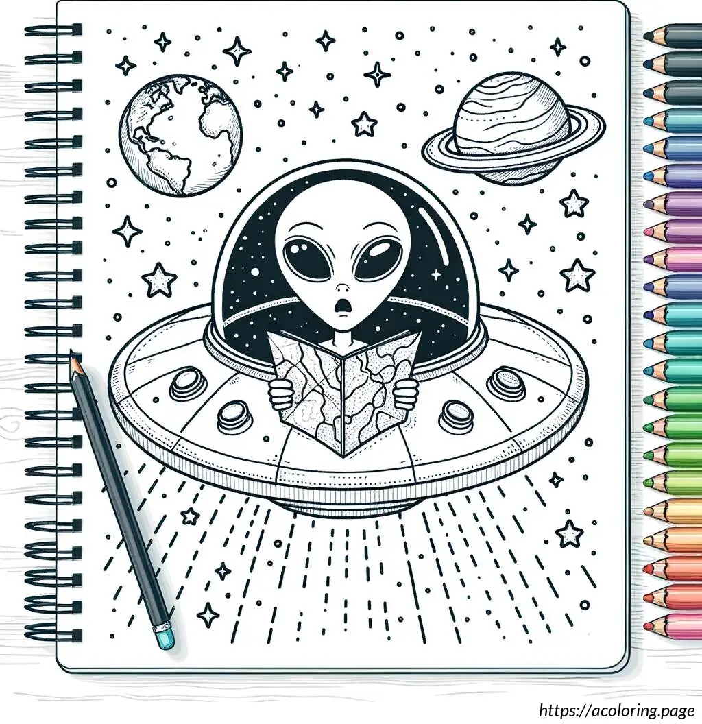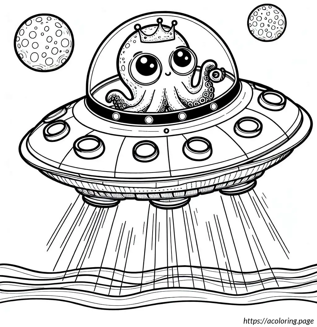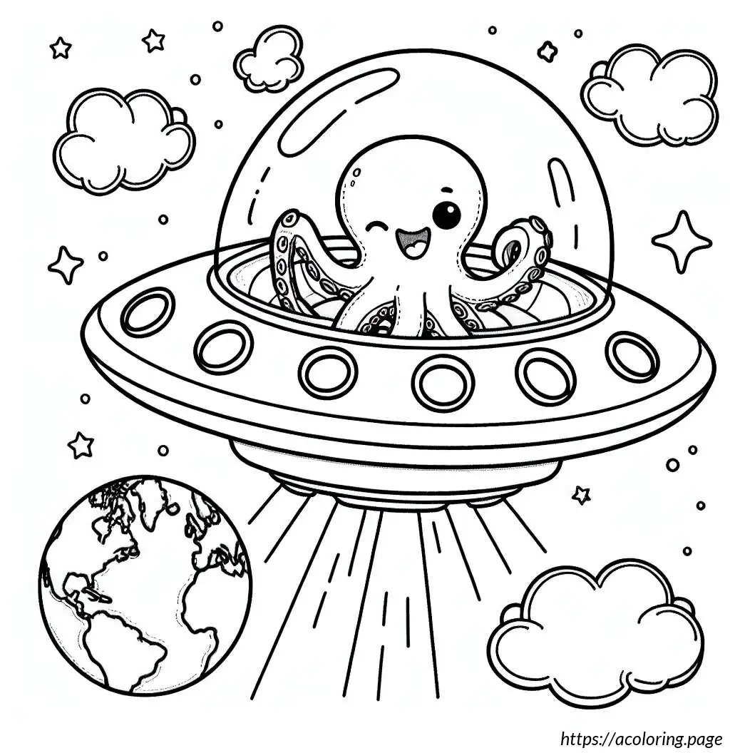 The image depicts a whimsical scene involving an octopus piloting a UFO-shaped spacecraft above a stylized Earth in the background. The octopus, which appears surprised or excited, is holding a map, suggesting it might be navigating or exploring. The spacecraft features several round windows or ports, giving it a classic UFO look.