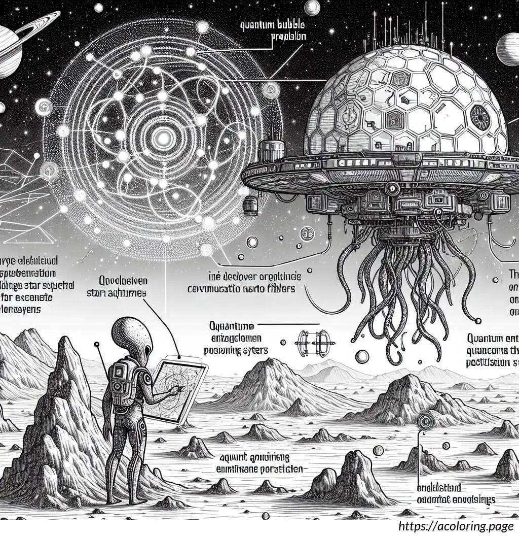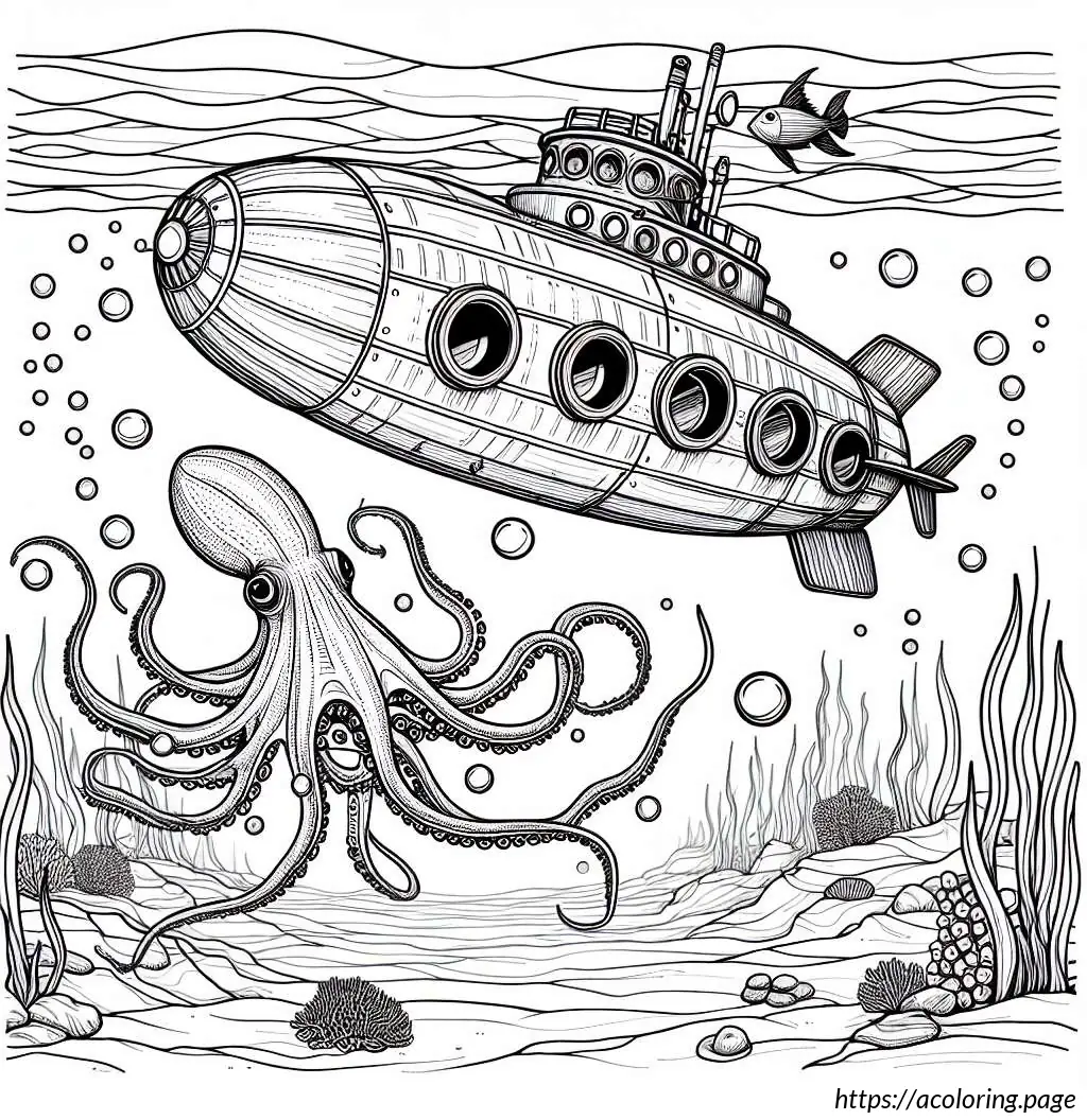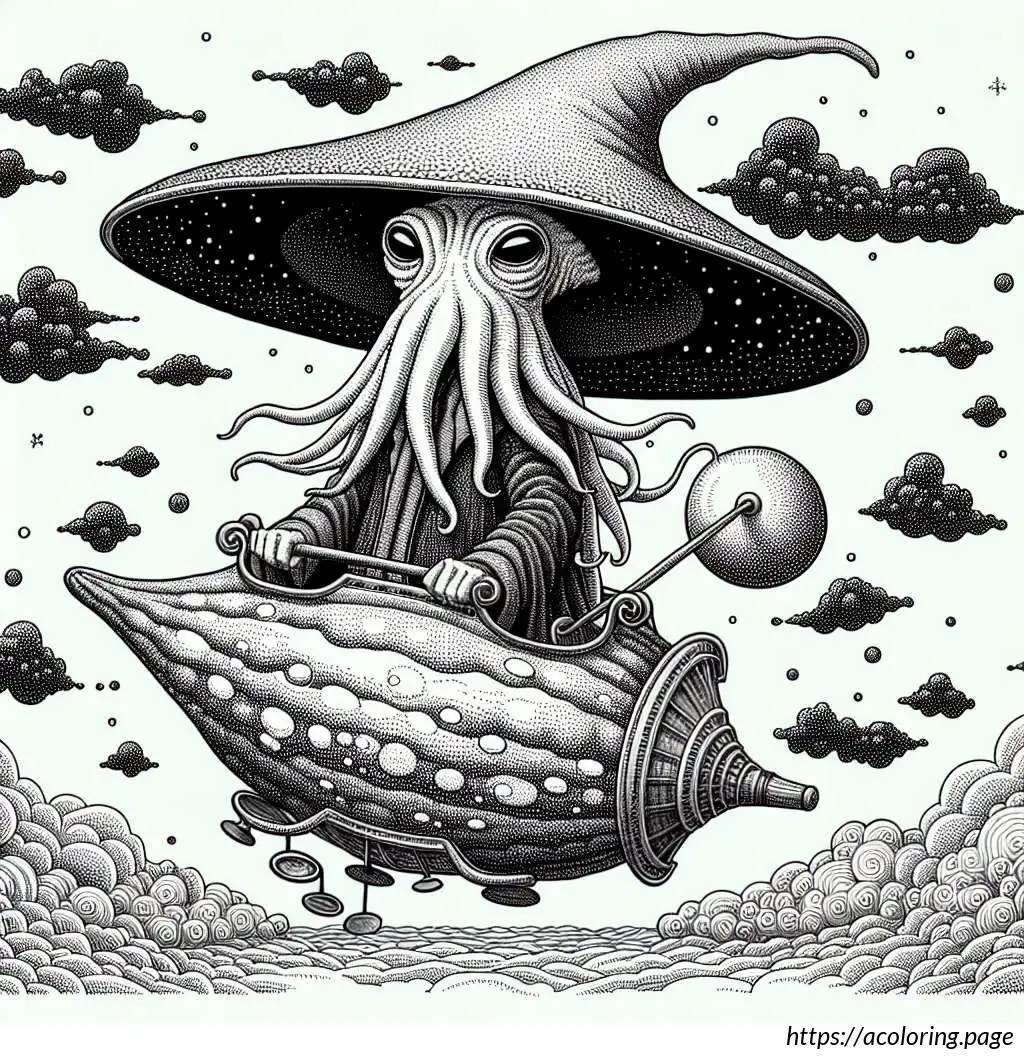 The image depicts a whimsical scene involving an octopus piloting a UFO-shaped spacecraft above a stylized Earth in the background. The octopus, which appears surprised or excited, is holding a map, suggesting it might be navigating or exploring. The spacecraft features several round windows or ports, giving it a classic UFO look.