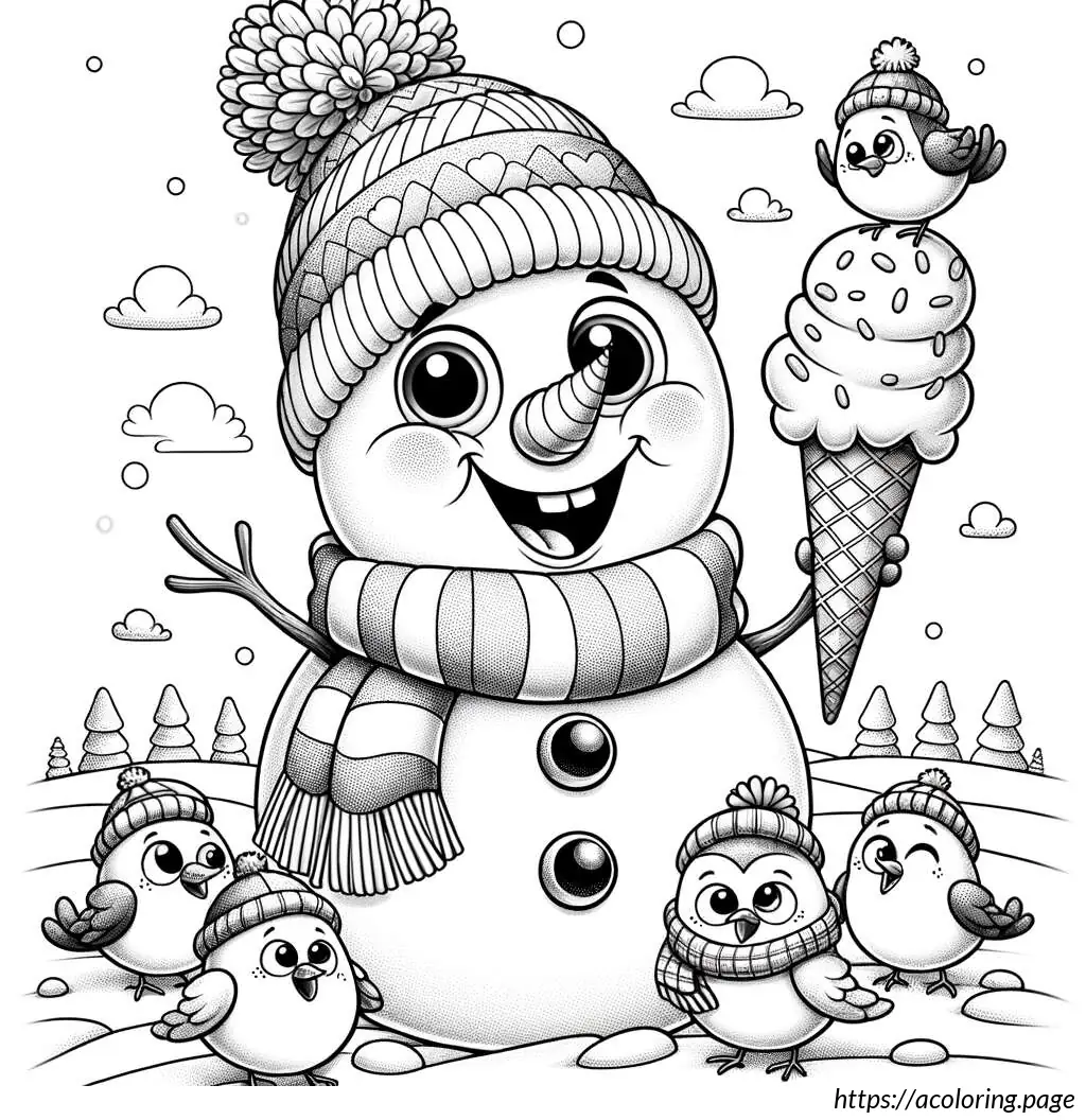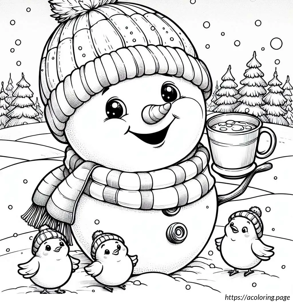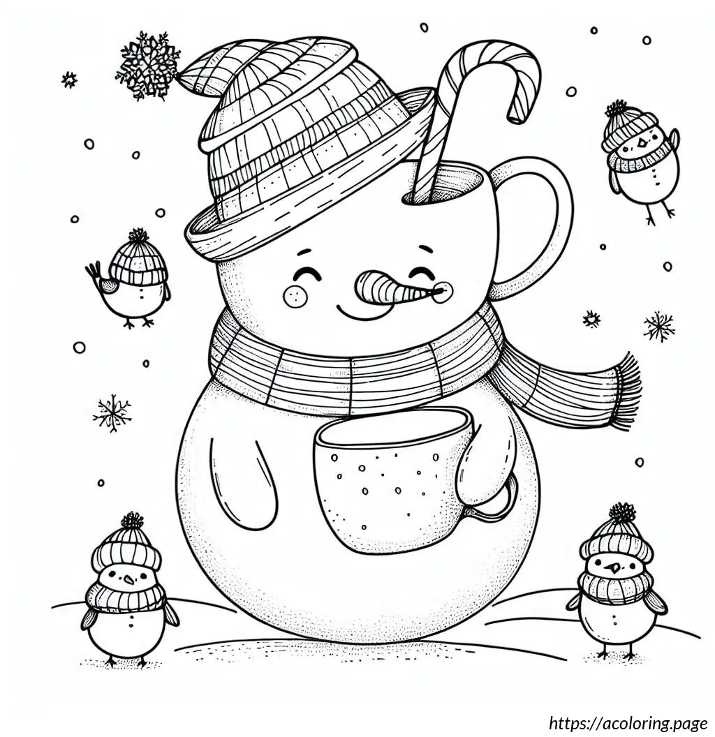This image is a fun, cartoon-style line drawing of a snowman and several small birds. The snowman is depicted with large, friendly eyes and a joyful expression. Its nose resembles an ice cream cone, which adds a whimsical touch. A large coffee cup, designed like a hat, sits atop the snowman’s head. The snowman wears a thick striped scarf around its neck.