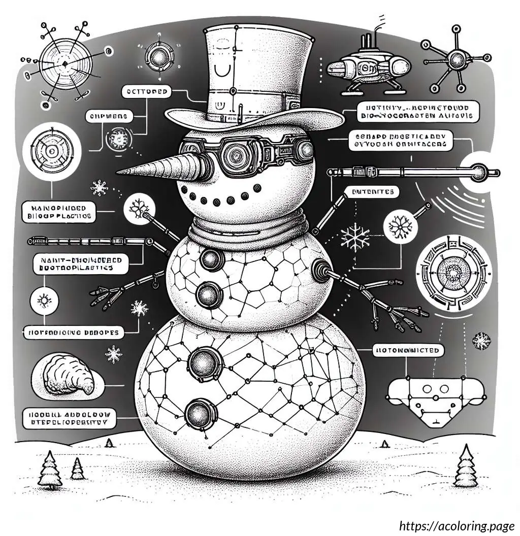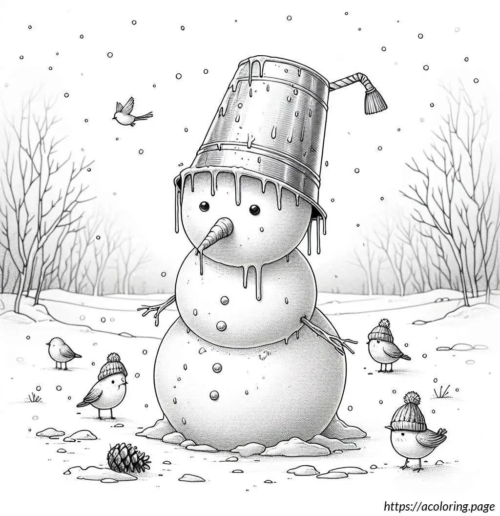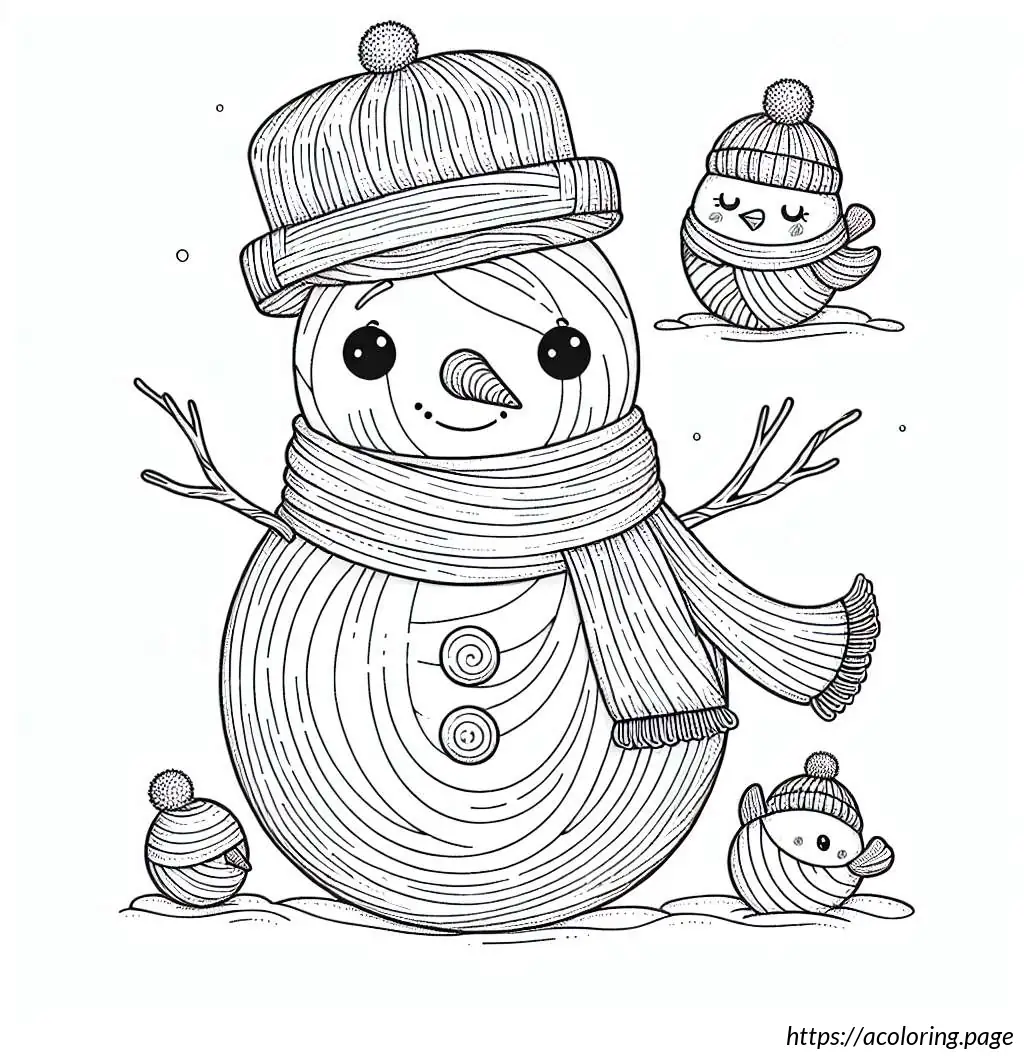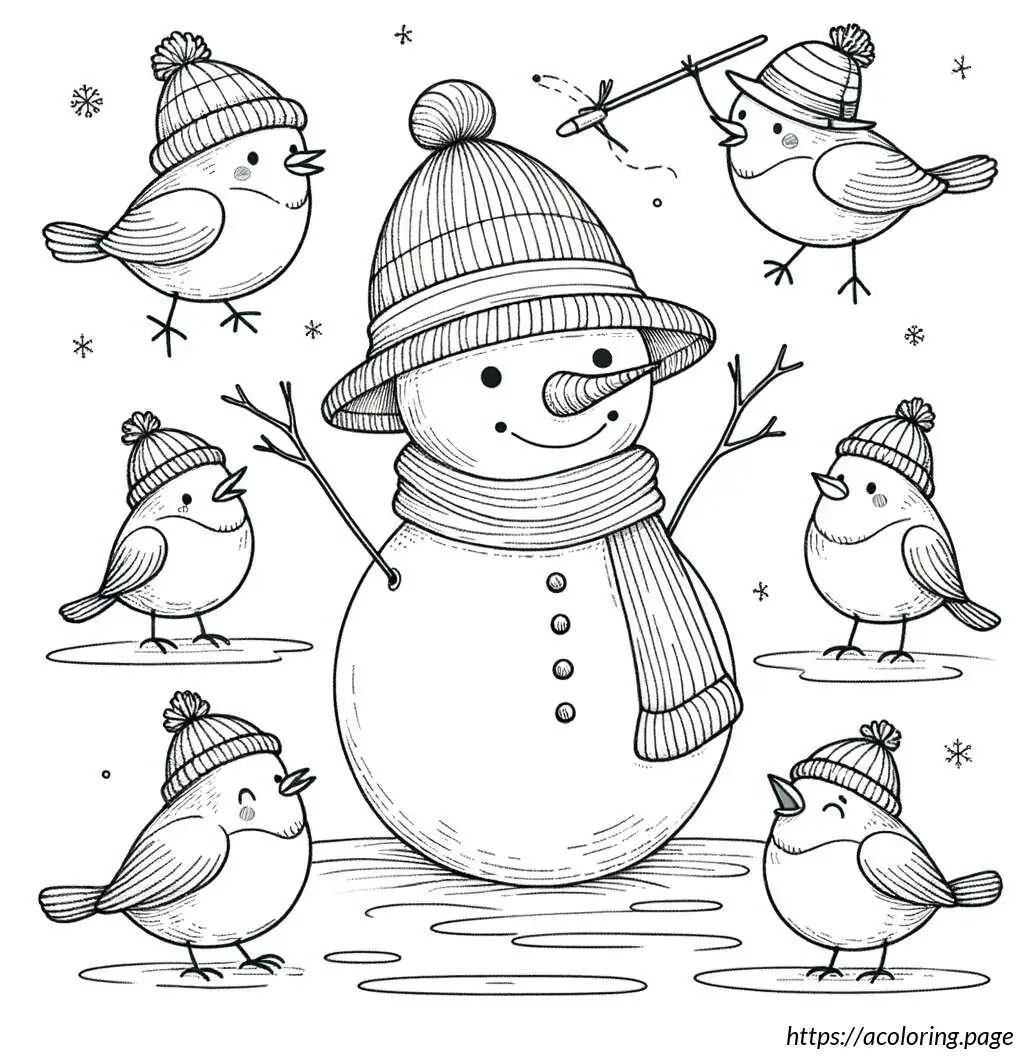This image is a fun, cartoon-style line drawing of a snowman and several small birds. The snowman is depicted with large, friendly eyes and a joyful expression. Its nose resembles an ice cream cone, which adds a whimsical touch. A large coffee cup, designed like a hat, sits atop the snowman’s head. The snowman wears a thick striped scarf around its neck.