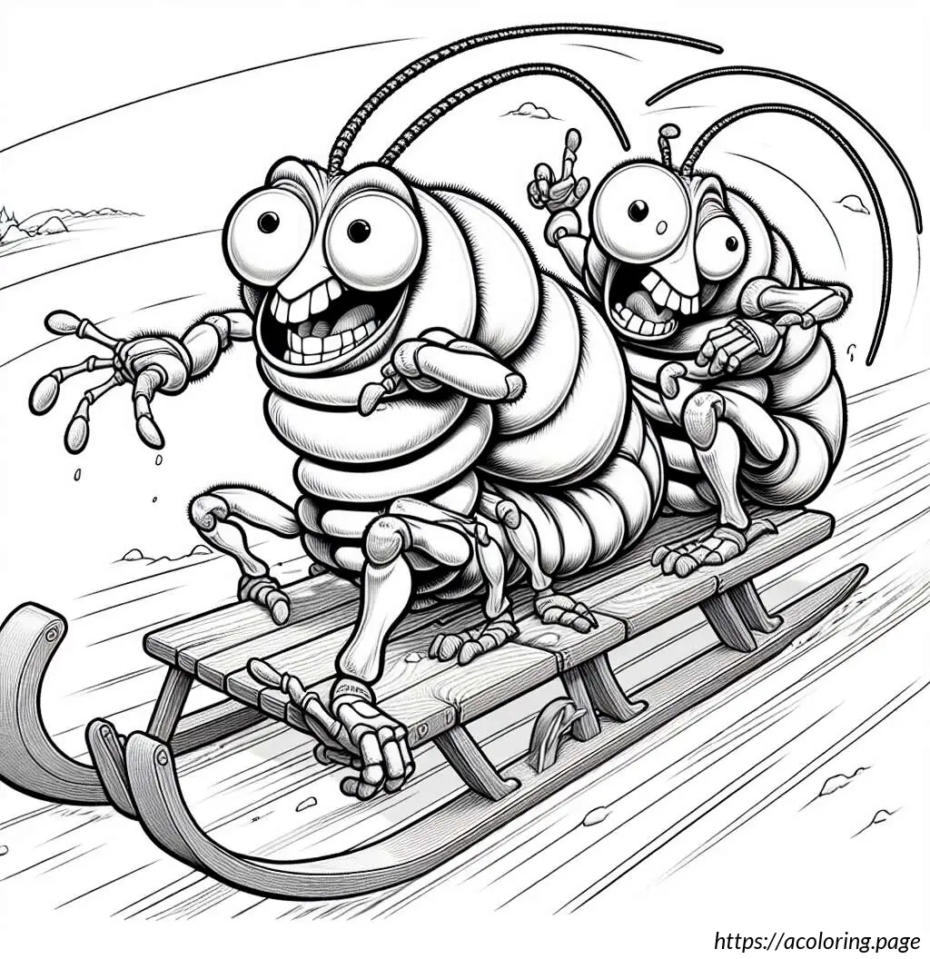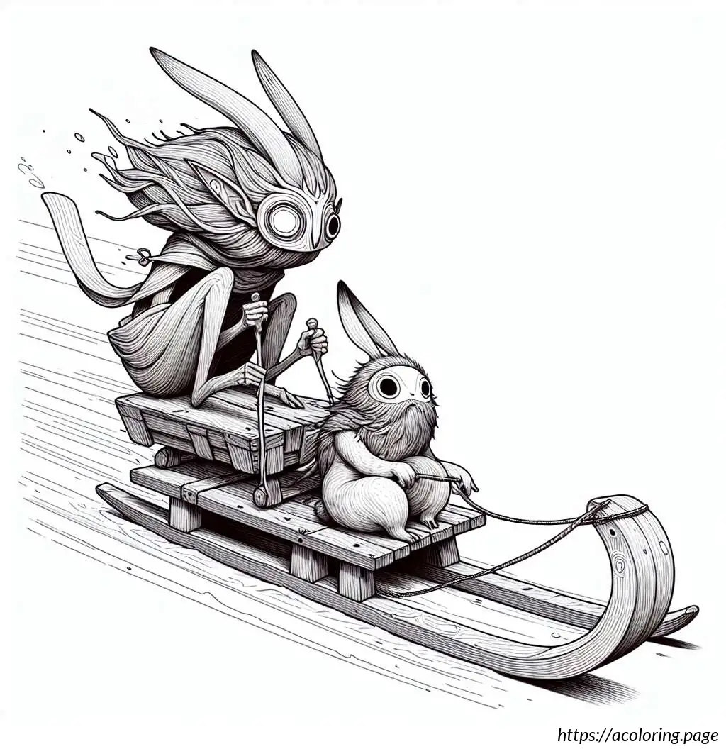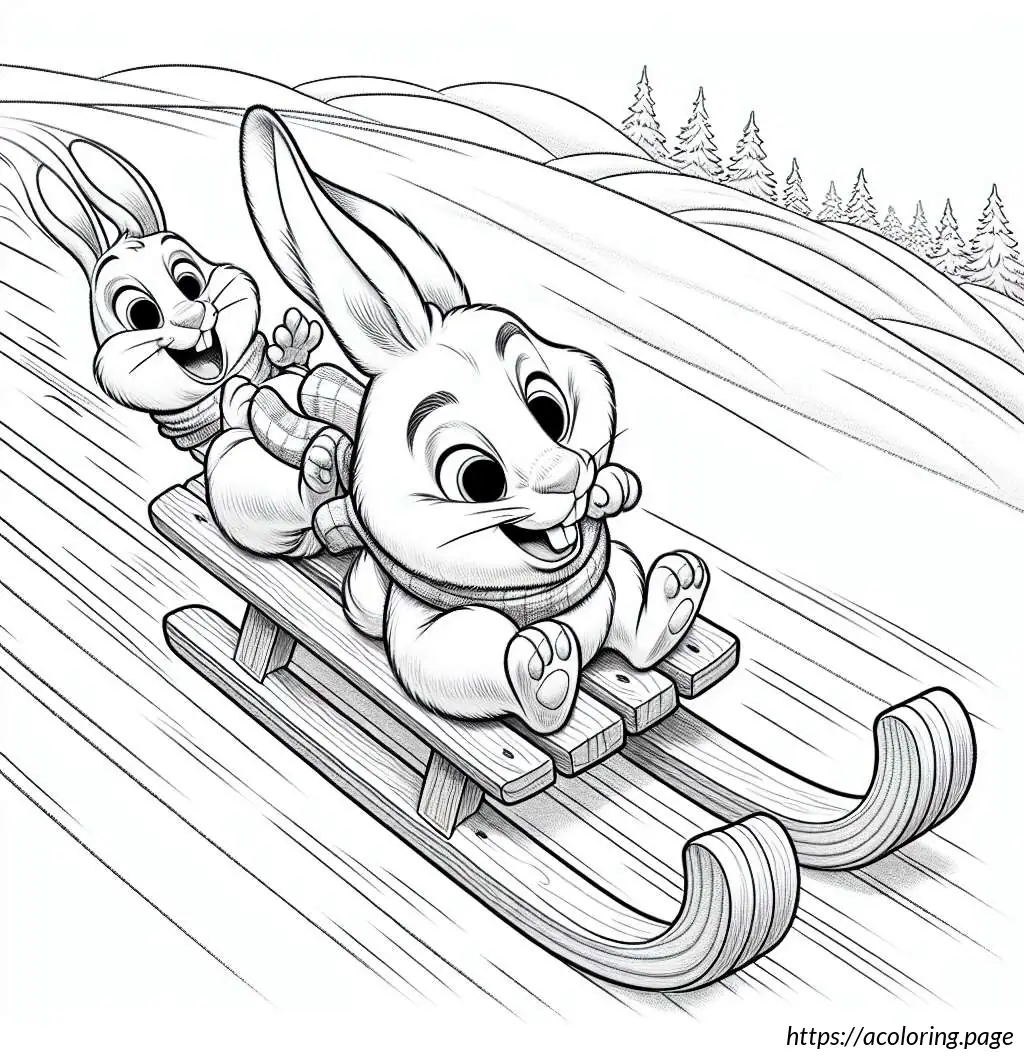 The image depicts two cartoon rabbits enjoying a sled ride. The sled, which is made of wooden slats and has curved runners for sliding on snow, is shown speeding downhill, as evident from the motion lines trailing behind it. The rabbit in the front appears quite excited or perhaps a bit startled, as indicated by its wide-open eyes and mouth in an enthusiastic expression. It holds onto the front bar of the sled with one hand raised as if experiencing an adrenaline rush. The second rabbit, seated behind the first, also shows an expression of thrill or surprise, holding onto the first rabbit with one arm for support. Both rabbits have prominent eyes and oversized front teeth, adding to their animated and humorous appearance. The slope they are descending is depicted by a simple, wavy line in the background. Overall, the image projects a sense of dynamic motion and winter fun.