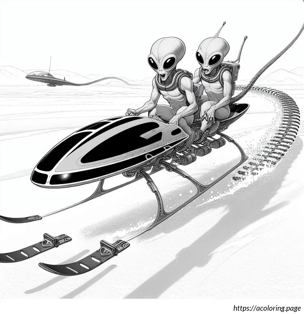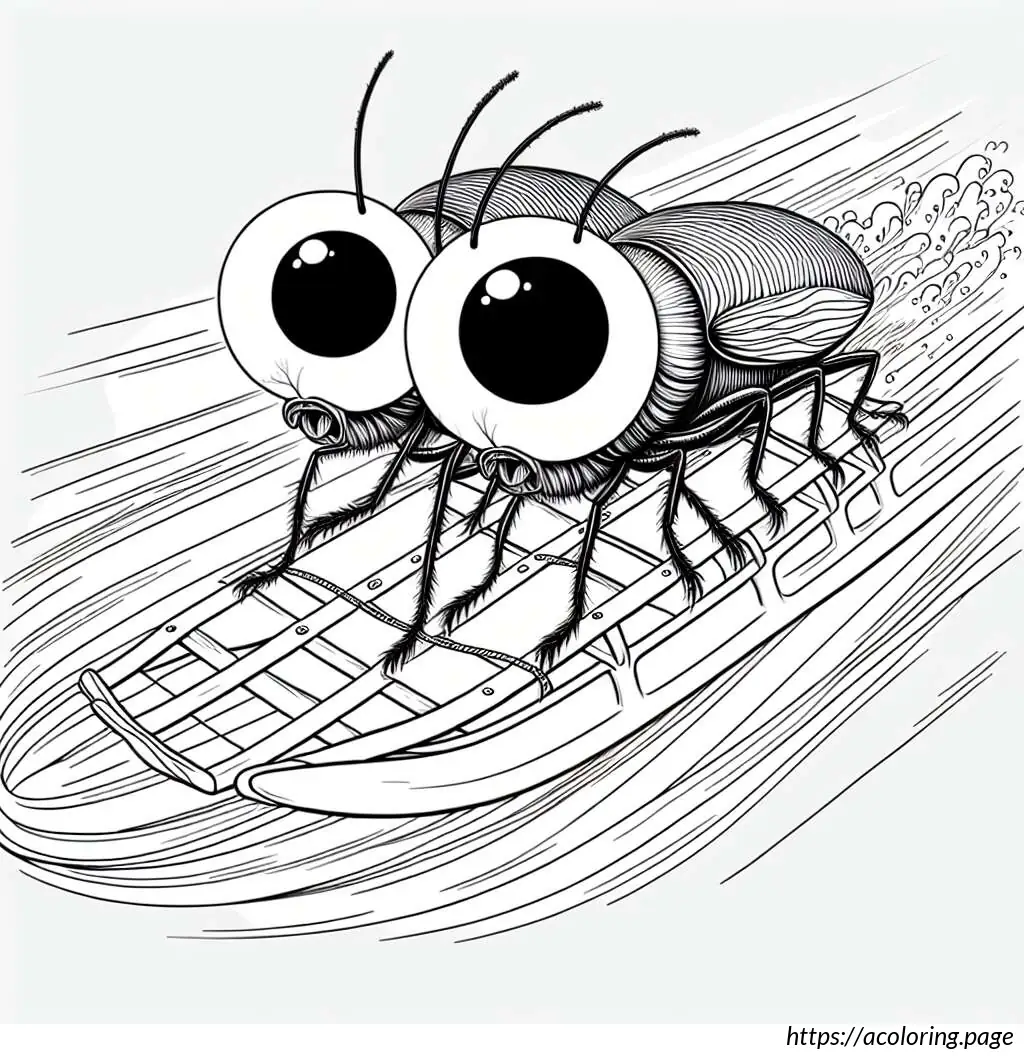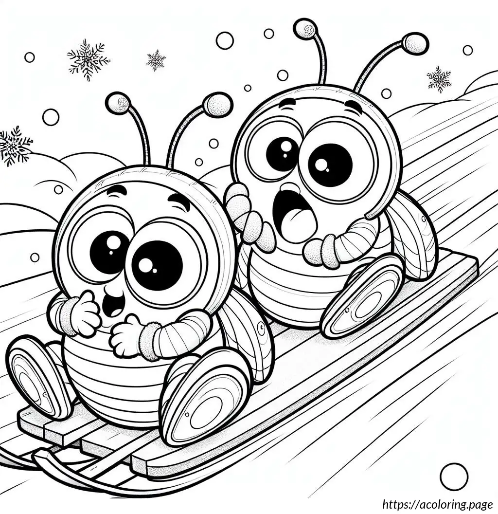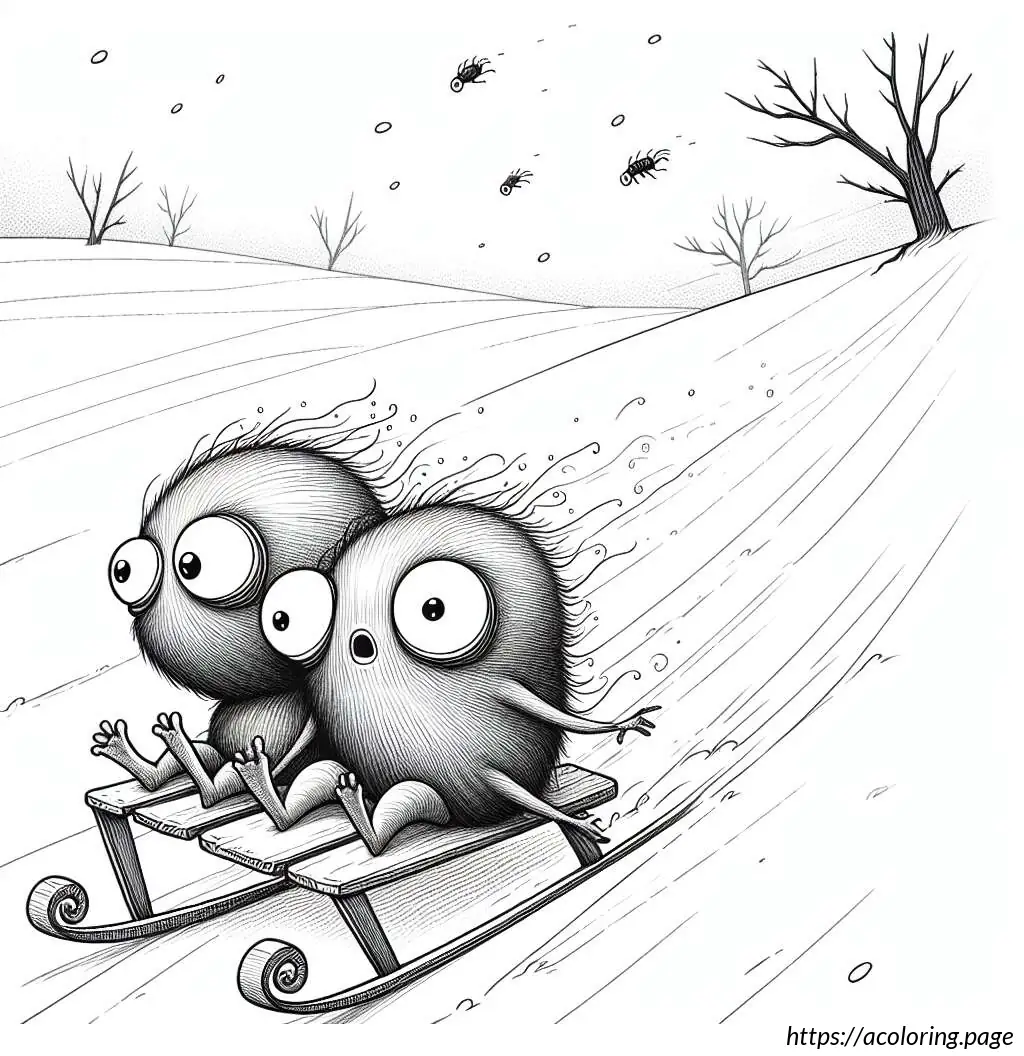 The image depicts two cartoon rabbits enjoying a sled ride. The sled, which is made of wooden slats and has curved runners for sliding on snow, is shown speeding downhill, as evident from the motion lines trailing behind it. The rabbit in the front appears quite excited or perhaps a bit startled, as indicated by its wide-open eyes and mouth in an enthusiastic expression. It holds onto the front bar of the sled with one hand raised as if experiencing an adrenaline rush. The second rabbit, seated behind the first, also shows an expression of thrill or surprise, holding onto the first rabbit with one arm for support. Both rabbits have prominent eyes and oversized front teeth, adding to their animated and humorous appearance. The slope they are descending is depicted by a simple, wavy line in the background. Overall, the image projects a sense of dynamic motion and winter fun.