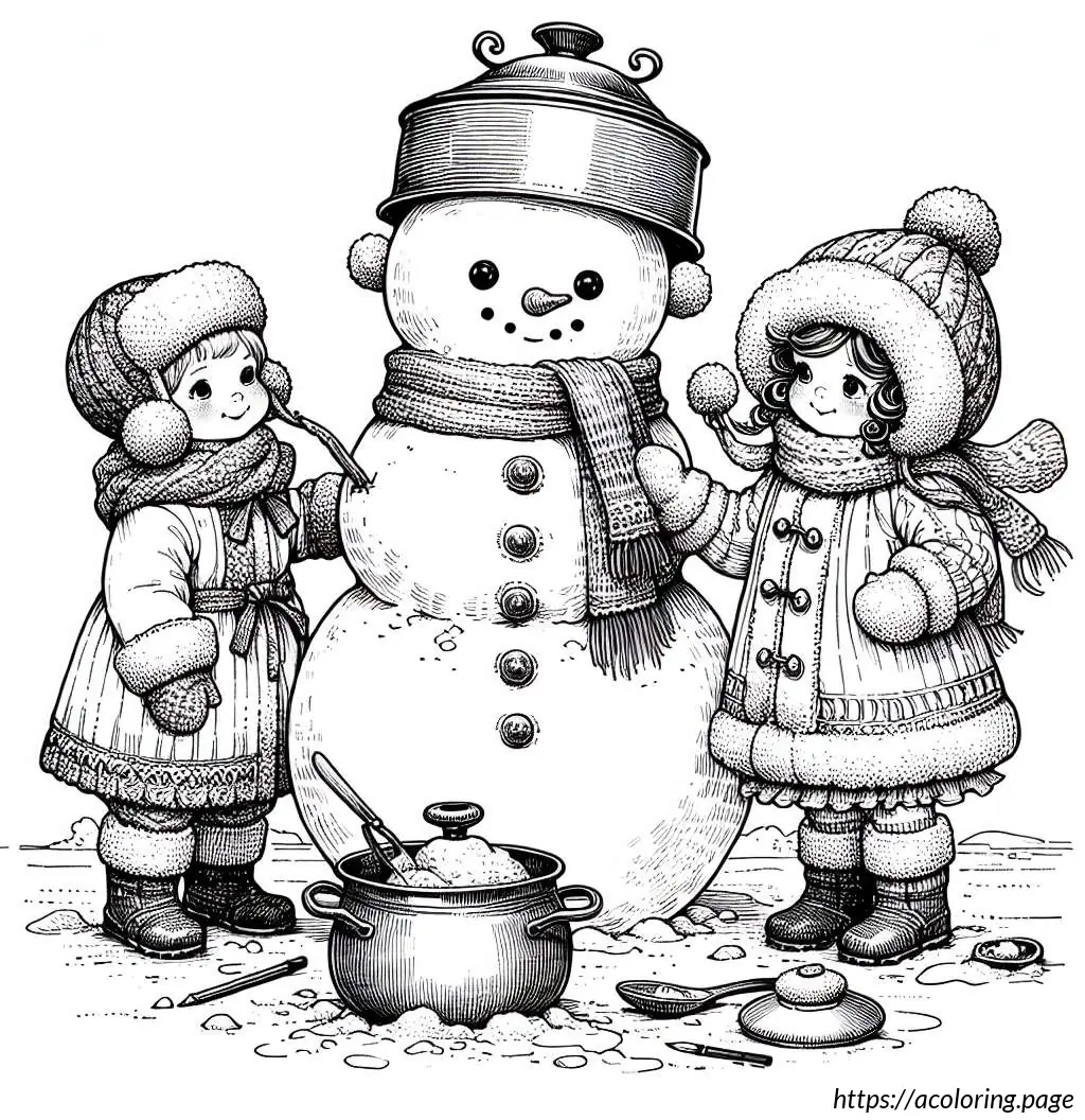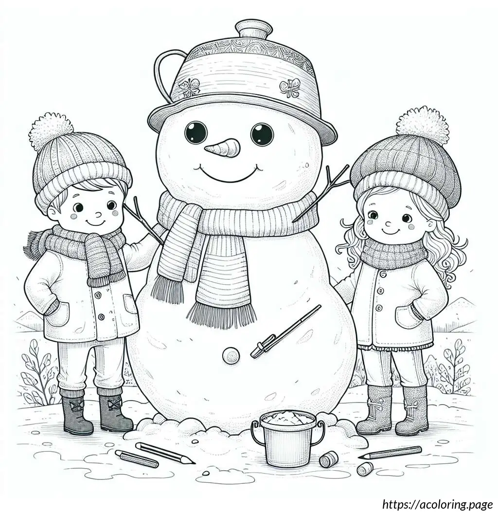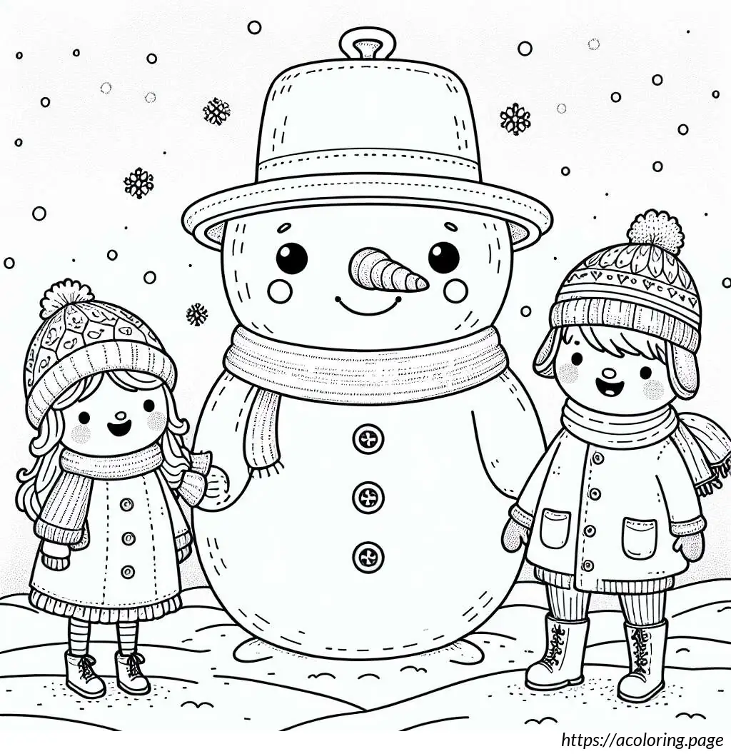 This is a black-and-white line drawing of three children standing with a large snowman. The snowman is in the center and appears joyful, sporting a wide smile and a carrot nose. It wears a pot as a hat and has buttons down its front.