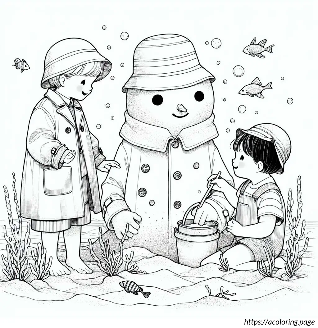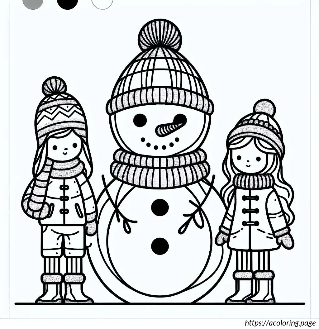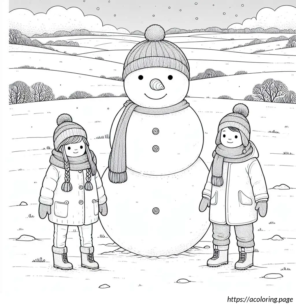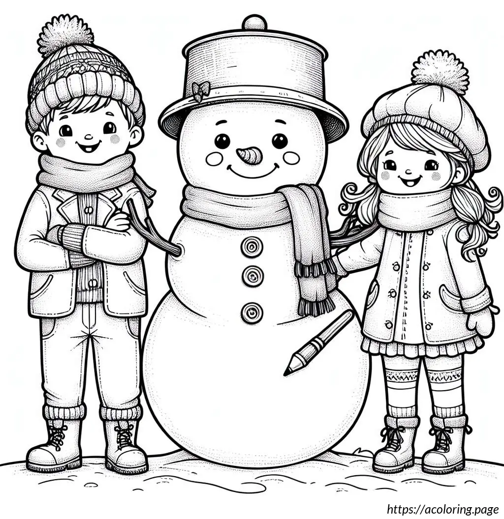 This is a black-and-white line drawing of three children standing with a large snowman. The snowman is in the center and appears joyful, sporting a wide smile and a carrot nose. It wears a pot as a hat and has buttons down its front.