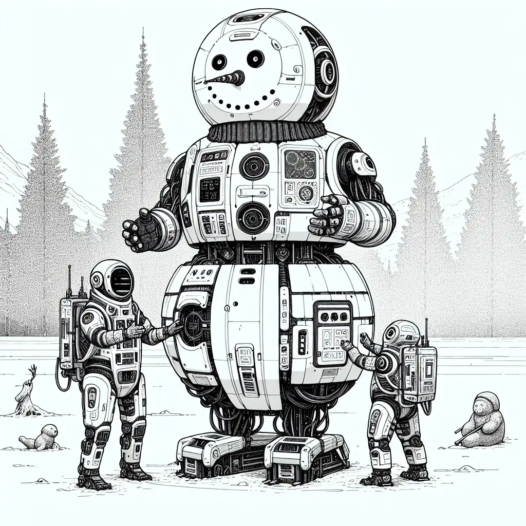 The background of the image is plain with a slightly wavy line along the bottom, suggesting the snow-covered ground. The drawing style is cartoonish and friendly, appealing to children. This image is likely designed for coloring activities as indicated by its clear outlines and lack of color.