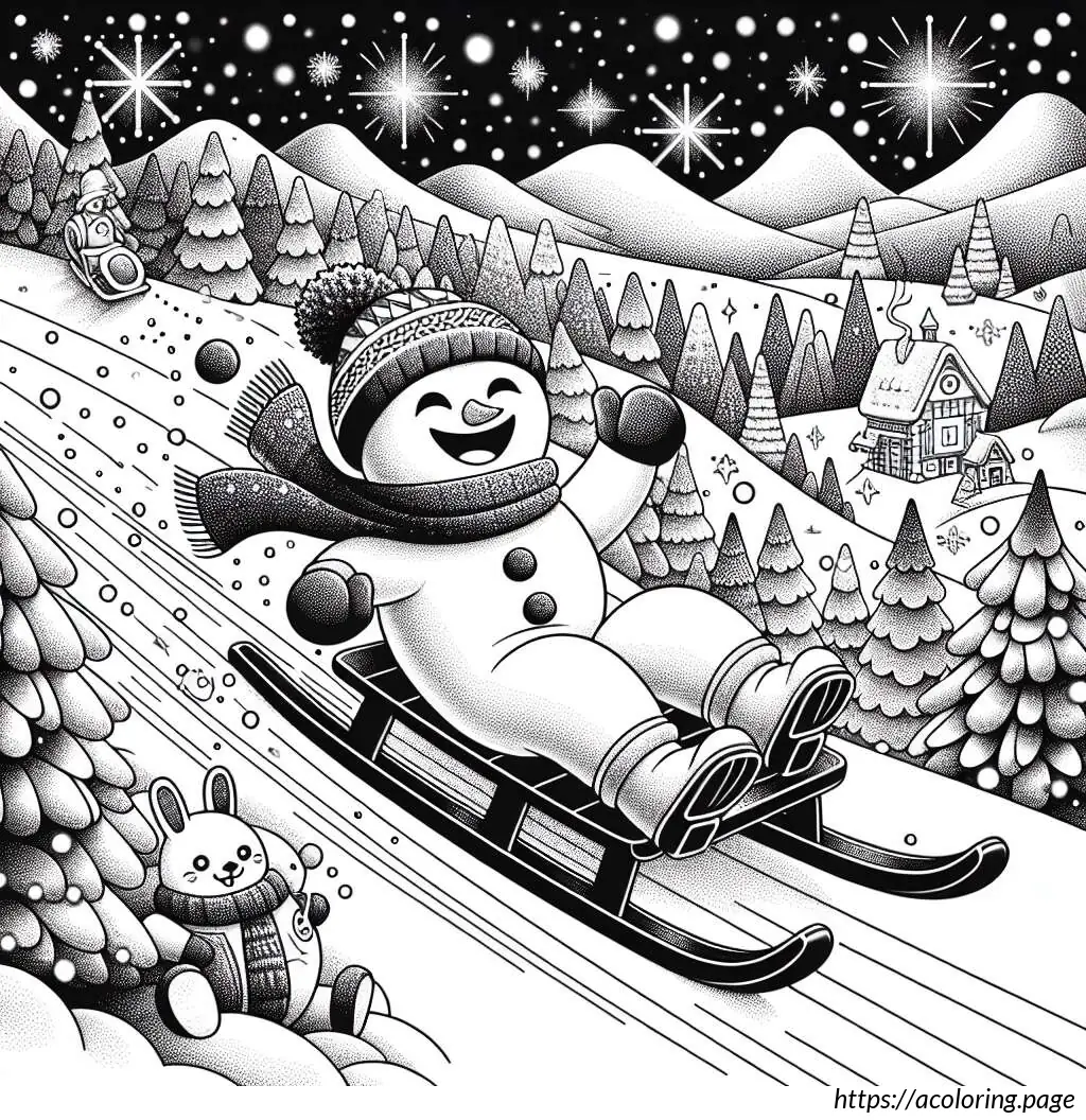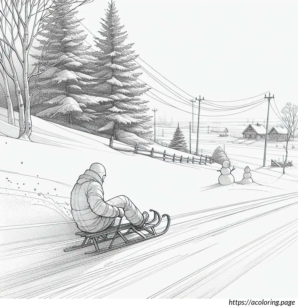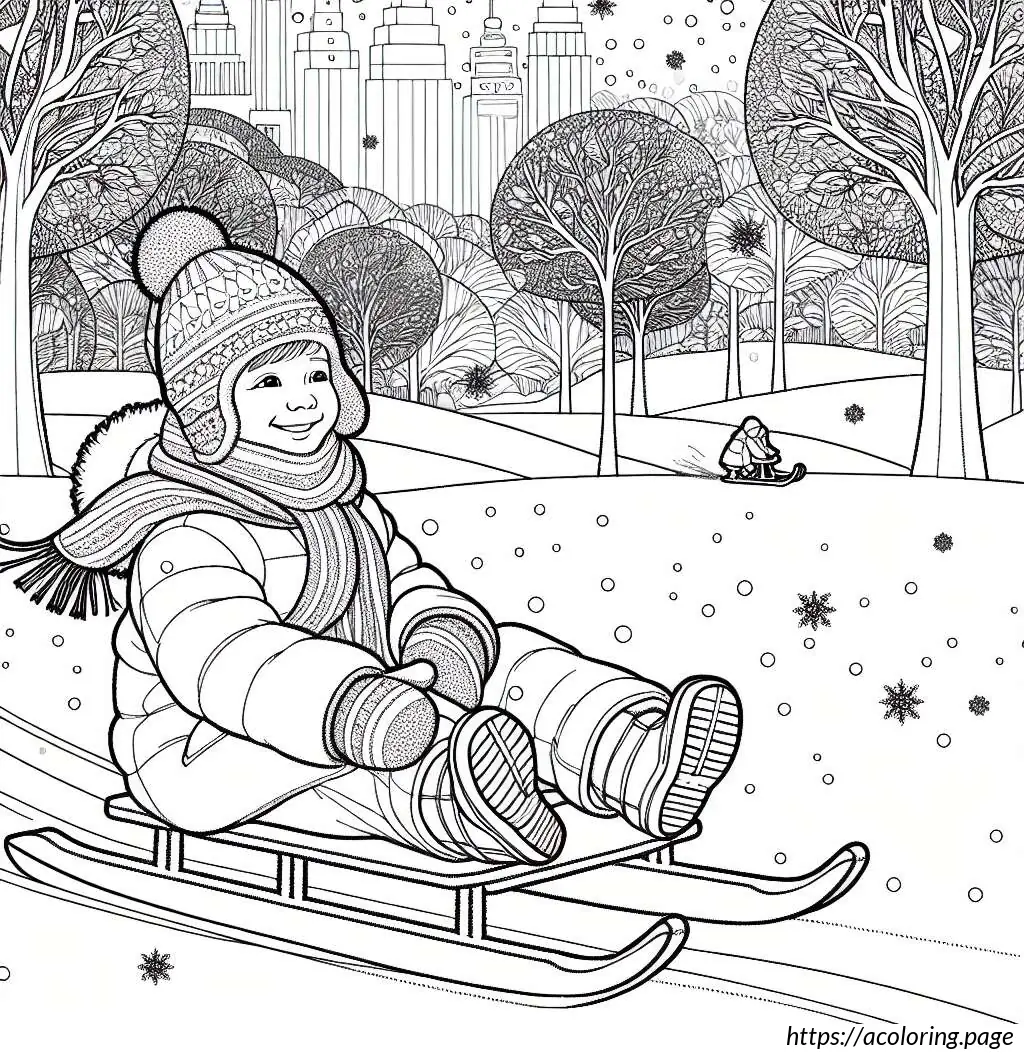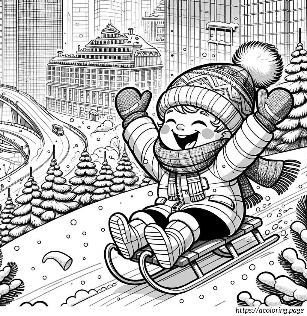 The image is a black and white illustration depicting a playful winter scene. There is a character wearing a hat and mittens, gleefully sliding down a snowy hill on a sled. The character appears joyful, confirmed by their raised arms and happy facial expression. The background features a cityscape with a multi-story building and several pine trees, which are also covered in snow, suggesting a chilly, snowy environment typical of winter. In the foreground, there is a snow-covered staircase, moving from the bottom right to the middle left of the image, which adds depth to the scene. The illustration has a cartoonish art style, emphasizing fun and lightheartedness.