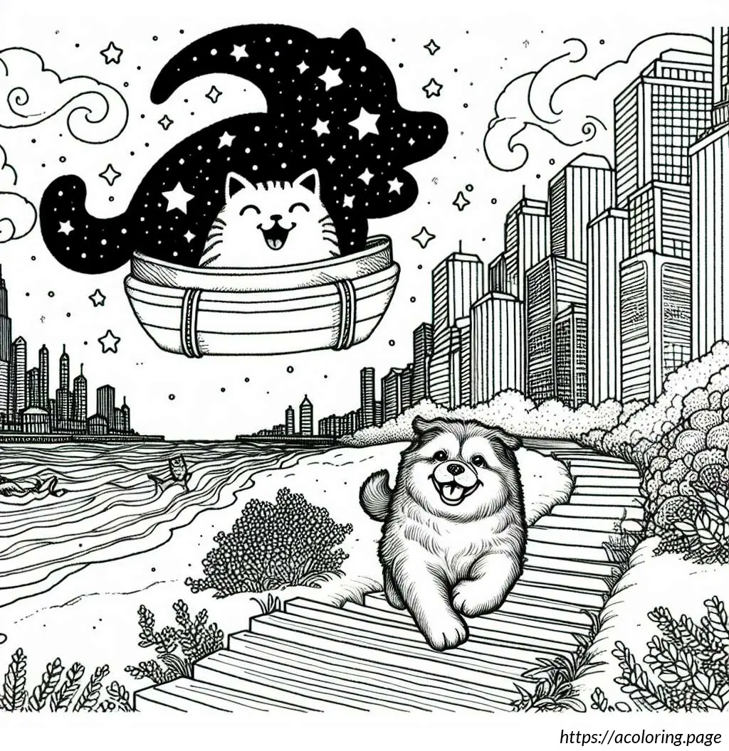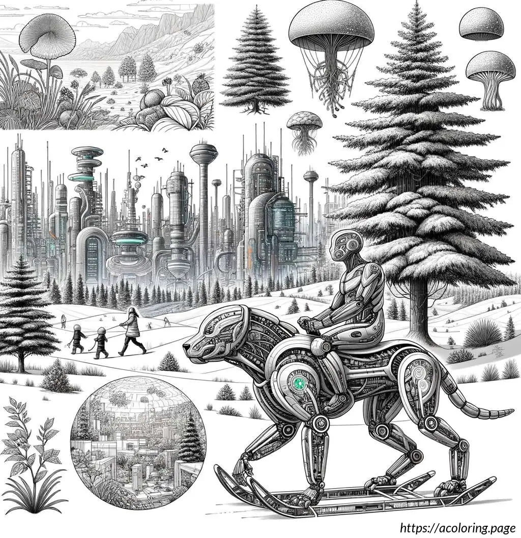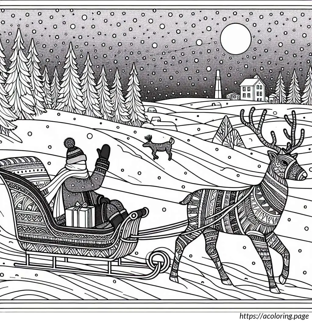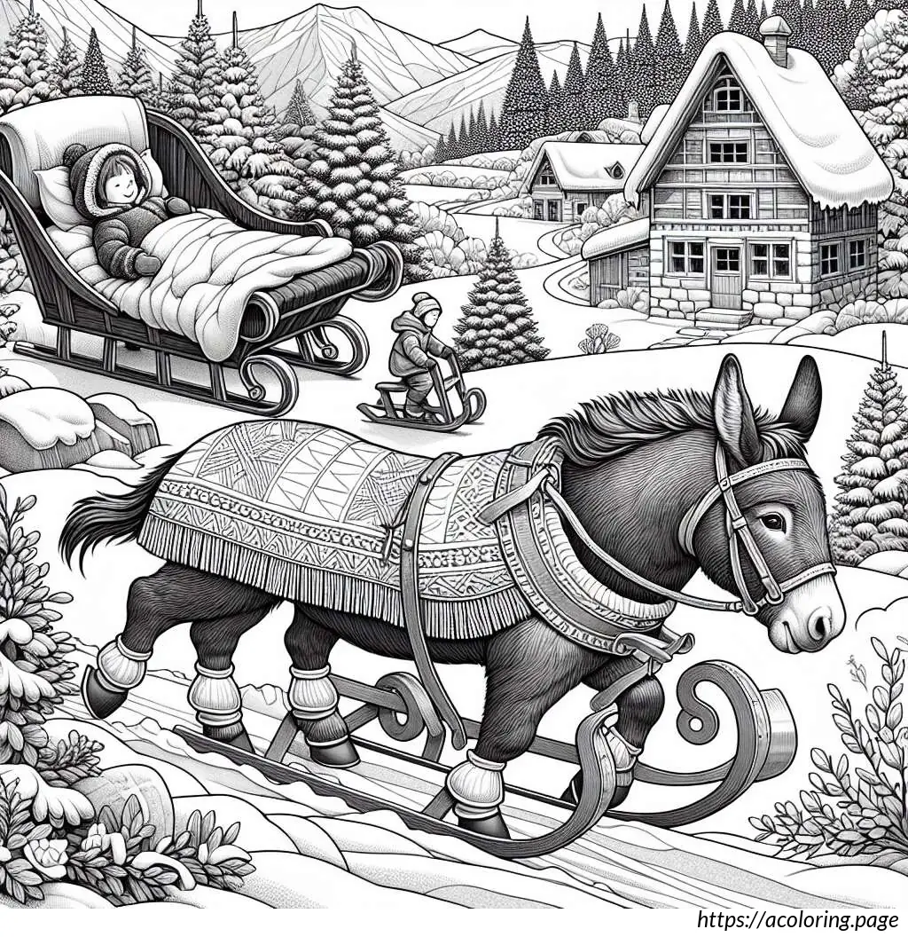 The image is a black and white illustration depicting a playful winter scene. There is a character wearing a hat and mittens, gleefully sliding down a snowy hill on a sled. The character appears joyful, confirmed by their raised arms and happy facial expression. The background features a cityscape with a multi-story building and several pine trees, which are also covered in snow, suggesting a chilly, snowy environment typical of winter. In the foreground, there is a snow-covered staircase, moving from the bottom right to the middle left of the image, which adds depth to the scene. The illustration has a cartoonish art style, emphasizing fun and lightheartedness.