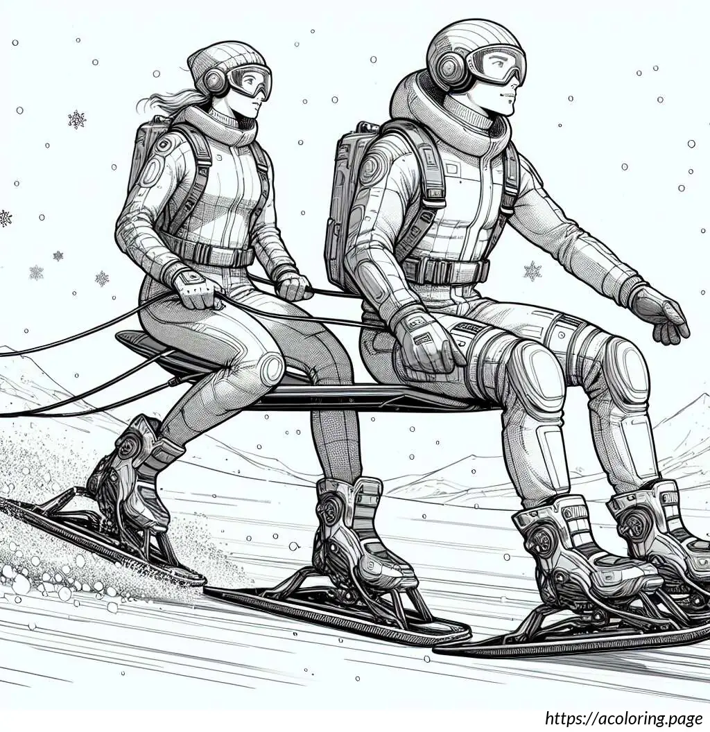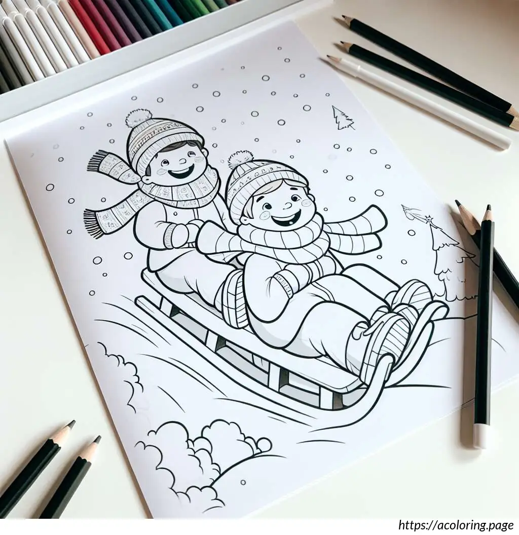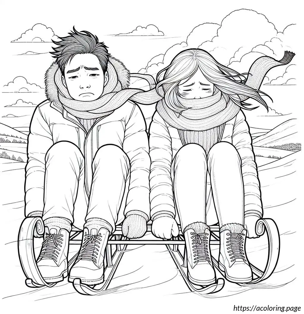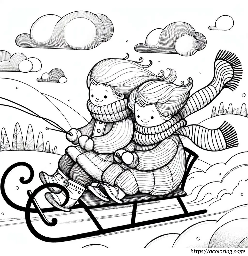 The sled appears to be moving quickly down the hill, which is indicated by the way the characters’ hair and scarves are blown backwards by the movement. Small cloud-like shapes around them suggest a chilly atmosphere, enhancing the feelings of winter and motion. The scene communicates a sense of fun and exhilaration.