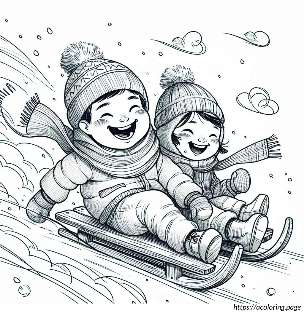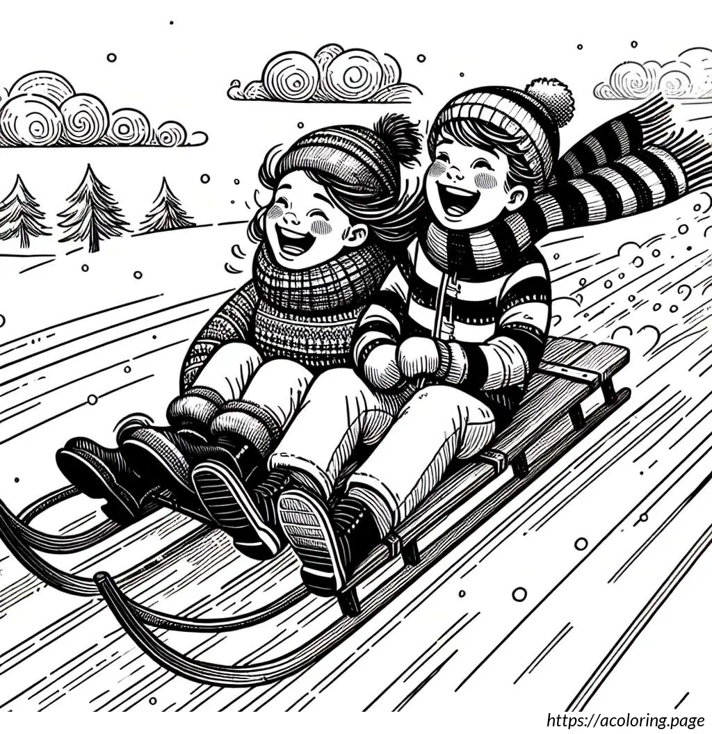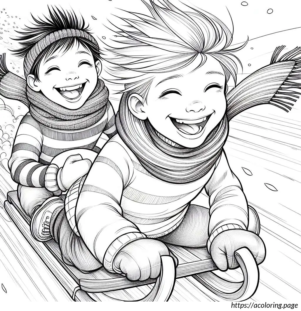 The image is a black and white line drawing of two animated characters, both children, joyfully sledding down a snowy hill. The child in the front has short, spiky hair and is wearing a striped scarf and a turtleneck sweater. This character is smiling broadly, showing excitement with wide eyes and an open mouth. The child in the back has longer, flowing hair that swirls with the motion of the sled, and wears a similar striped scarf and turtleneck sweater. This character is also smiling, with eyes closed and mouth open in laughter.