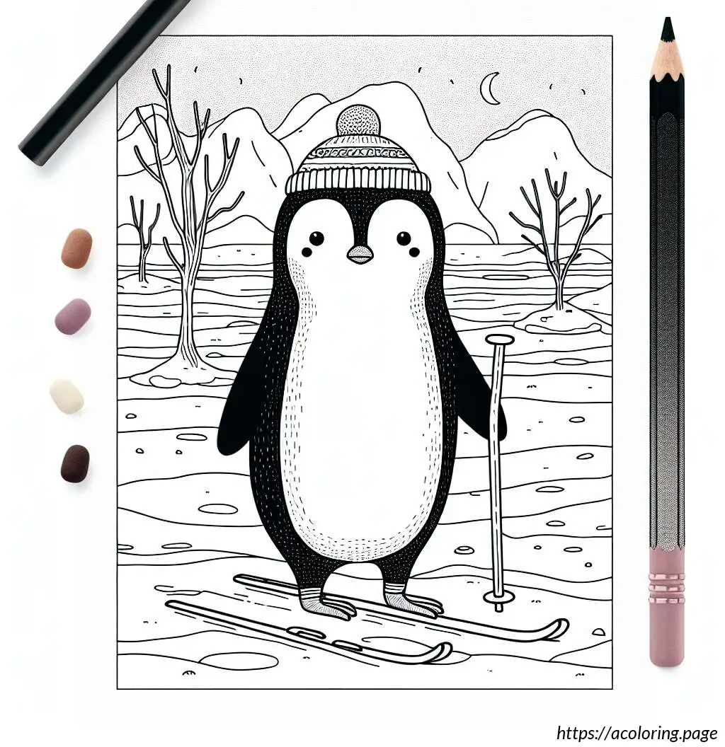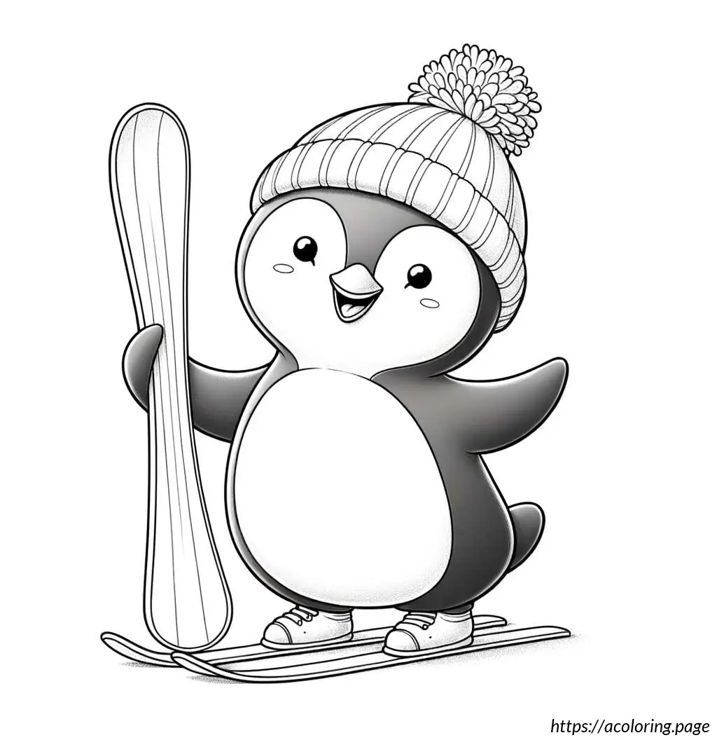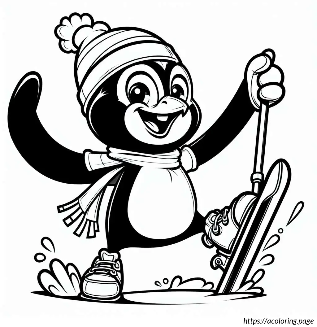 The image shows a cheerful cartoon penguin standing upright and holding what appears to be a ski. The penguin is wearing a Santa hat and has a large, happy smile. There are little motion lines near its head, suggesting it is slightly shaking or excited. It also wears booties on its feet, enhancing the winter or Christmas theme of the illustration. The drawing is done in a simple and clear line art style without color.