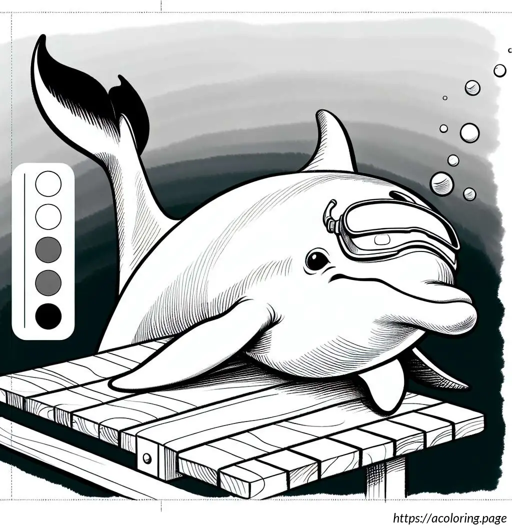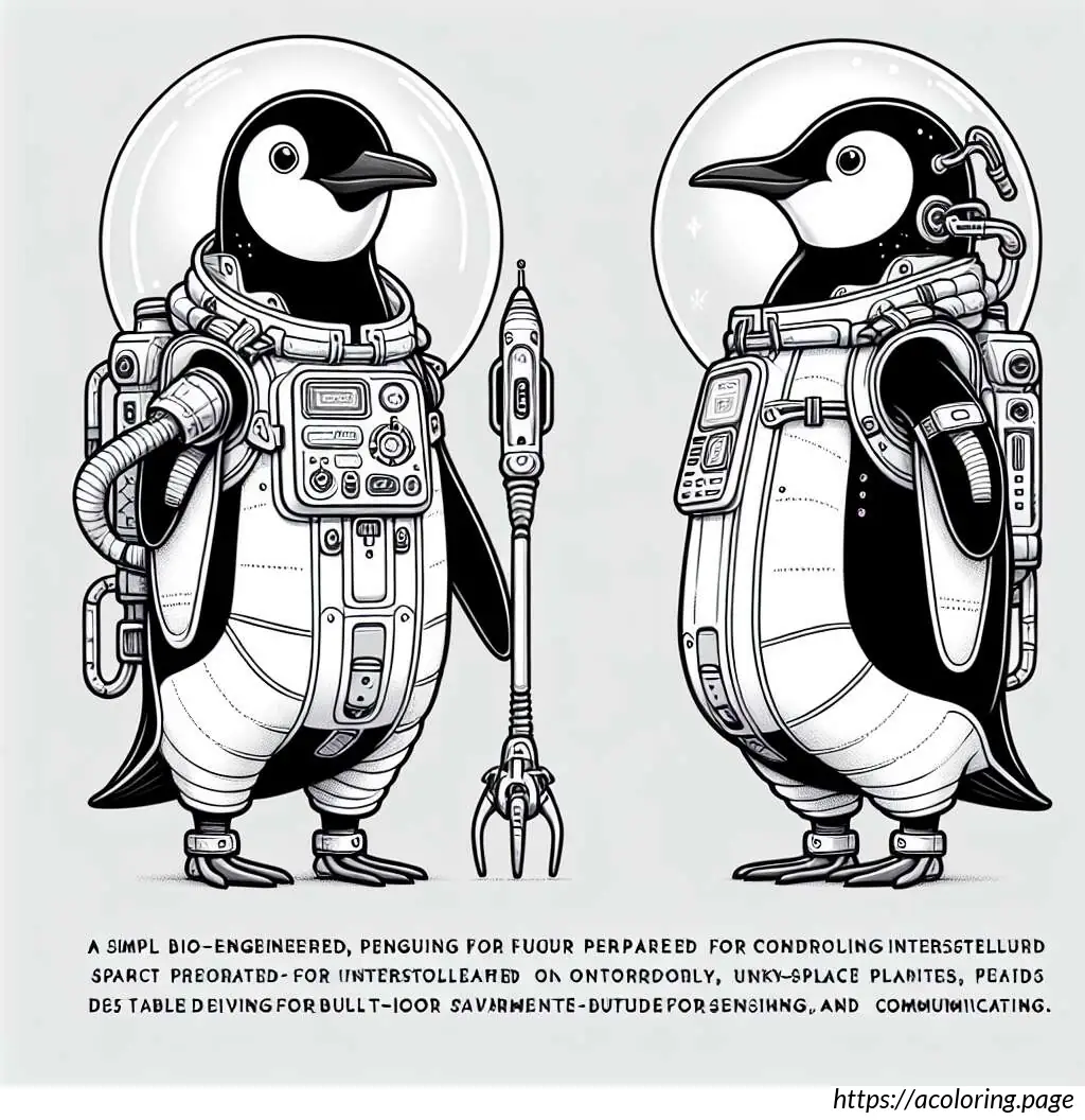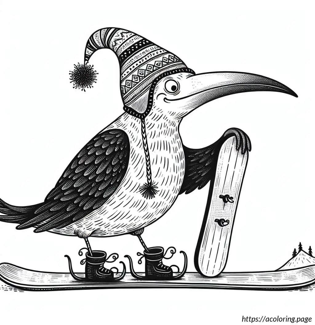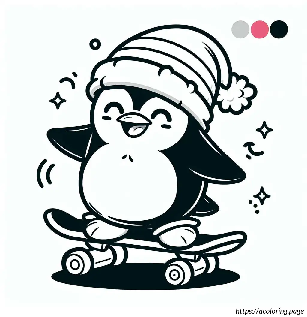The image shows a cheerful cartoon penguin standing upright and holding what appears to be a ski. The penguin is wearing a Santa hat and has a large, happy smile. There are little motion lines near its head, suggesting it is slightly shaking or excited. It also wears booties on its feet, enhancing the winter or Christmas theme of the illustration. The drawing is done in a simple and clear line art style without color.