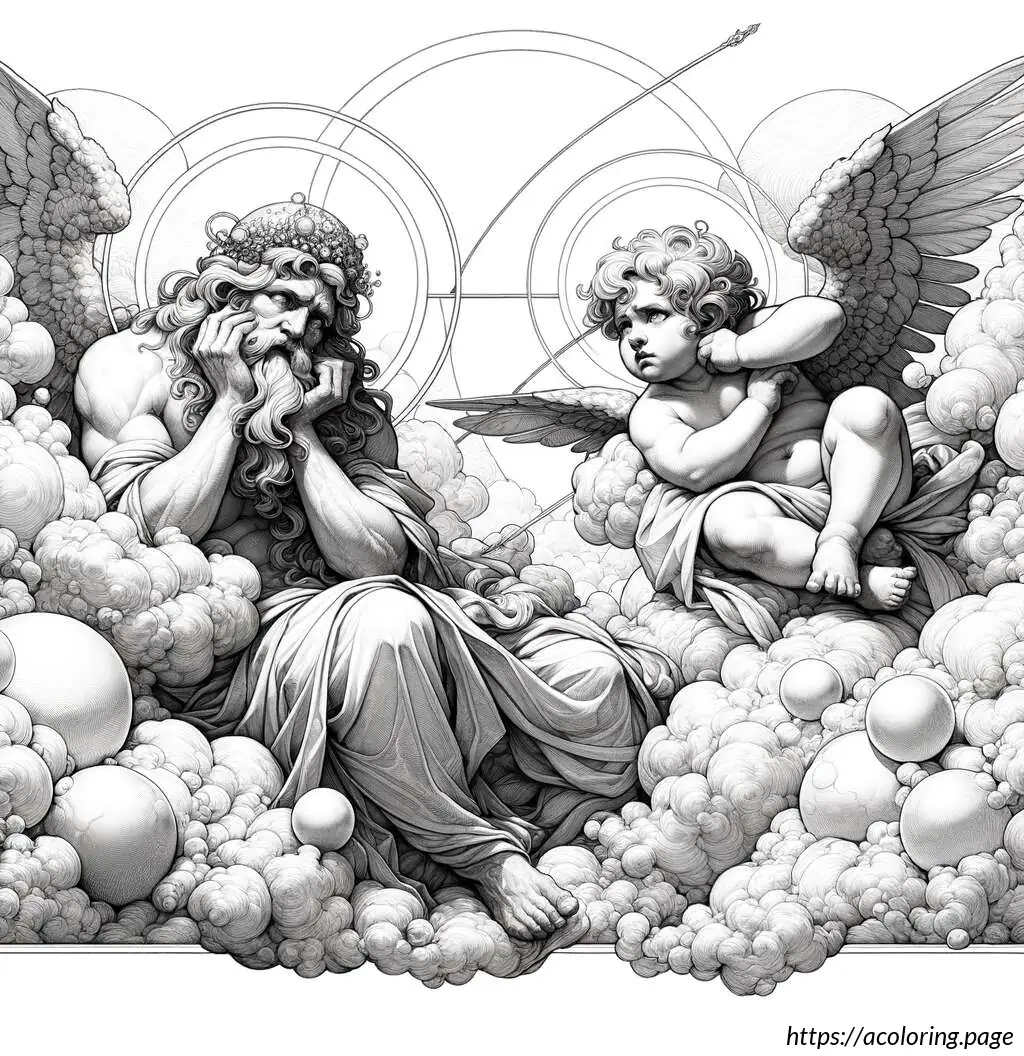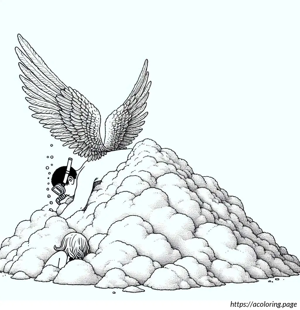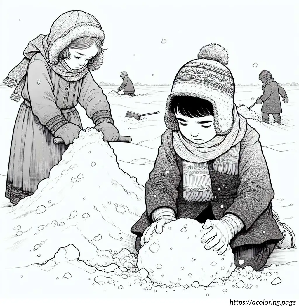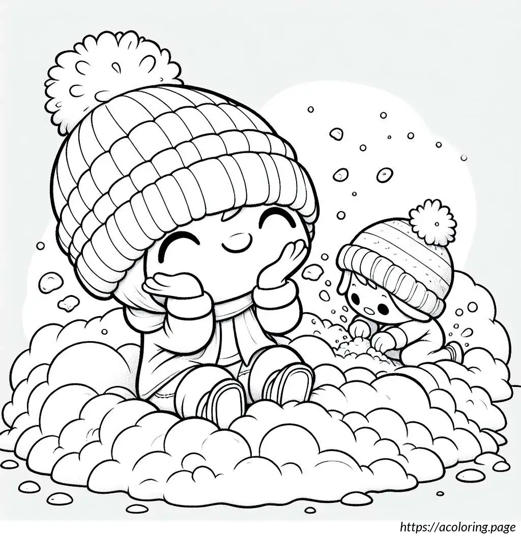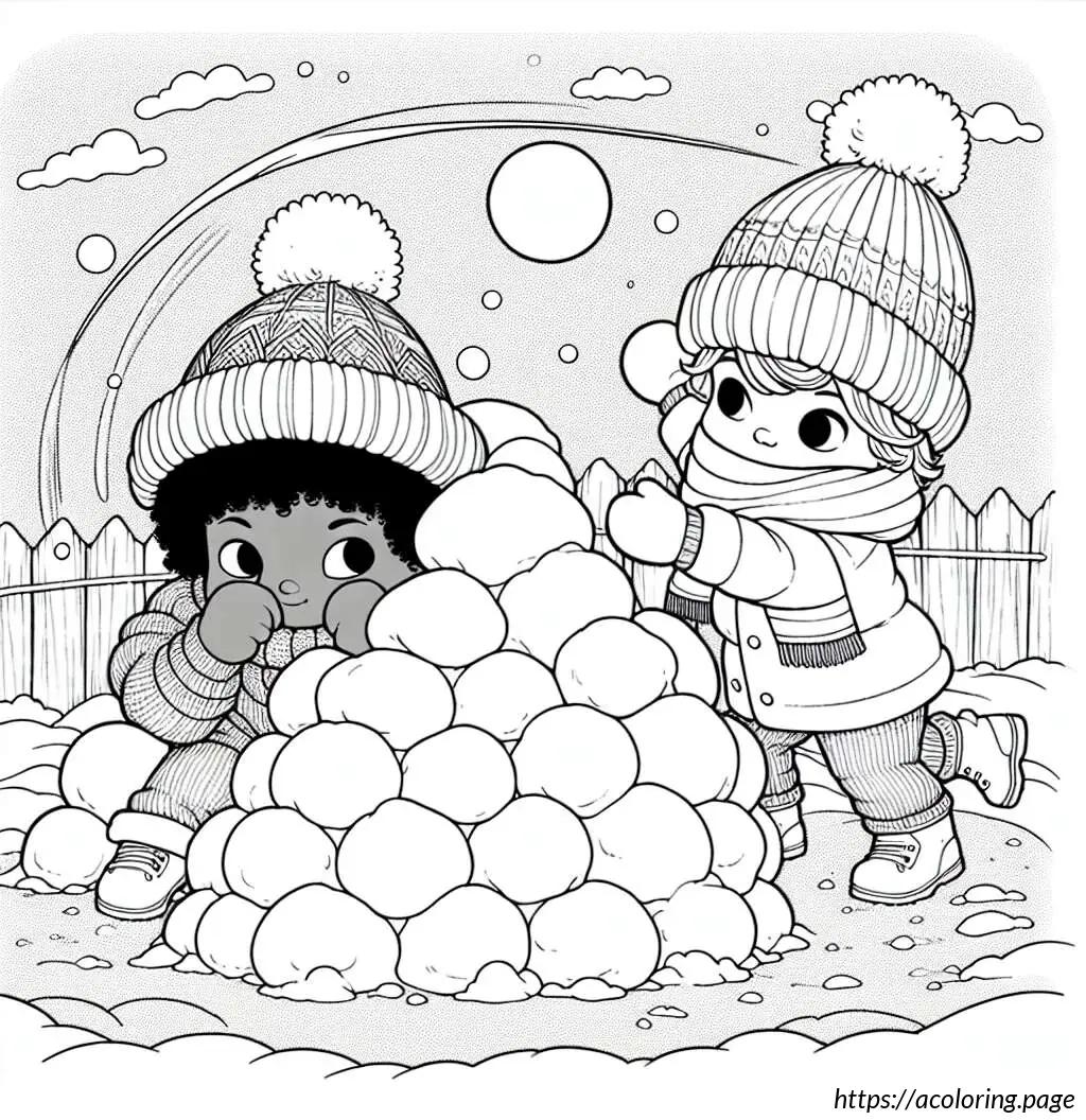 The image depicts two children engaged in a snowball fight. On the left, a child is peeking out from behind a snow fort, wearing a winter hat with a pompom on top. This child looks upset or annoyed, possibly from being hit by a snowball. On the right, another child is crouching behind a snow fort, preparing to throw a snowball. This child appears to be enjoying the game, showing a playful demeanor. Both children are surrounded by fluffy piles of snow, indicating a snowy environment. There is a curved line above, suggesting either a trajectory of the snowball or a simple separation in the scene. The drawing is simple and cartoonish, using clear lines without color.