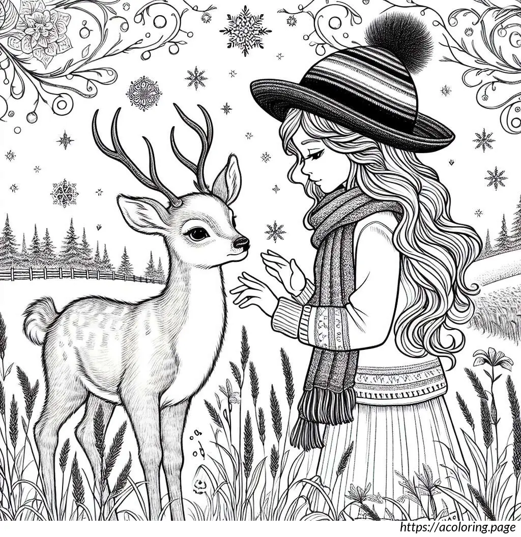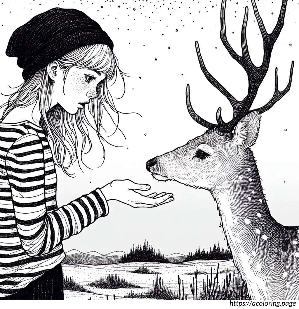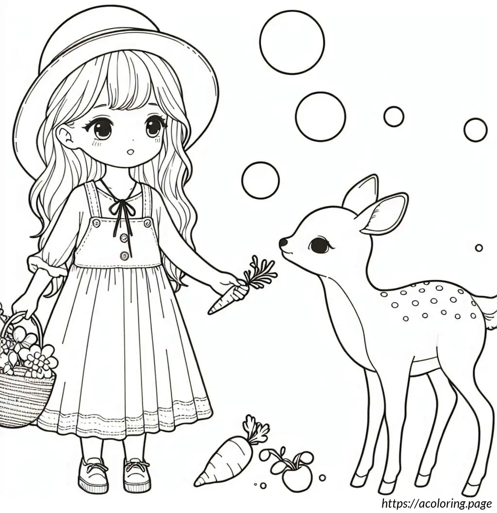 On the right, there is a young deer facing the girl. The deer has large, alert ears, a gentle expression marked by closed eyes and a smiling mouth, and is drawn with a slender body and delicate legs. The deer’s fur is indicated by a few spots and lines on its back.