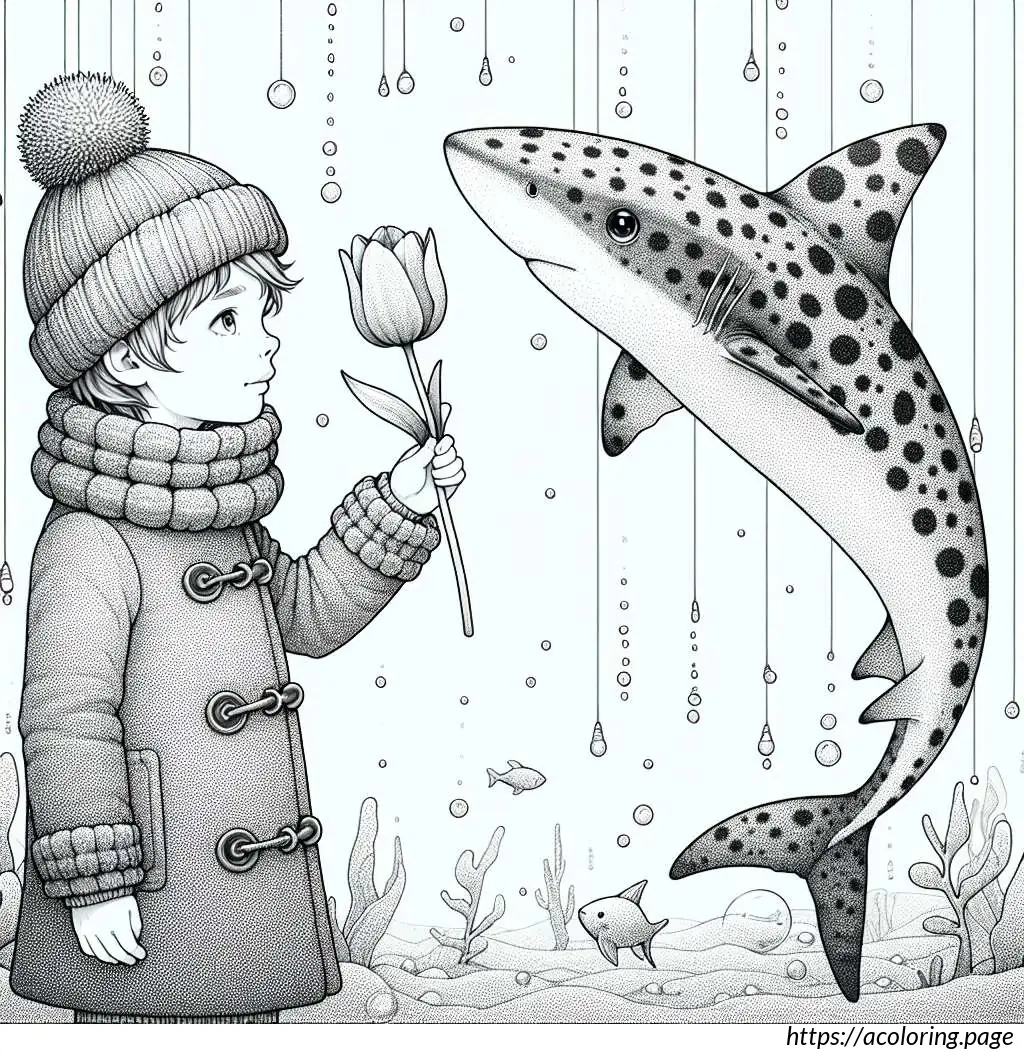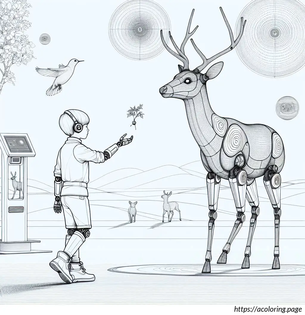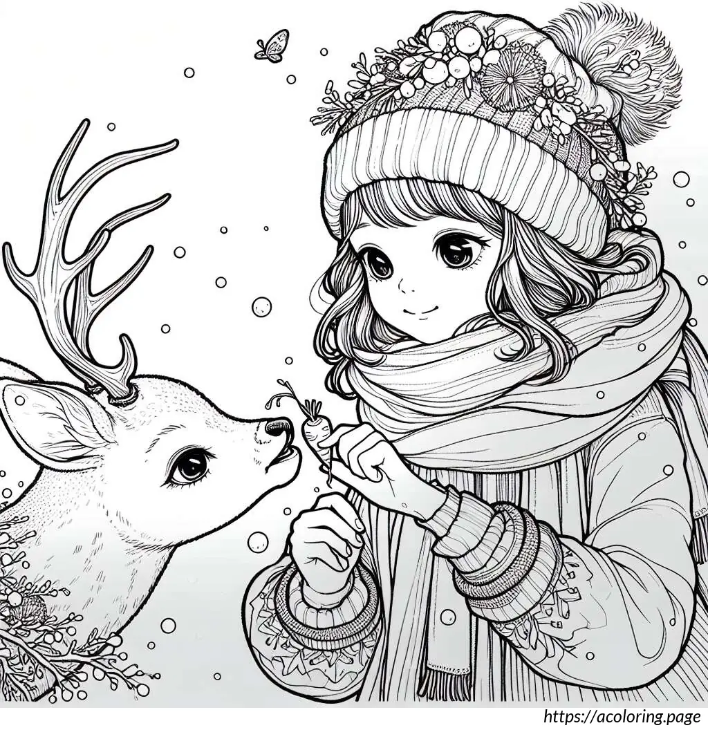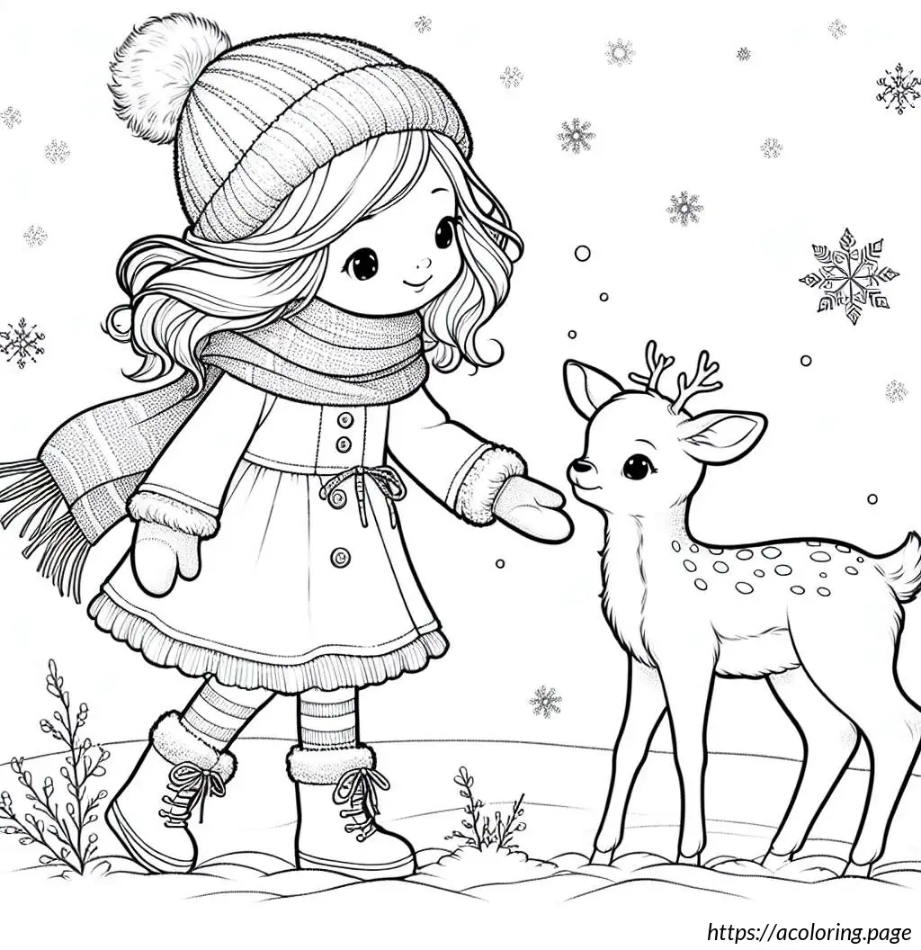 On the right, there is a young deer facing the girl. The deer has large, alert ears, a gentle expression marked by closed eyes and a smiling mouth, and is drawn with a slender body and delicate legs. The deer’s fur is indicated by a few spots and lines on its back.
