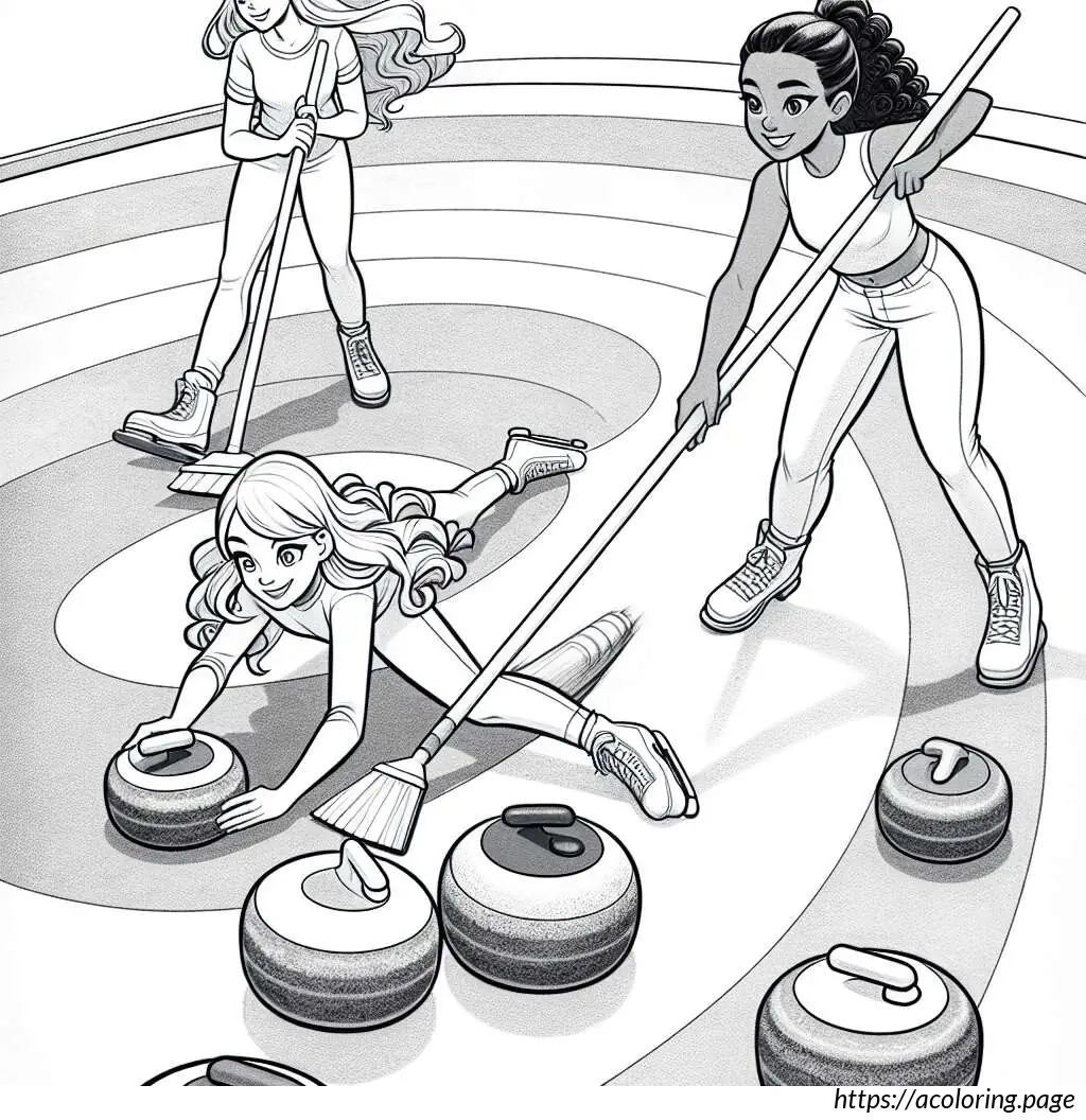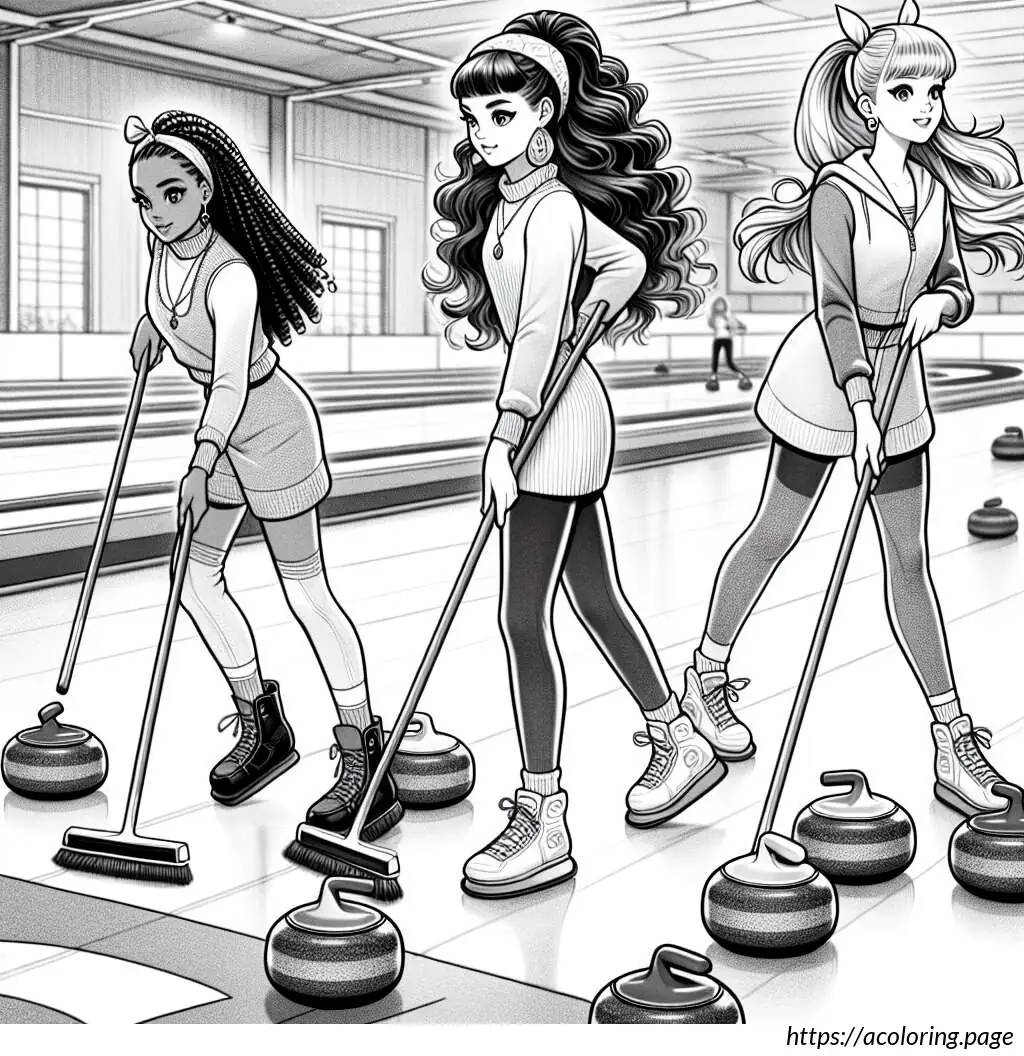 Right Girl: Standing in the background near the outer edge of the curling lane, with one leg extended forward. She is in a dynamic pose, either having just released a curling stone or gesturing directions. Her hair is tied in two side ponytails adorned with bows.