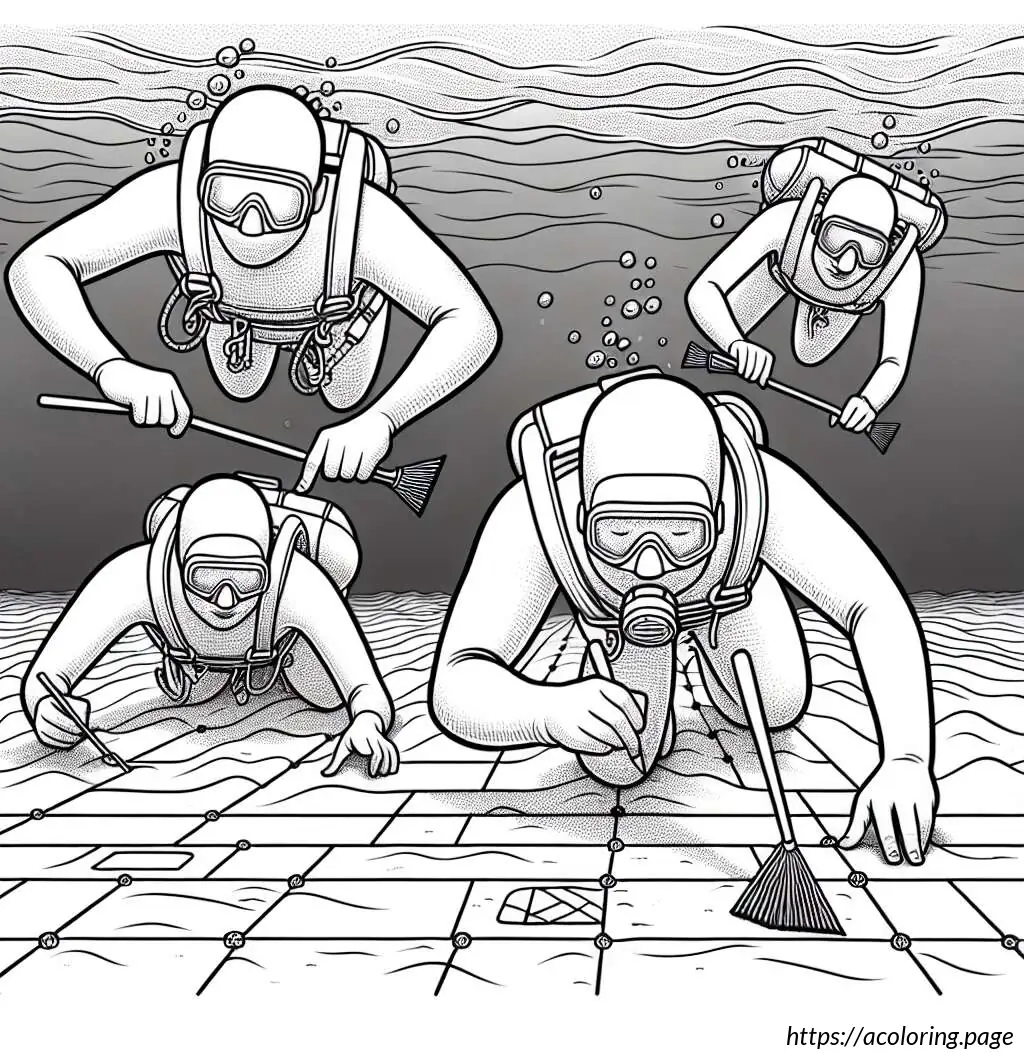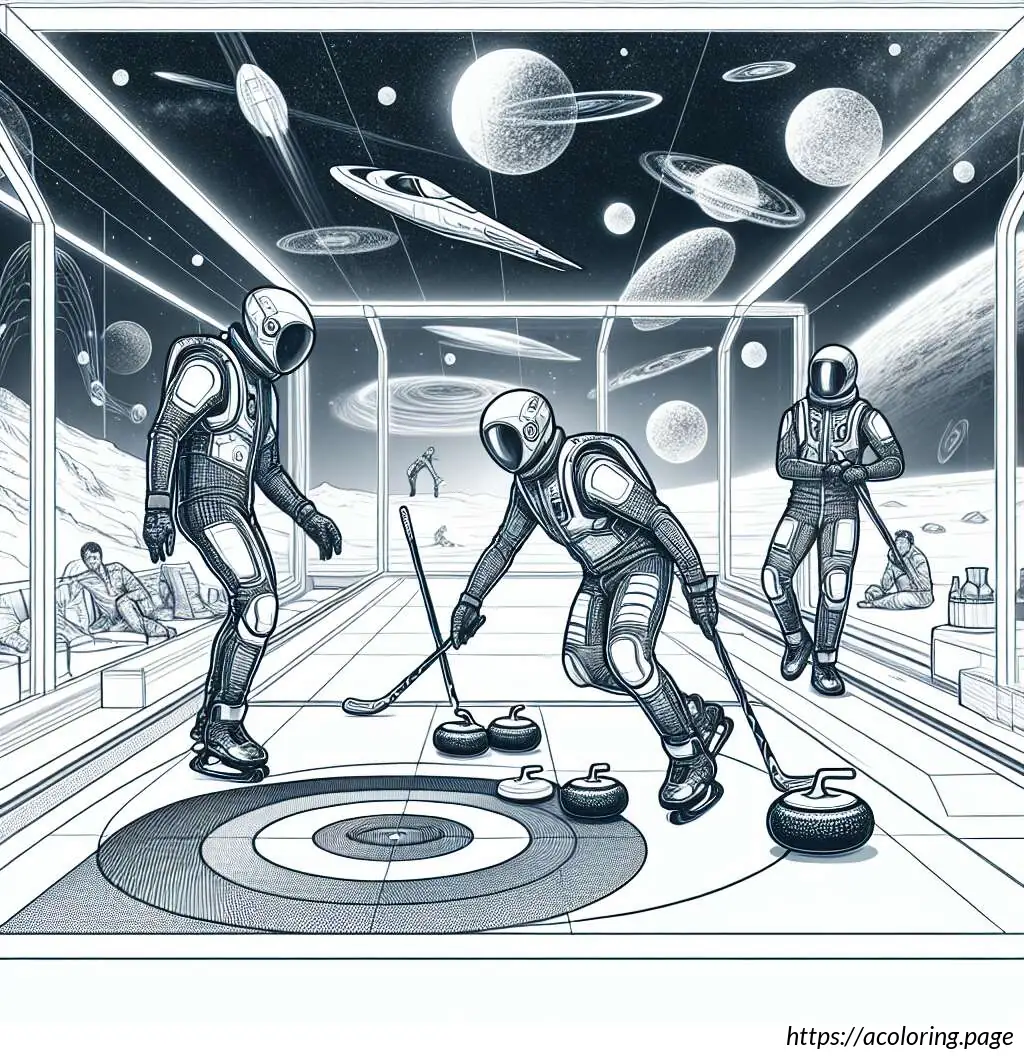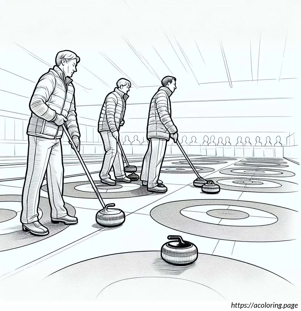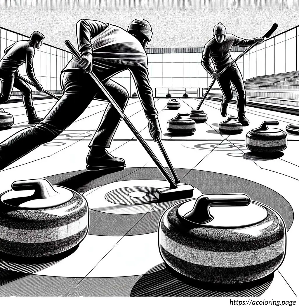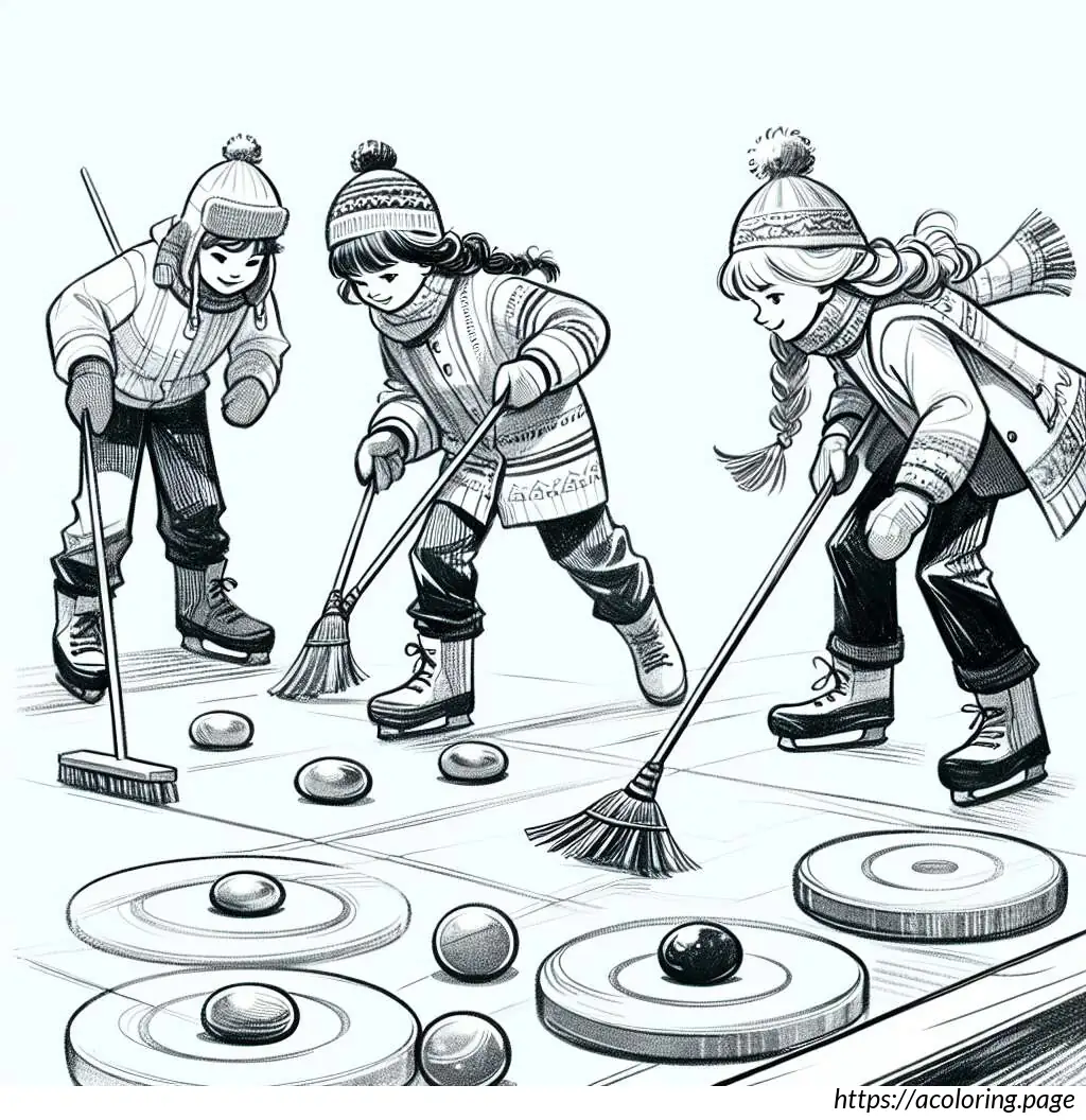 The scene includes four visible curling stones, three in motion and one stationary near what appears to be the target or “house.” Details such as the sheen on the ice and the depiction of action (sweeping and sliding movements) indicate the sport’s energetic nature. The setting features a partial view of the boarded rink and a simple patterned borderline, which might mark the lane of play. The entire composition effectively captures a moment of youthful energy and team cooperation in sport.
