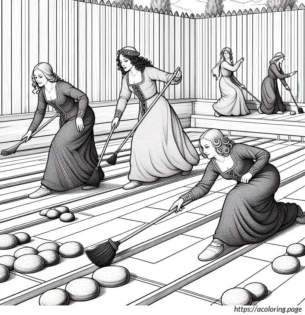 Middle Girl: Also sweeping vigorously ahead of the moving curling stone. Her ponytail, bandana around her head, and attire similar to her teammates suggest a uniform look for the team. Like the first girl, she wears a collared bodysuit and has a focused expression.