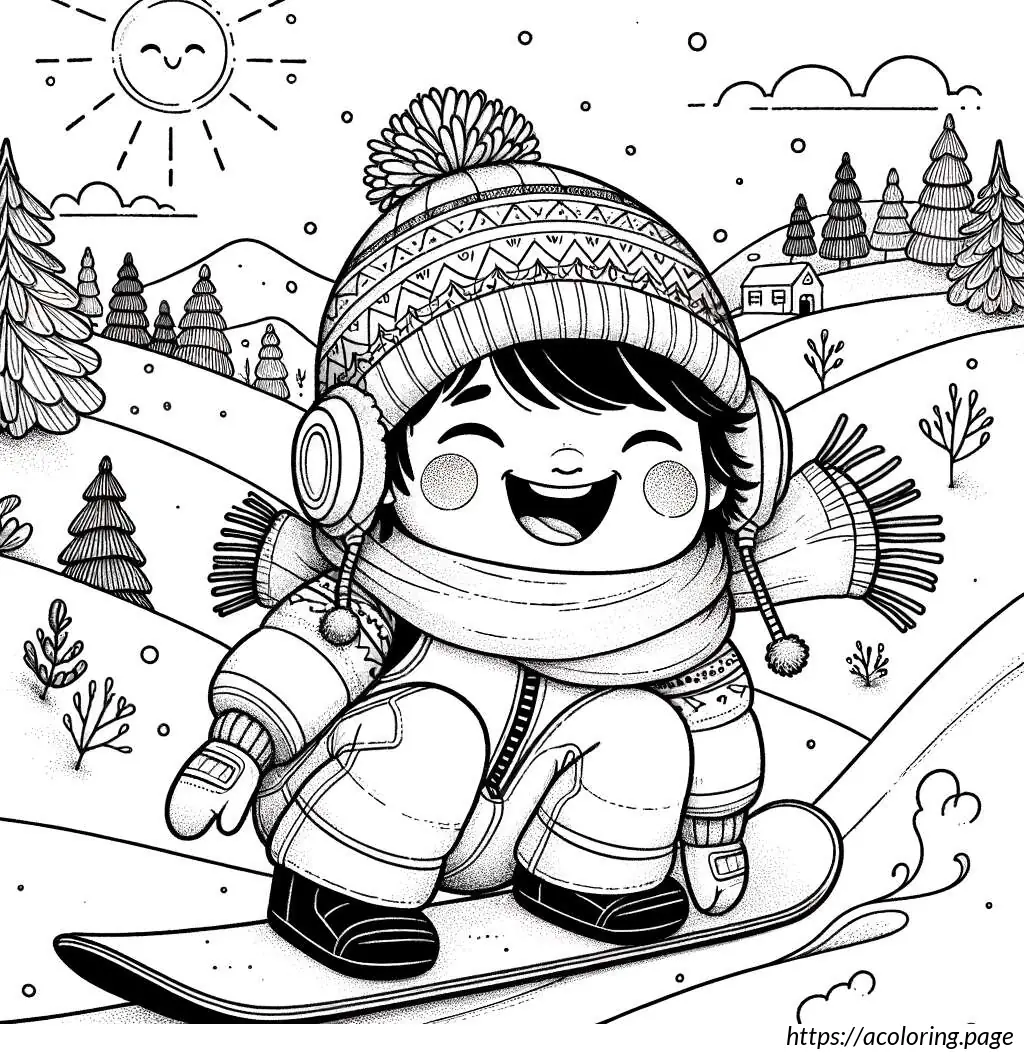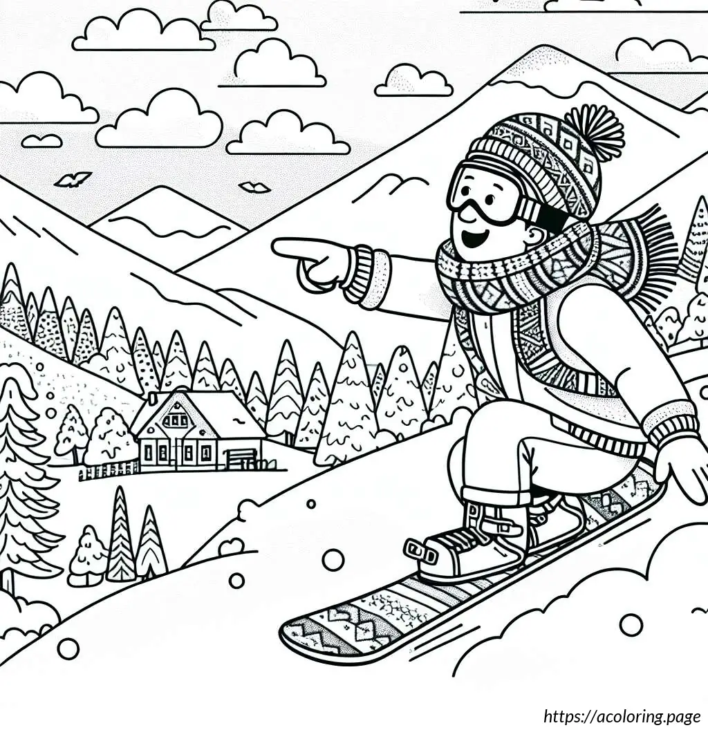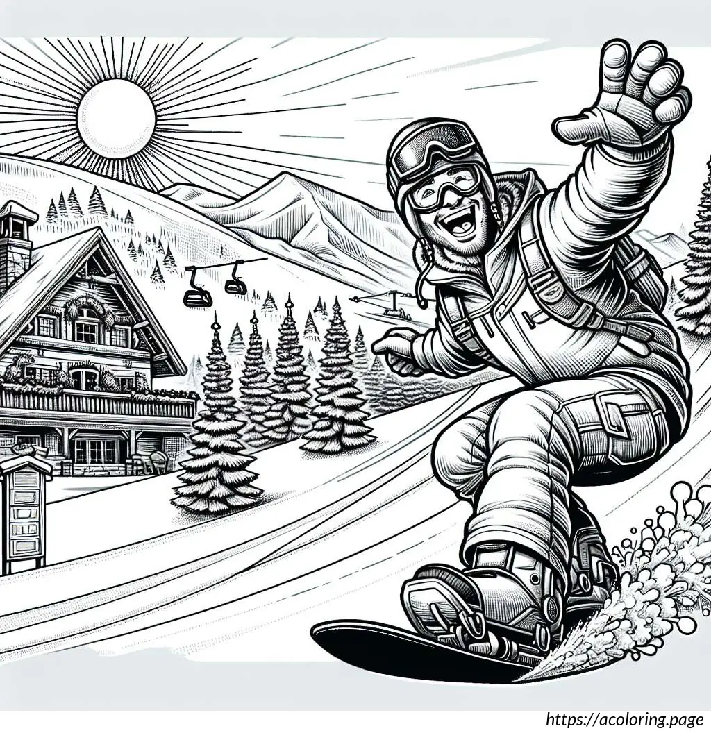 This image is a black-and-white cartoon illustration of a person snowboarding. The snowboarder, wearing a helmet and goggles, is animatedly descending a snowy slope with one hand extended outward for balance. They appear excited and joyful, indicated by a wide-open mouth that suggests they are possibly shouting or cheering.