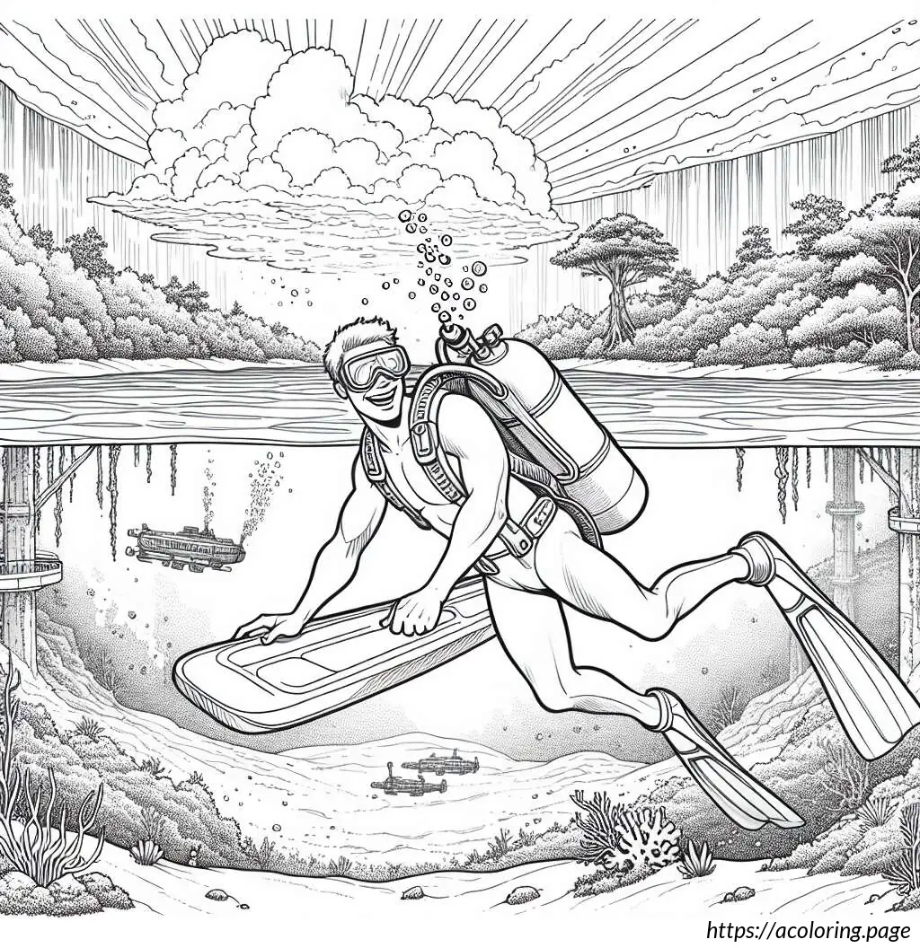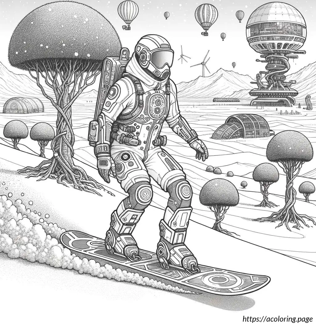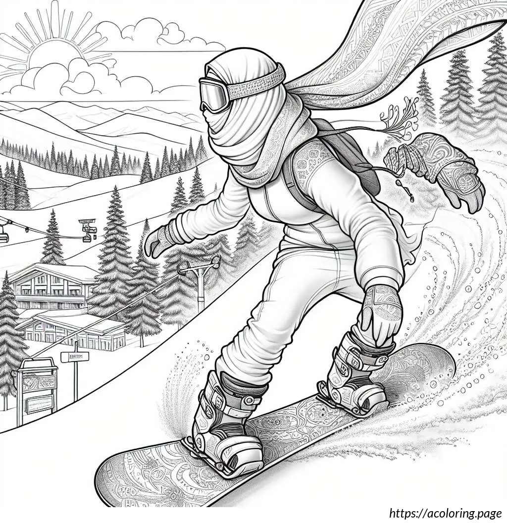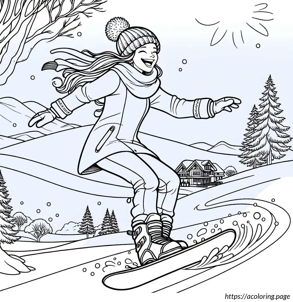 This image is a black-and-white cartoon illustration of a person snowboarding. The snowboarder, wearing a helmet and goggles, is animatedly descending a snowy slope with one hand extended outward for balance. They appear excited and joyful, indicated by a wide-open mouth that suggests they are possibly shouting or cheering.