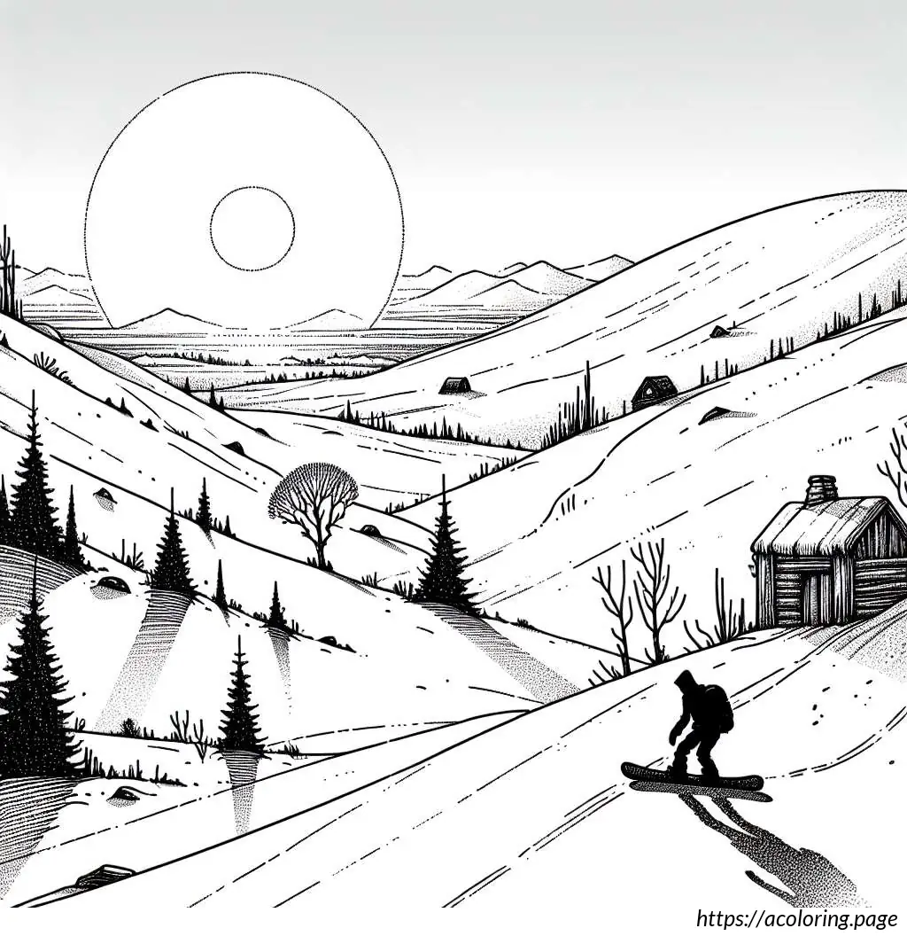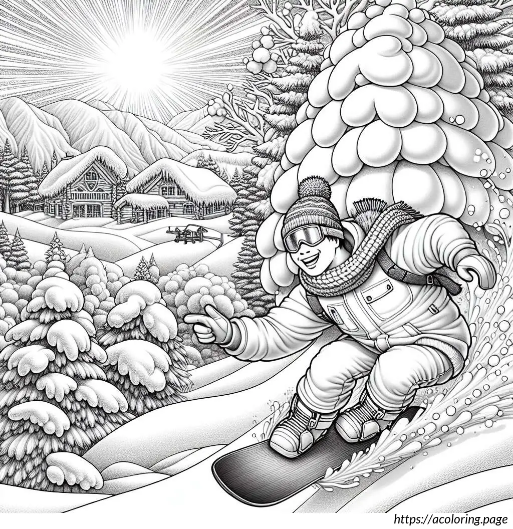 In the background, there is a snowy landscape featuring fir trees and a two-story structure that resembles a ski lodge or a cabin. The architectural design of the building includes a large door and smaller windows, typical of a mountain retreat. A ski lift signpost is also visible next to the building, hinting at the location being a ski resort. The sun is shown in the upper left corner, and some clouds are scattered across the sky, complementing the wintry outdoor scene. Overall, the scene conveys a sense of dynamic winter sports activity in a cheerful, cartoon style.