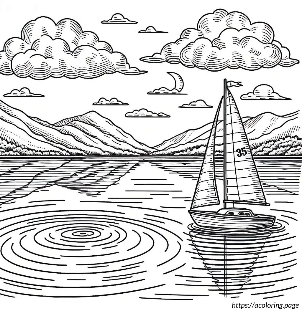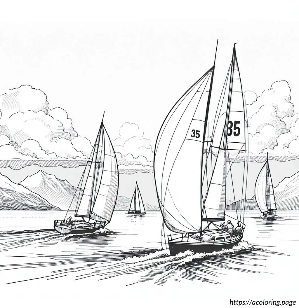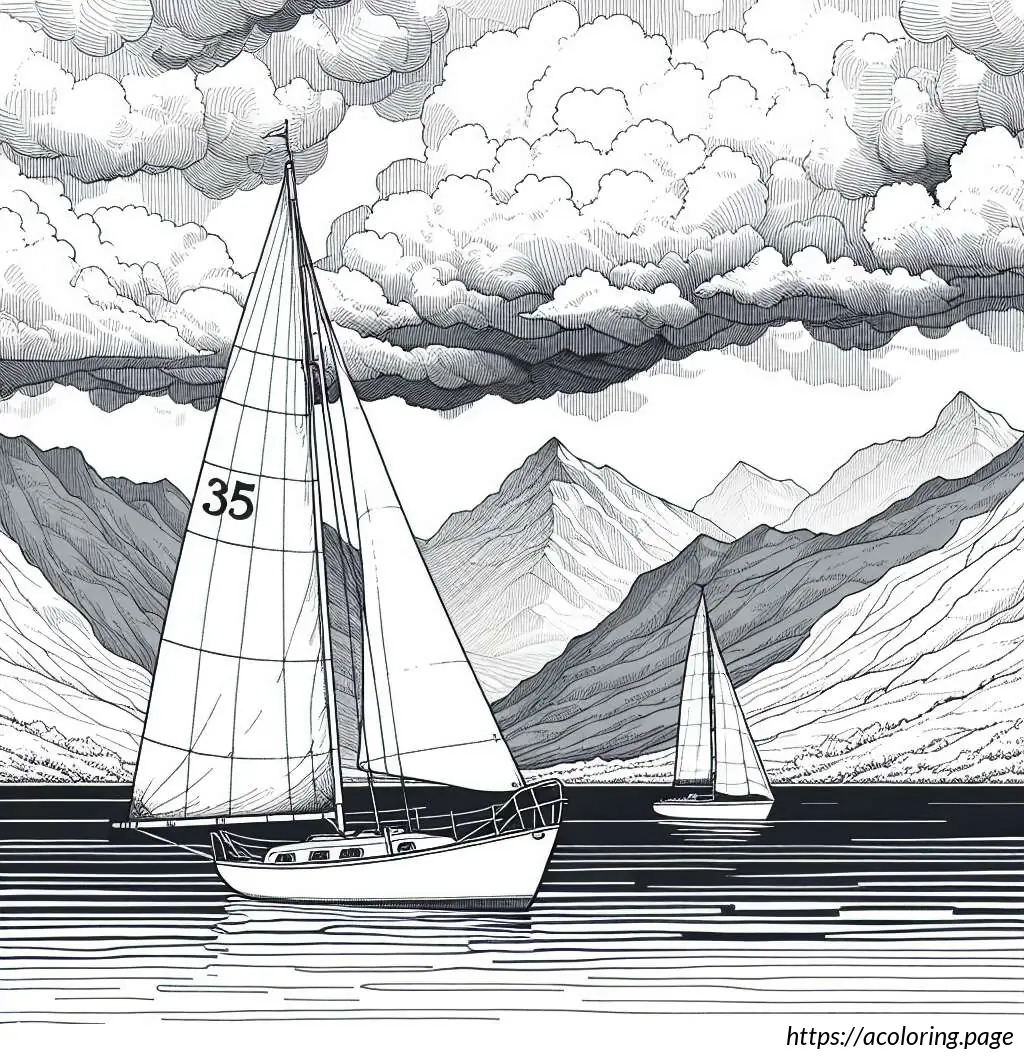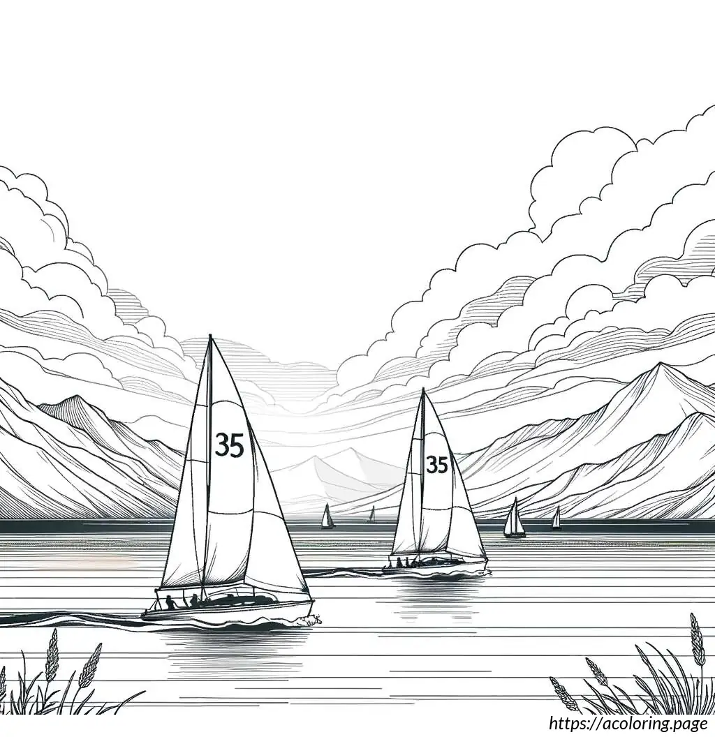 The image presents a serene lake scene with two sailboats actively sailing. These sailboats are distinct, each featuring a triangular sail marked with the number “35”. The water appears lightly rippled suggesting a gentle breeze which is ideal for sailing. The background includes mountainous landscapes which are simply drawn, contributing to a calm and picturesque setting. Overhead, the sky is filled with fluffy, stylized clouds dispersed across the area, enhancing the overall tranquil and leisurely ambiance of the setting. The picture’s mono-coloured, outlined drawing style suggests it is perhaps designed for coloring or educational purposes.