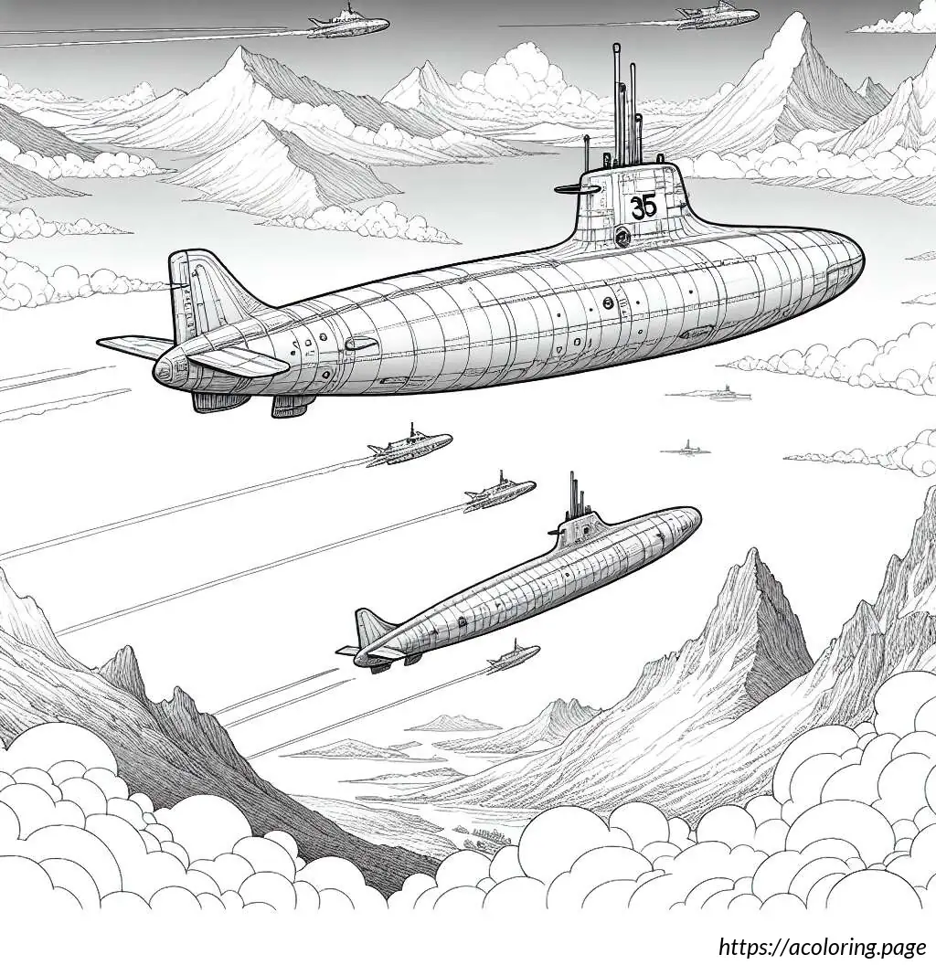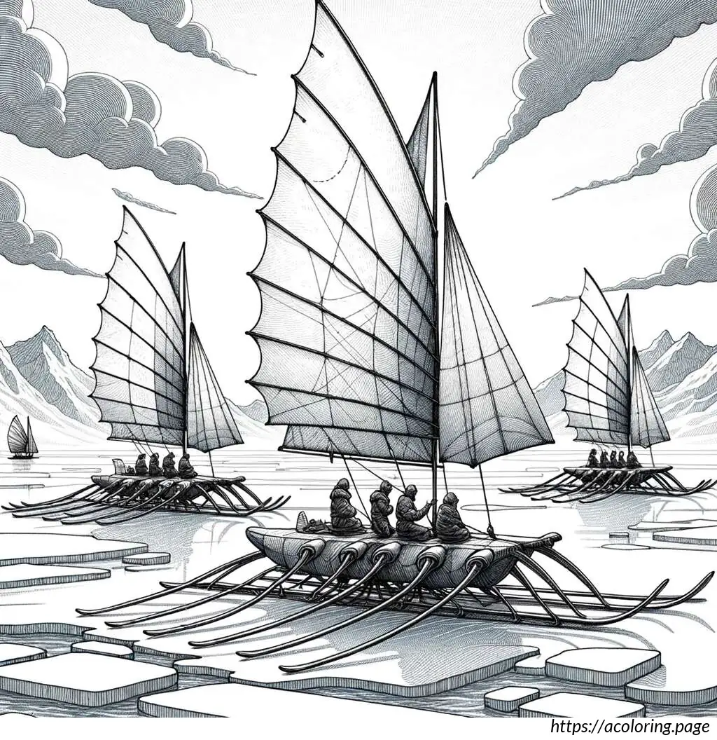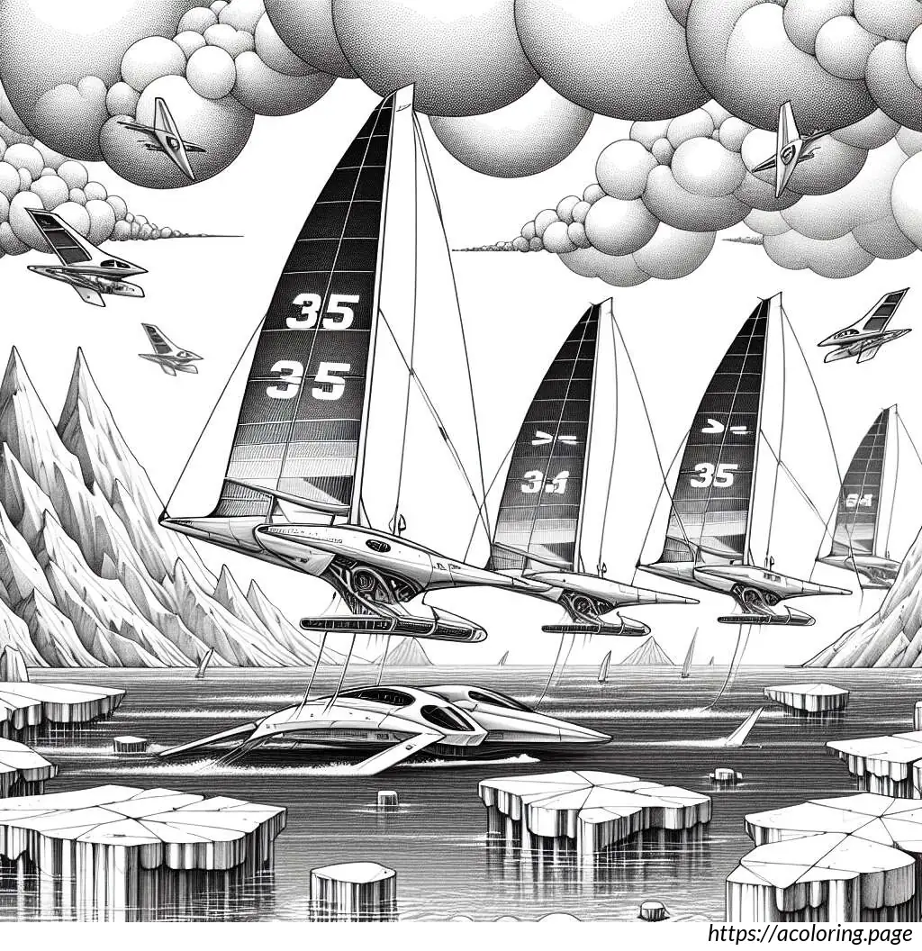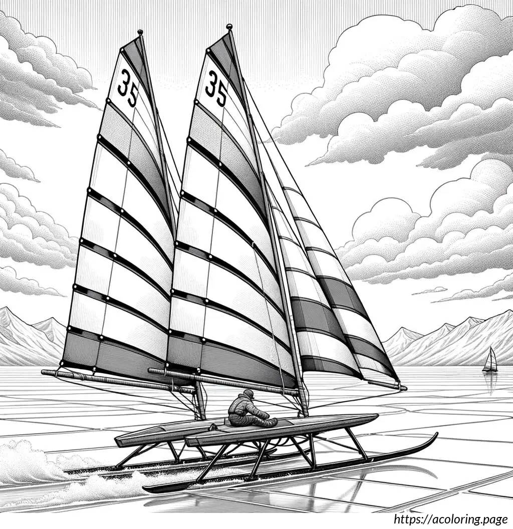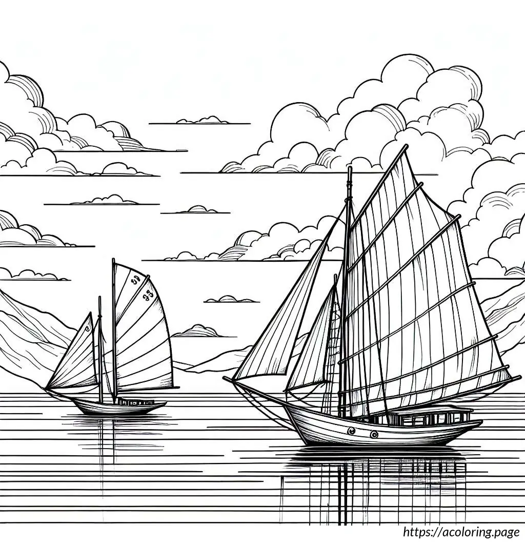 The image presents a serene lake scene with two sailboats actively sailing. These sailboats are distinct, each featuring a triangular sail marked with the number “35”. The water appears lightly rippled suggesting a gentle breeze which is ideal for sailing. The background includes mountainous landscapes which are simply drawn, contributing to a calm and picturesque setting. Overhead, the sky is filled with fluffy, stylized clouds dispersed across the area, enhancing the overall tranquil and leisurely ambiance of the setting. The picture’s mono-coloured, outlined drawing style suggests it is perhaps designed for coloring or educational purposes.
