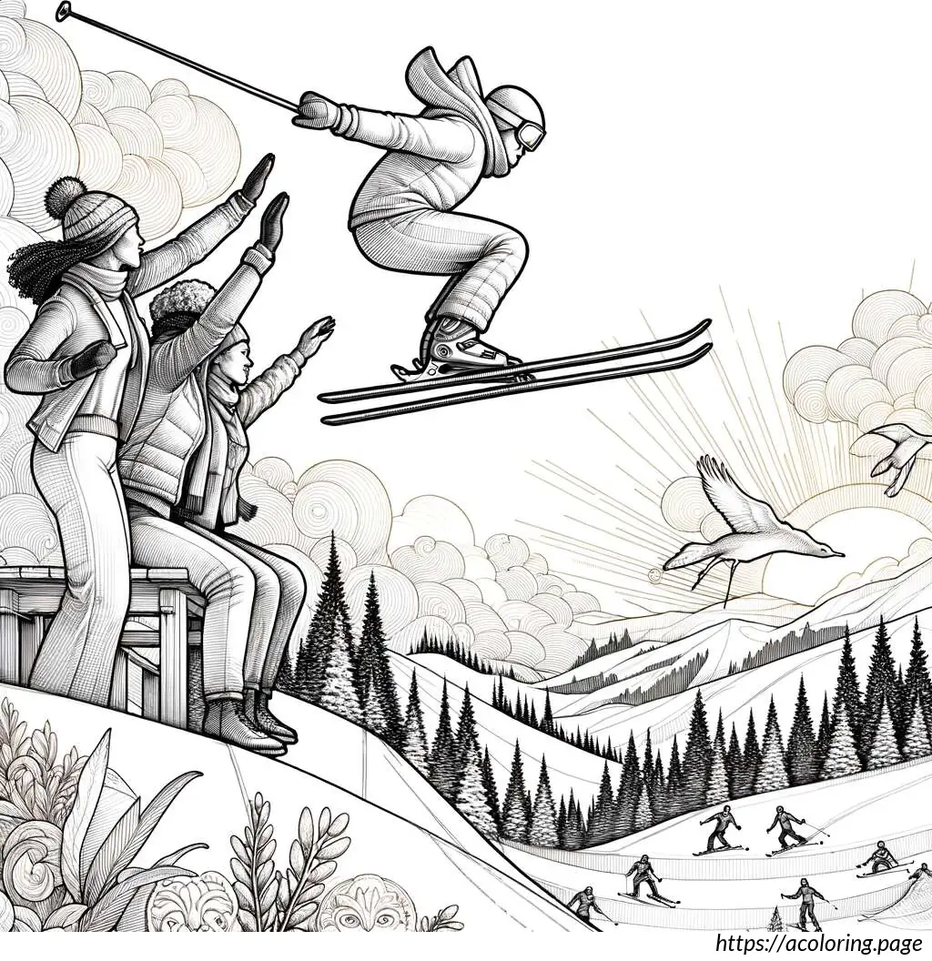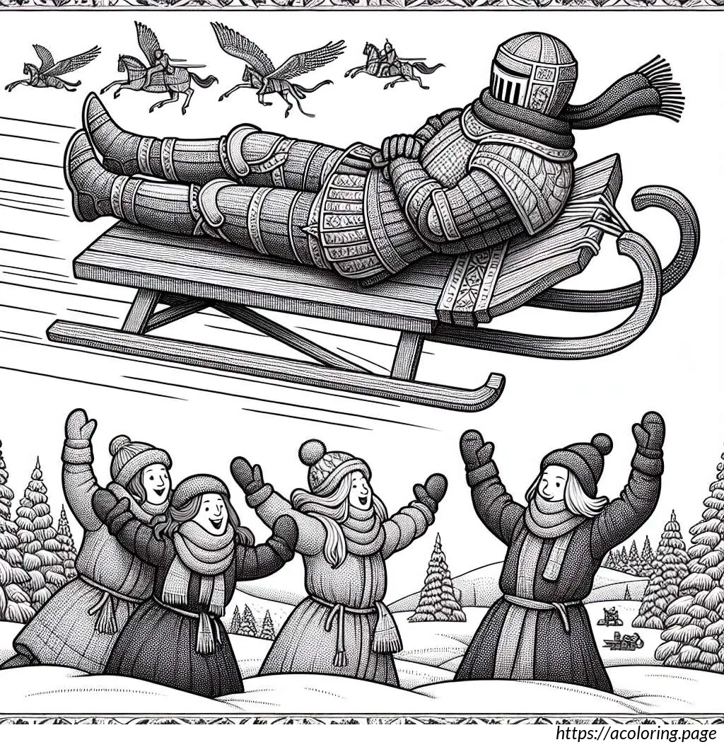 In the foreground, there are three enthusiastic spectators near the bottom of the slope. They are dressed in winter clothing including hats and scarves, and they are cheering or reacting animatedly to the sledding action. One of them appears to have their hands up, possibly cheering, another has their arms raised above their head exultantly, and the third is clapping. Their facial features are simplified but convey excitement and enjoyment of the snowy activity.