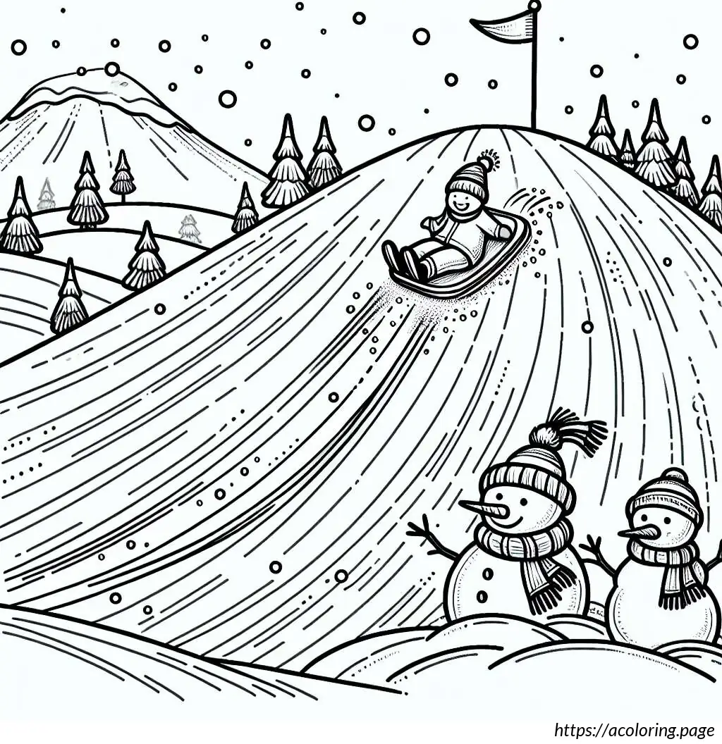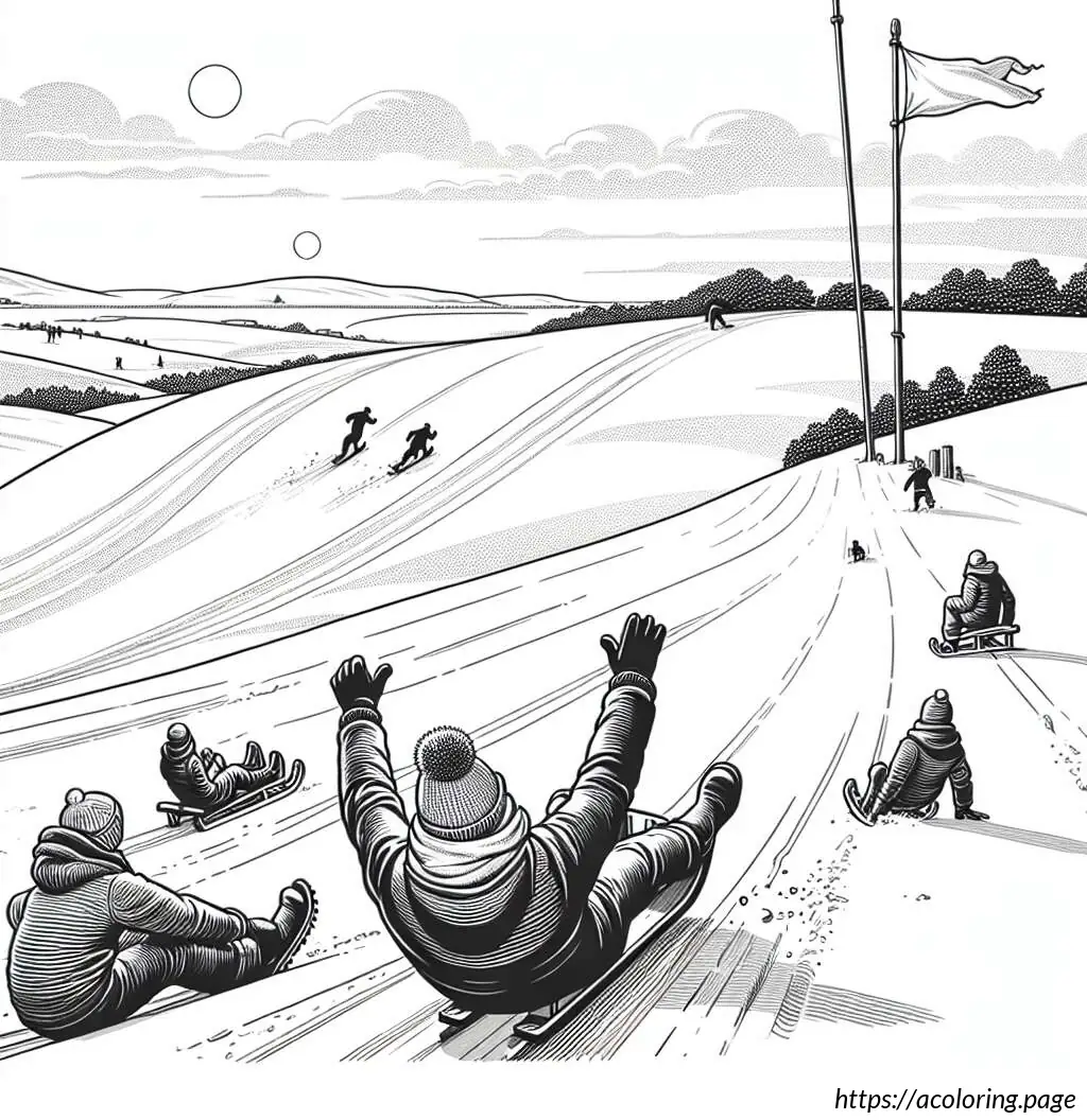The image depicts a lively winter scene where a person is sledding. The person is on a sled, lying on their stomach and speeding down a snowy hill. They are wearing a winter outfit; the details such as color are not visible as the image is in black and white. The hill slopes downwards from left to right.