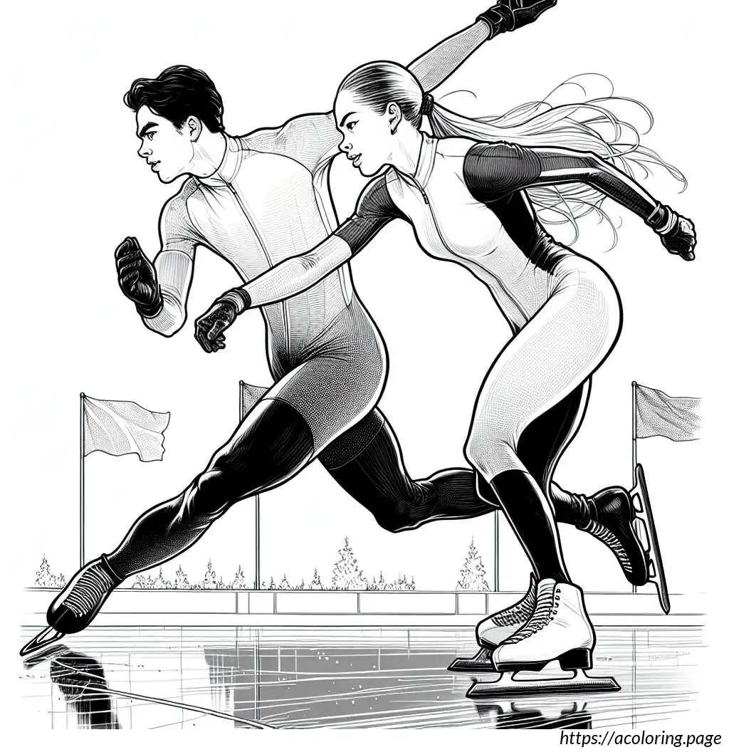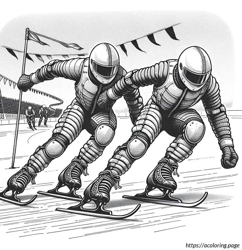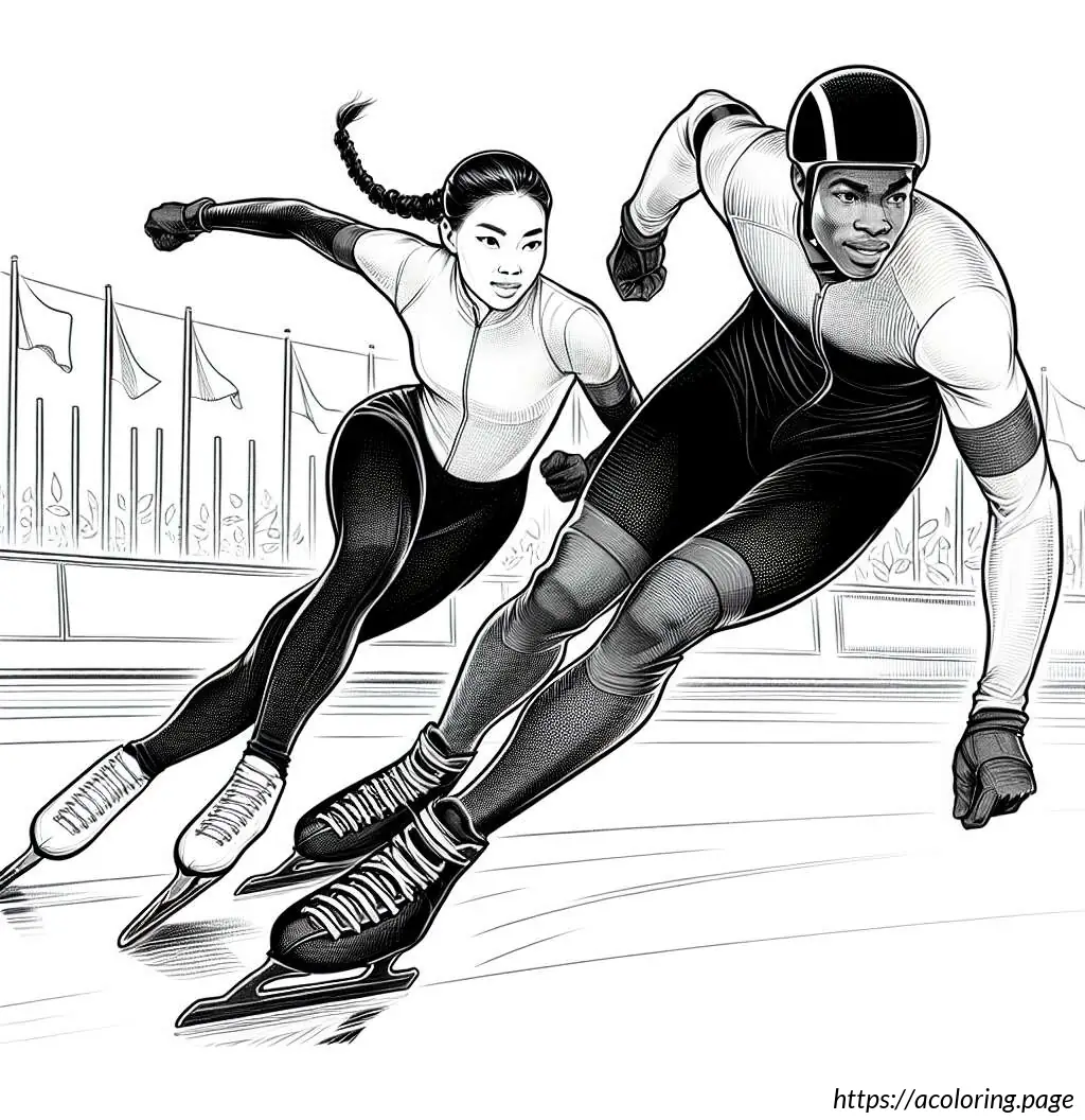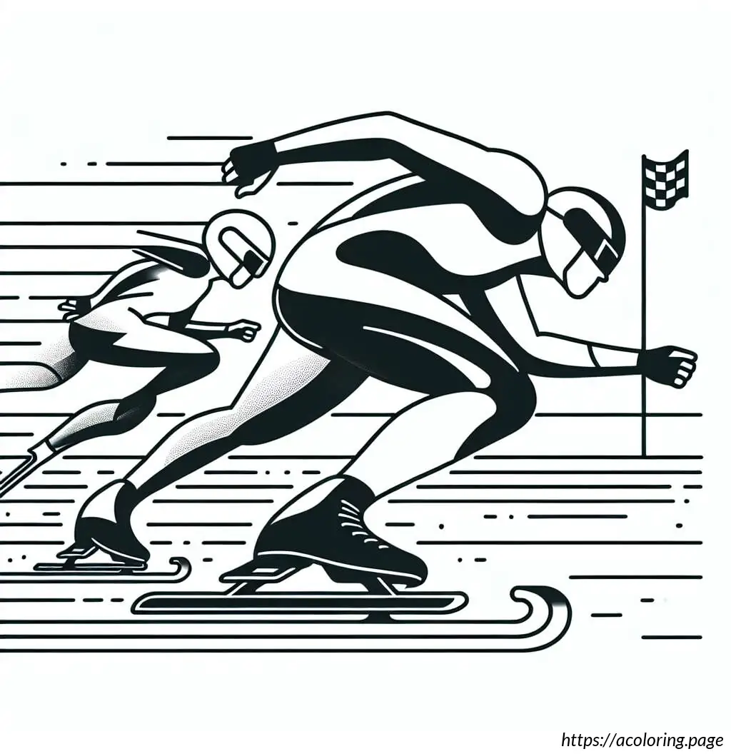 This image is a black and white line drawing depicting two people engaged in a speed skating competition. Both skaters are dressed in tight, athletic short-sleeved suits, knee pads, and helmets, or headgear, indicative of safety measures for high-speed skating. They are shown in dynamic poses, emphasizing speed and motion, as they glide forward on their skates.