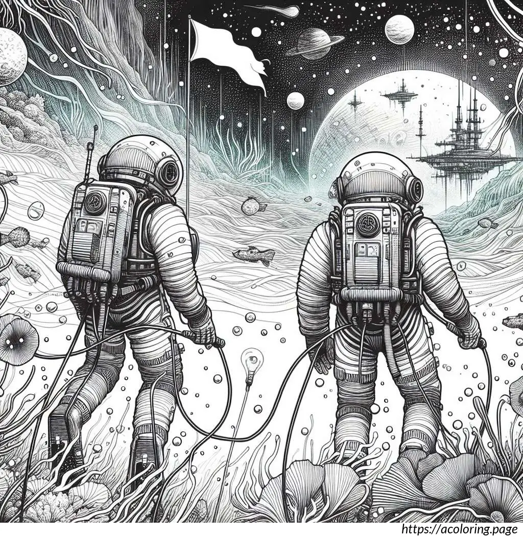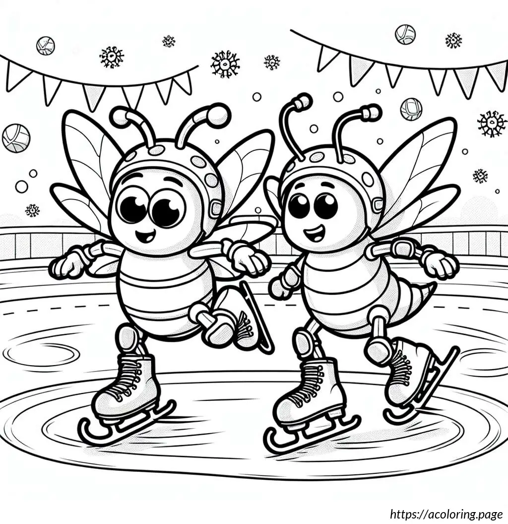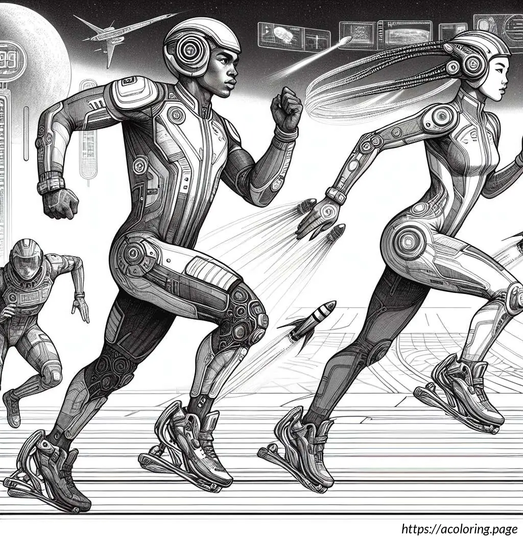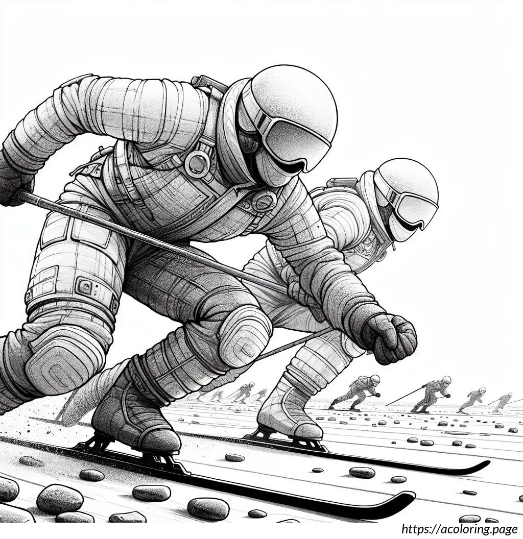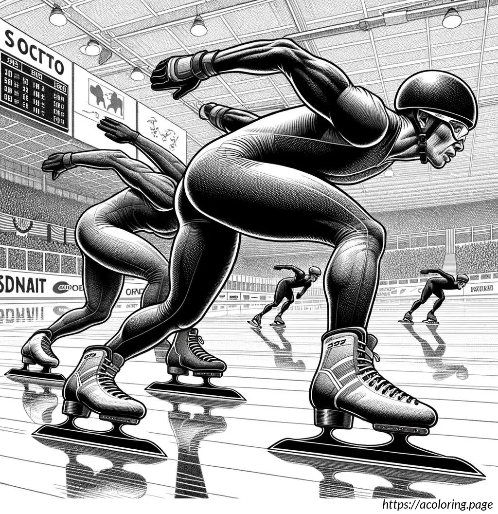 This image is a black and white line drawing depicting two people engaged in a speed skating competition. Both skaters are dressed in tight, athletic short-sleeved suits, knee pads, and helmets, or headgear, indicative of safety measures for high-speed skating. They are shown in dynamic poses, emphasizing speed and motion, as they glide forward on their skates.