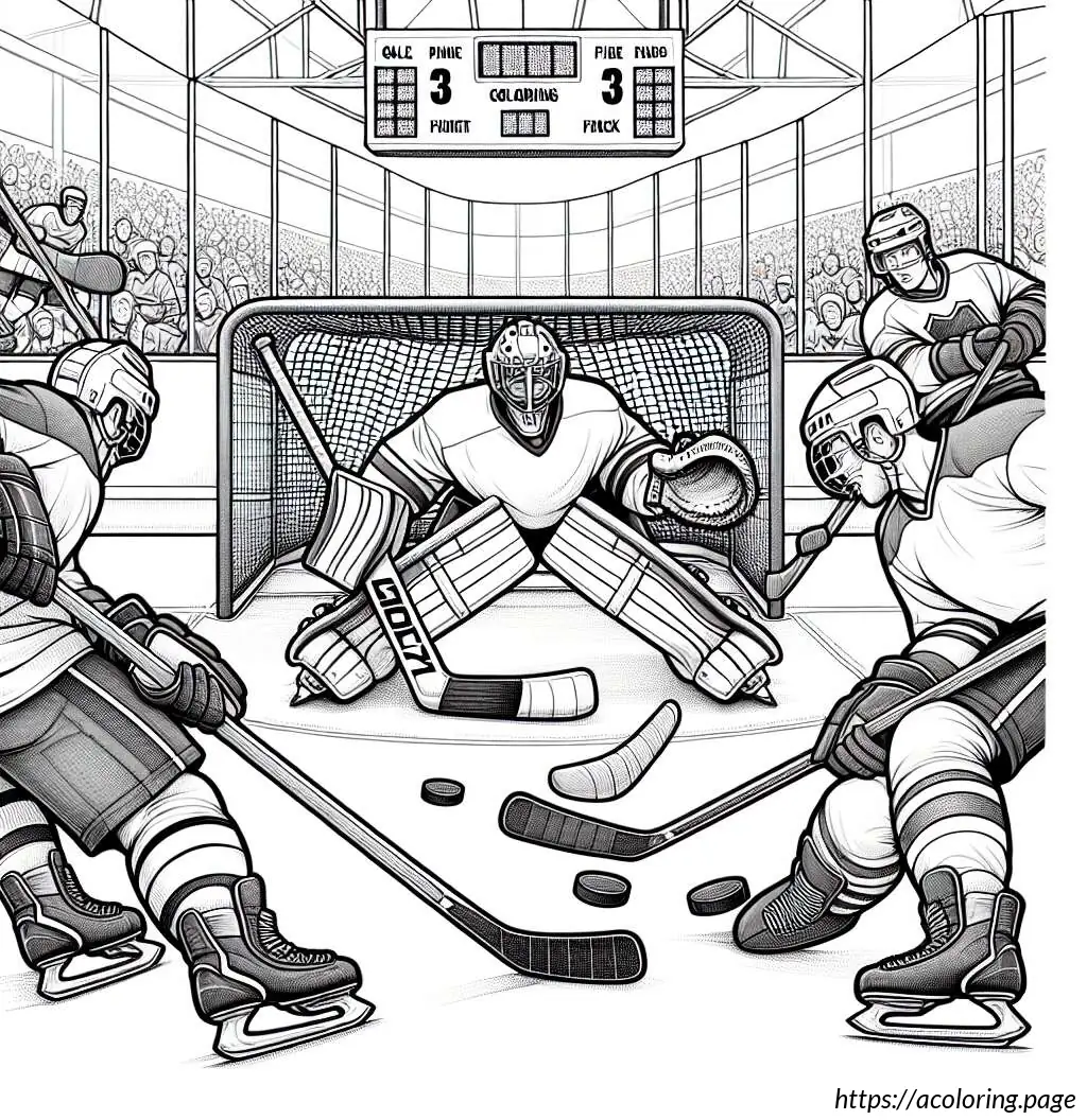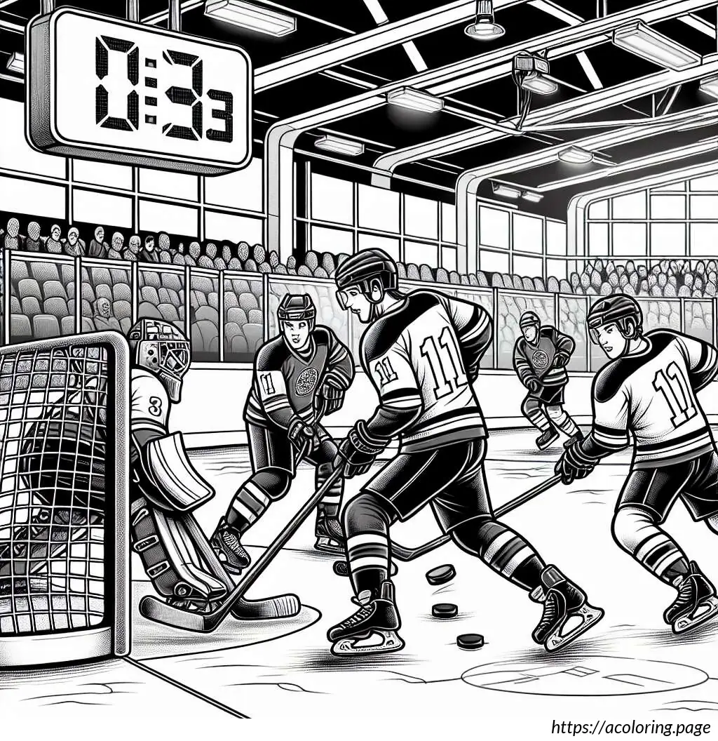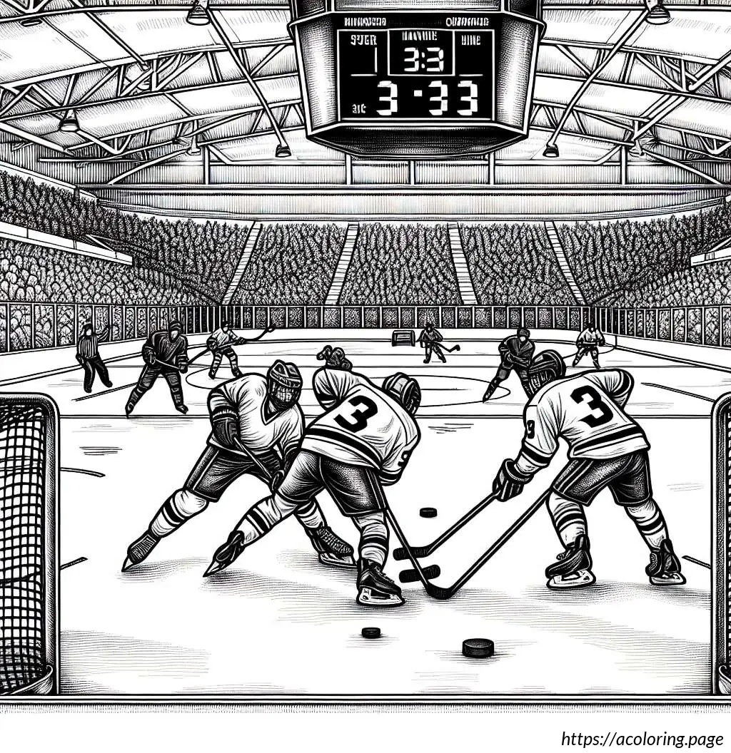 In the background, the rink is enclosed by boards, above which a scoreboard showing a tied score of 3:3 is visible. The scene conveys an intense moment typically seen in a hockey game, where players are engaged in a critical play. The drawing style is simple and cartoonish, emphasizing clarity and action over detailed realism.