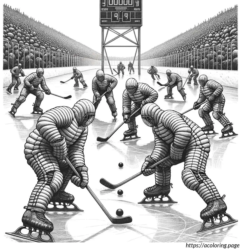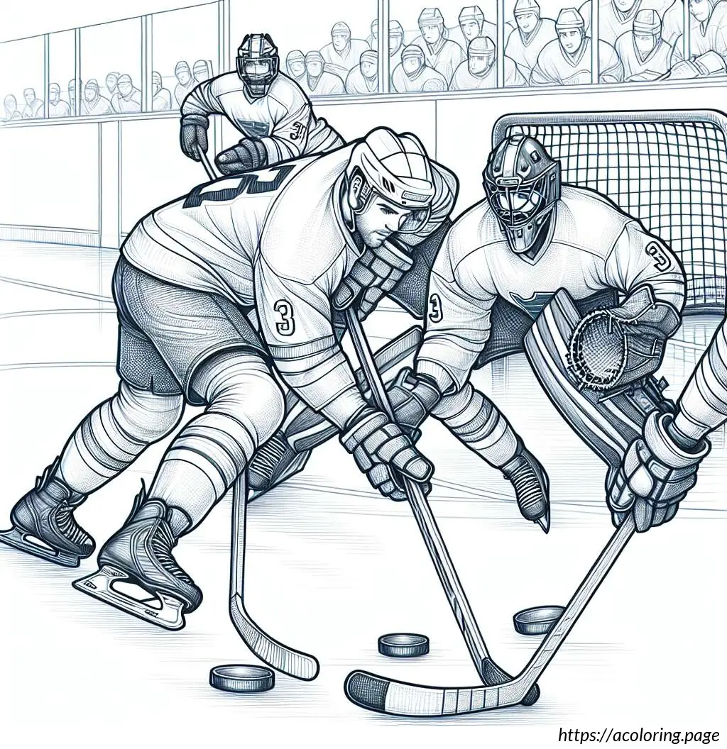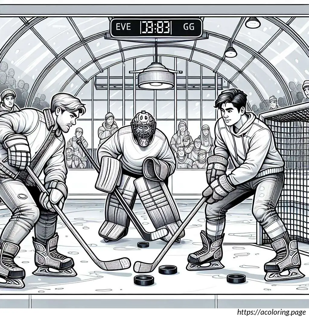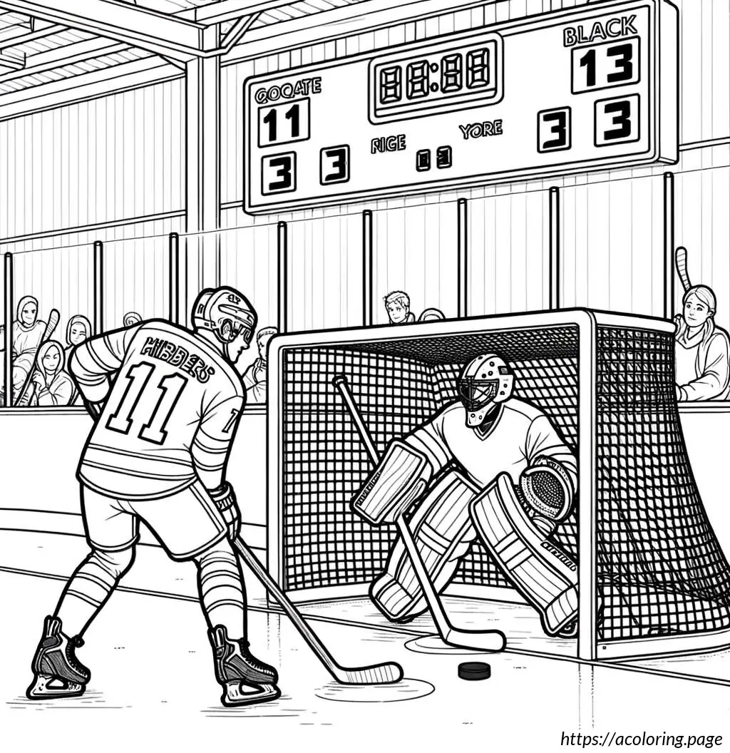 In the background, the rink is enclosed by boards, above which a scoreboard showing a tied score of 3:3 is visible. The scene conveys an intense moment typically seen in a hockey game, where players are engaged in a critical play. The drawing style is simple and cartoonish, emphasizing clarity and action over detailed realism.