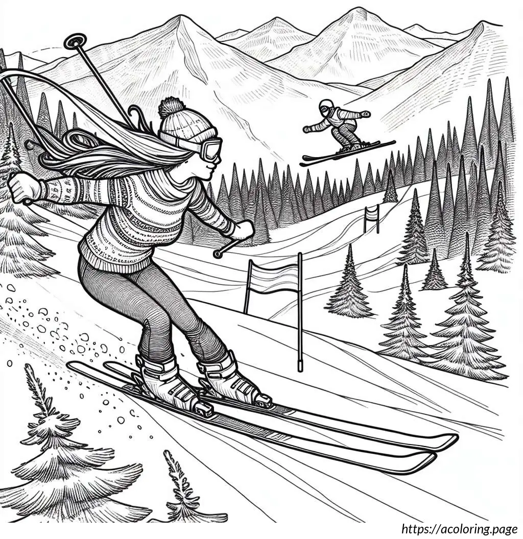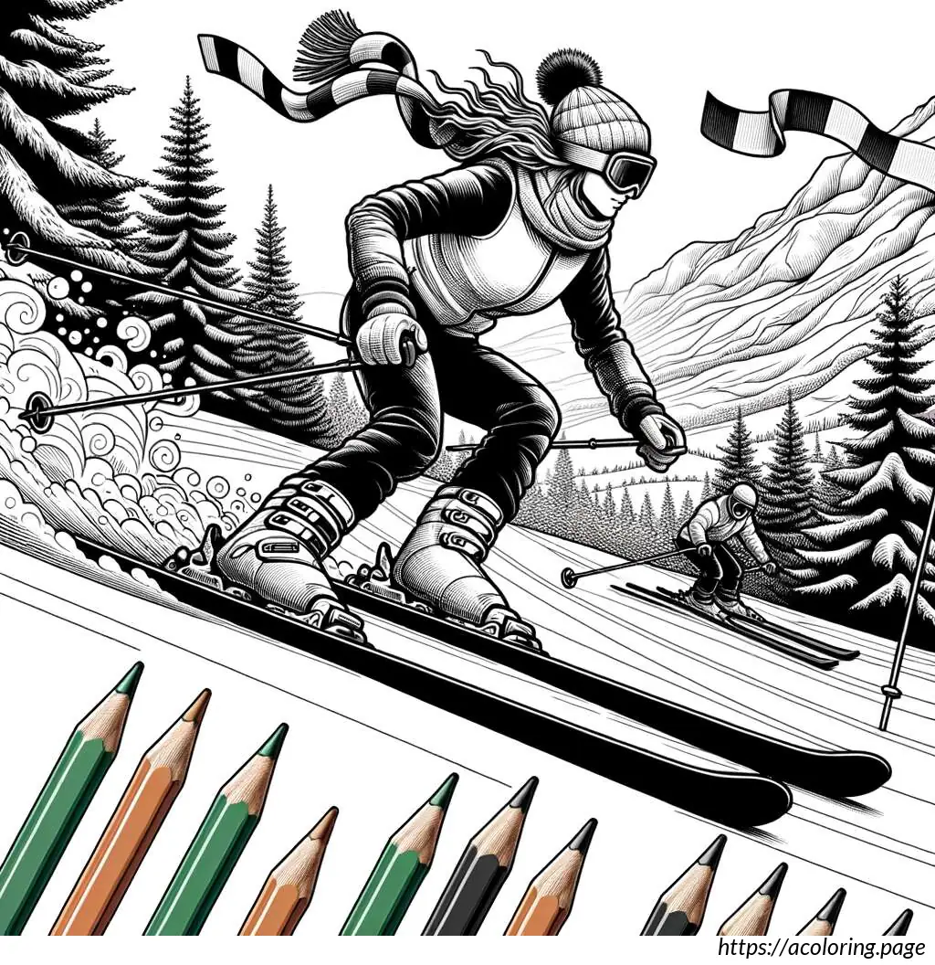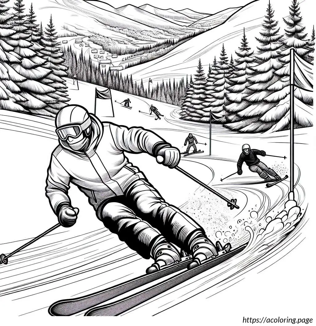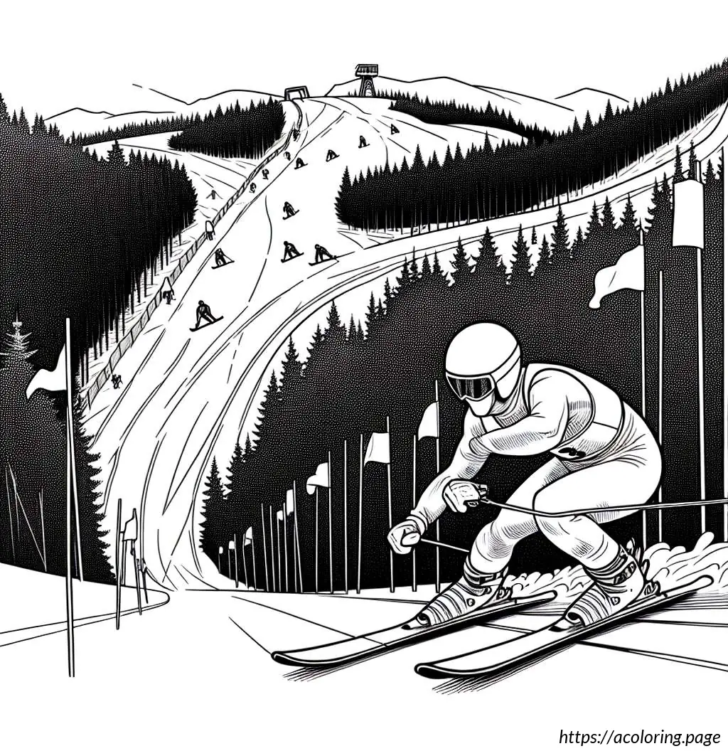 The entire scene is illustrated in a cartoon style, using clean lines and without color, resembling a coloring book page. The portrayal effectively captures the speed and exhilaration associated with downhill skiing.