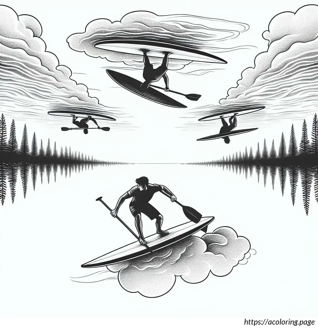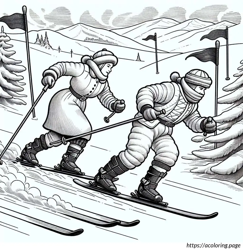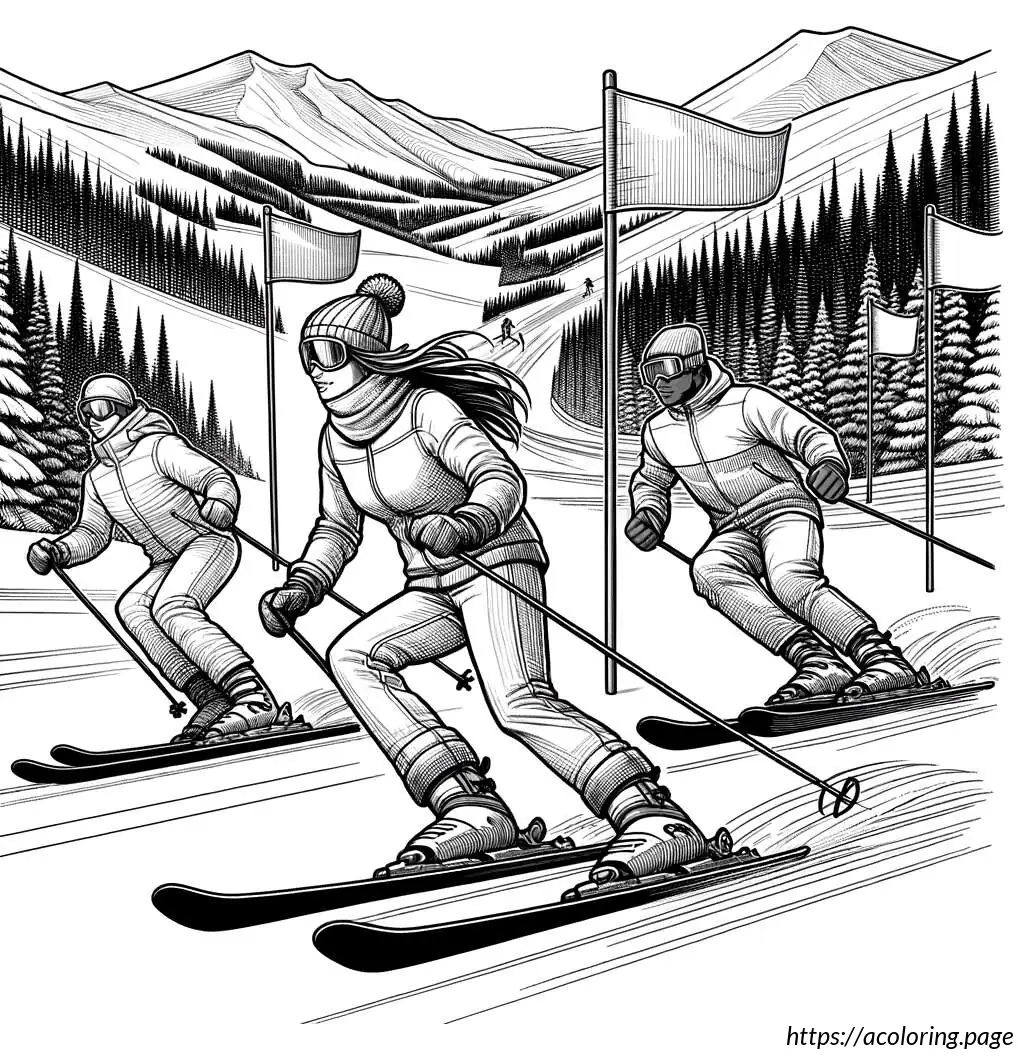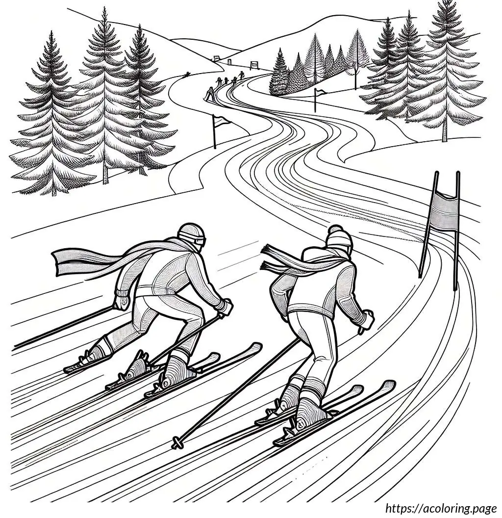 The entire scene is illustrated in a cartoon style, using clean lines and without color, resembling a coloring book page. The portrayal effectively captures the speed and exhilaration associated with downhill skiing.