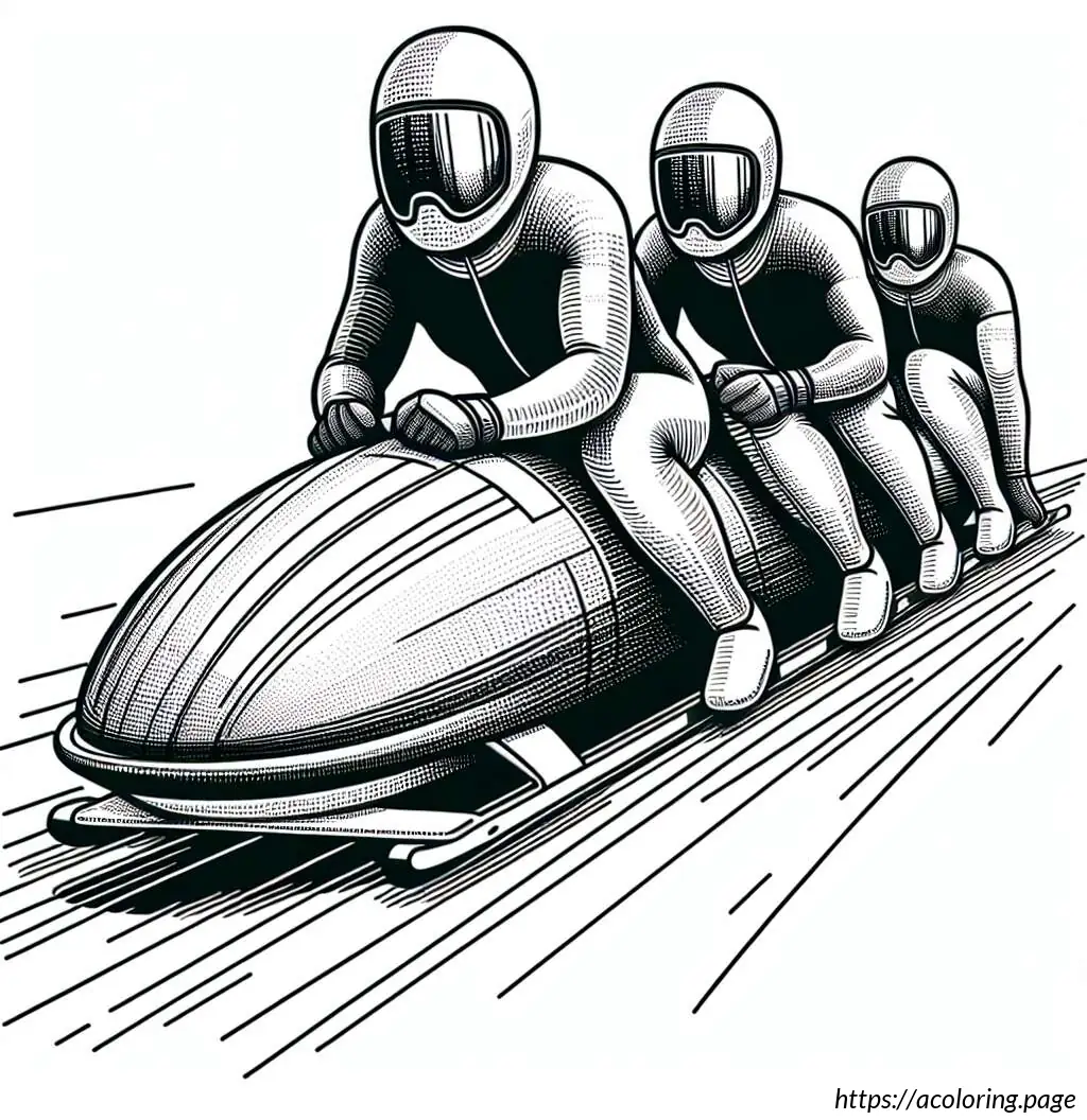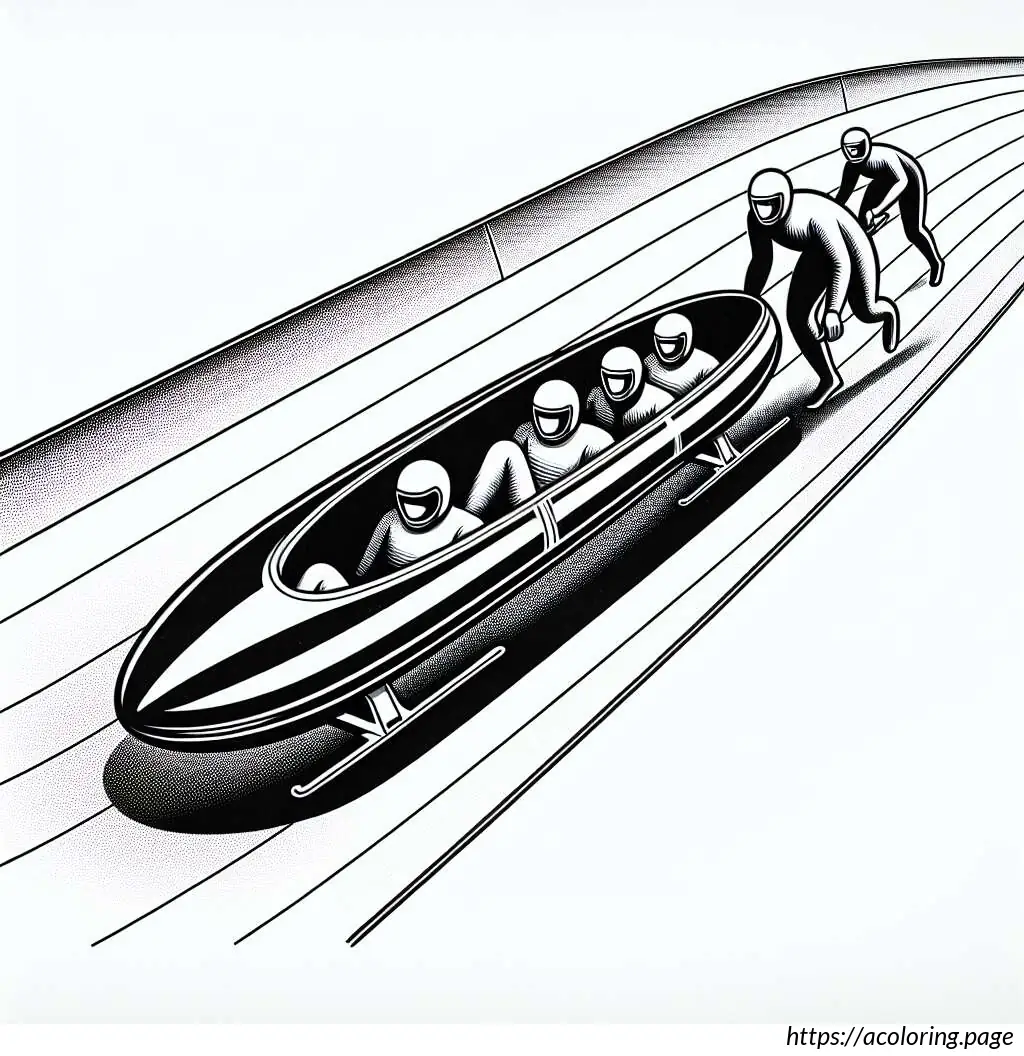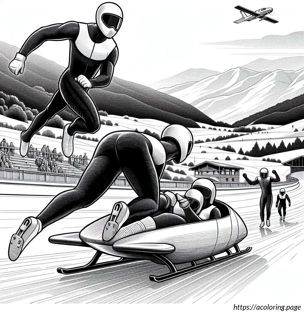 This image depicts a bobsleigh team in action, rendered in a black-and-white line drawing style, likely intended for coloring activities. The scene is dynamic, showing two team members pushing the bobsleigh from the back with noticeable effort, one foot on the ground while the other is mid-step. They are both wearing helmets and tight suits, typical of professional bobsleigh athletes, emphasizing the speed and agility of the sport.