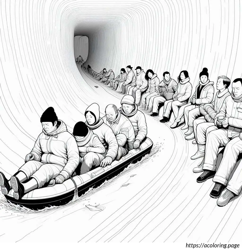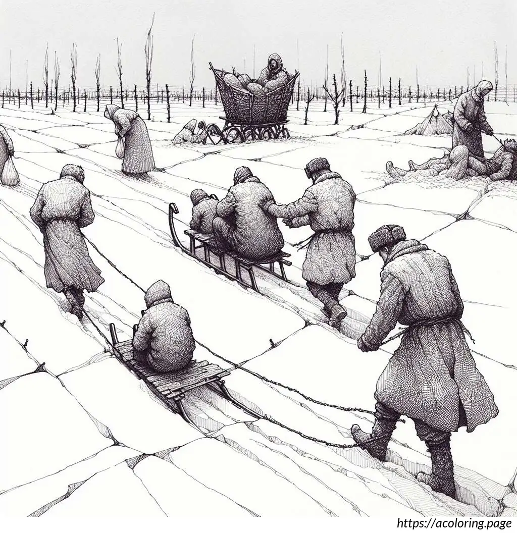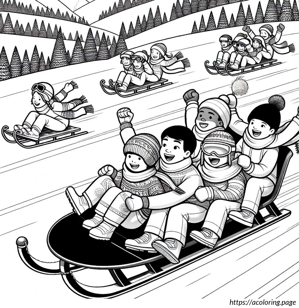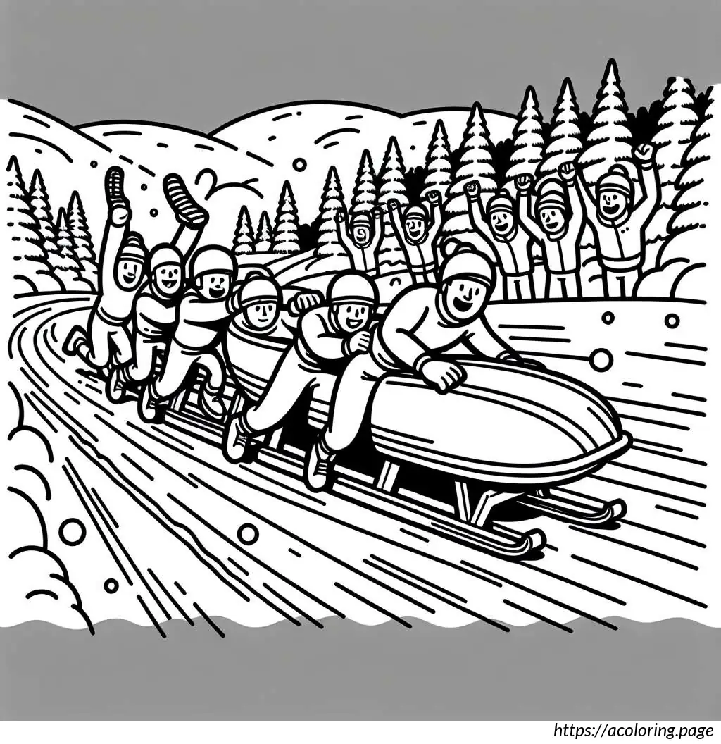 This image depicts a bobsleigh team in action, rendered in a black-and-white line drawing style, likely intended for coloring activities. The scene is dynamic, showing two team members pushing the bobsleigh from the back with noticeable effort, one foot on the ground while the other is mid-step. They are both wearing helmets and tight suits, typical of professional bobsleigh athletes, emphasizing the speed and agility of the sport.