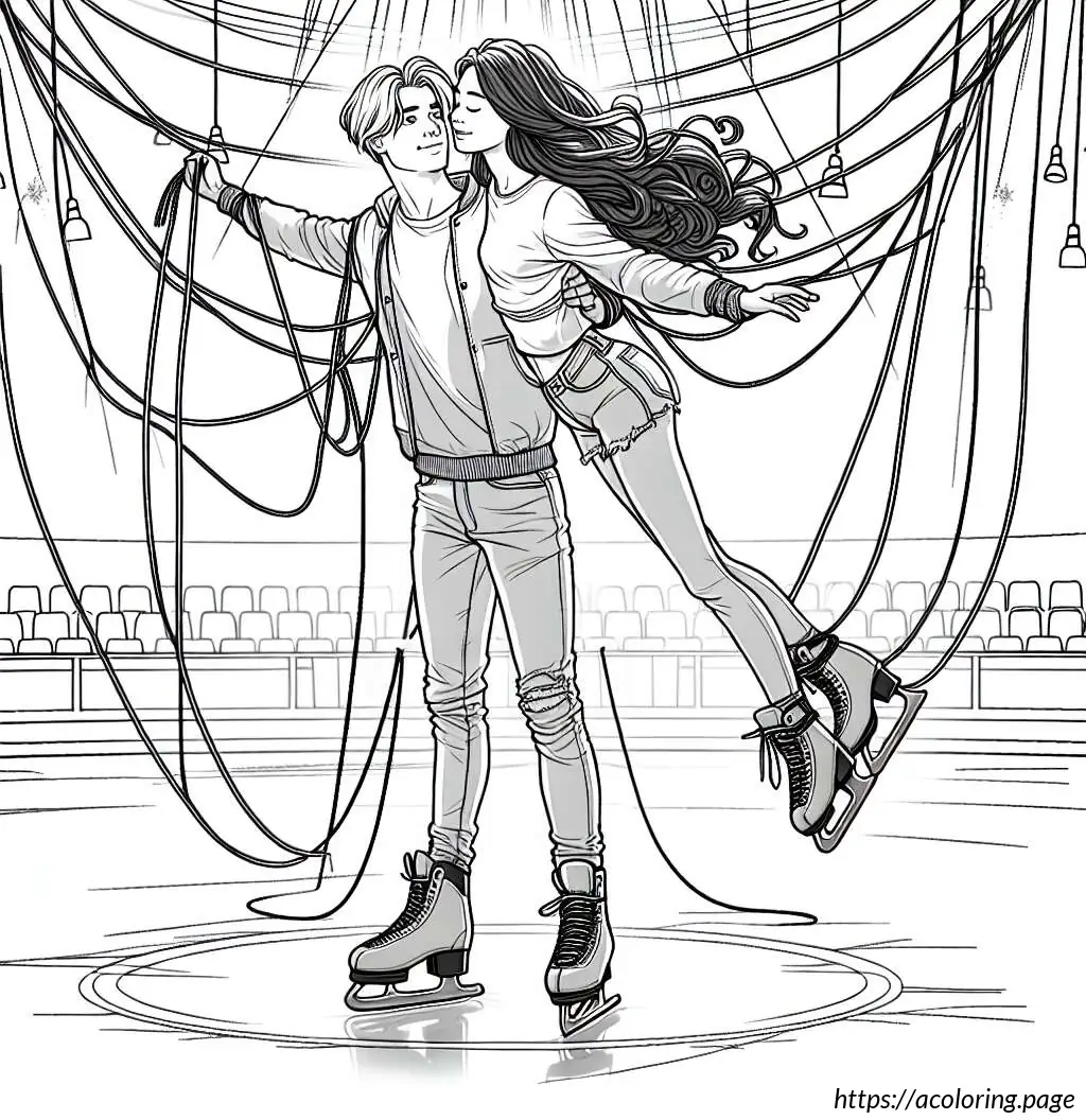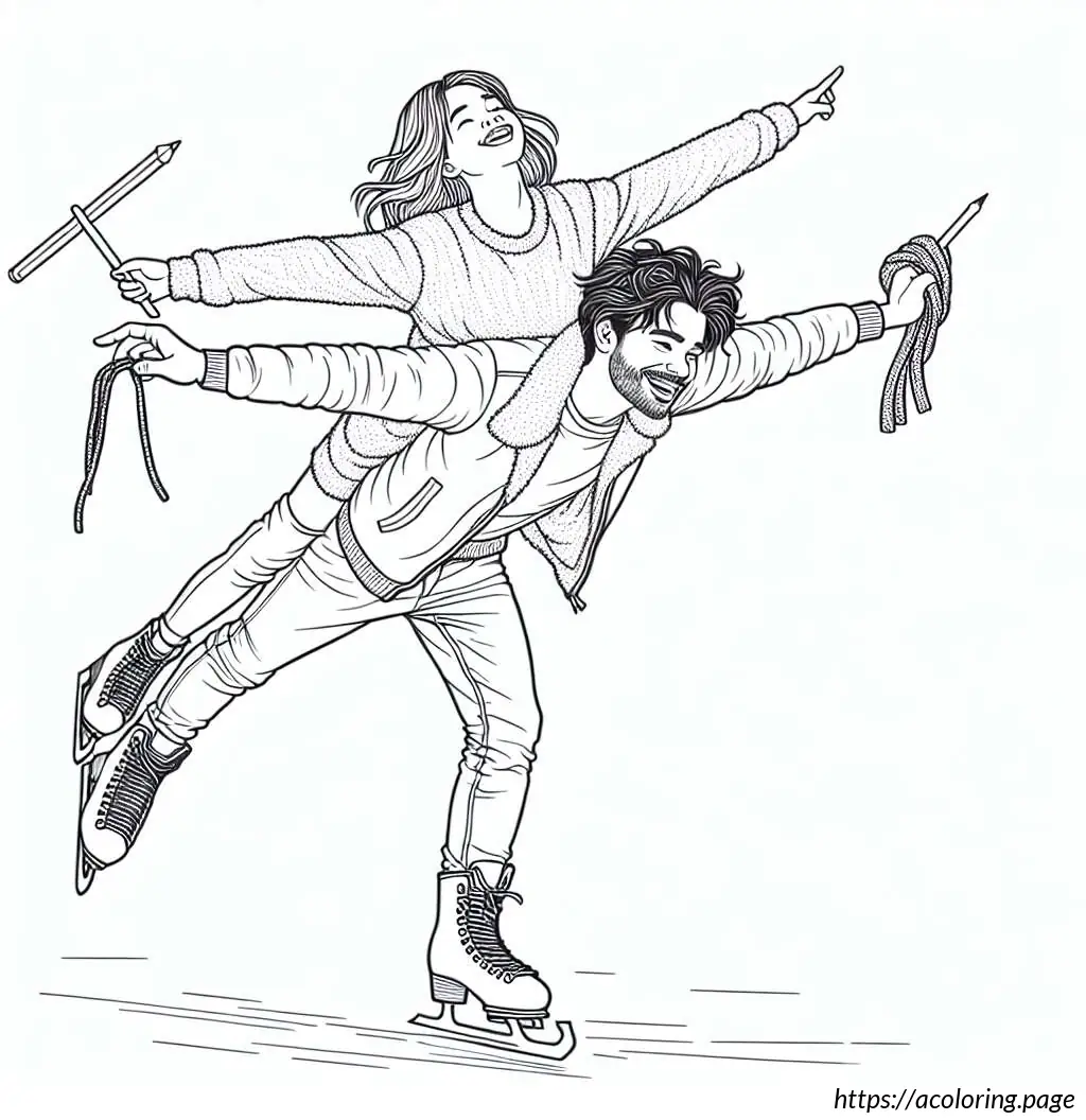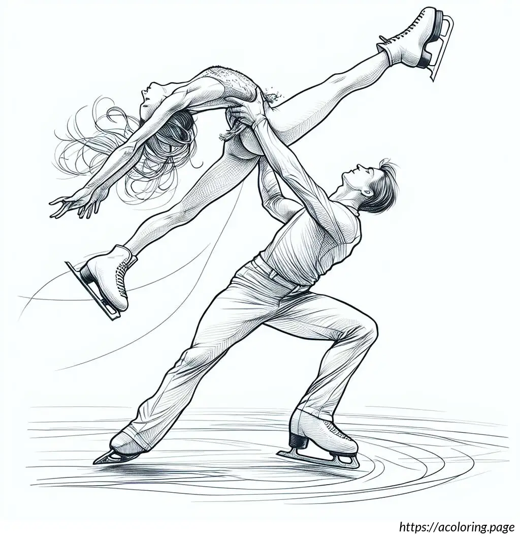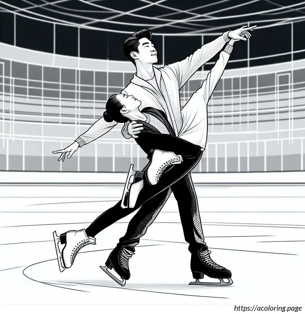 This is a black and white line drawing of two figures ice skating together on an indoor rink. The male figure is standing behind the female figure, both wearing ice skates and casual, sporty clothing. He is holding her in a lifted pose—the male skater’s one hand supports the female around her waist, and his other arm extends along with hers, both pointing towards their left. The female figure is leaning forward with her arms wide open in a graceful pose, her left leg lifted and bent at the knee, held in the male skater’s right hand. The background of the image is minimal, featuring the texture of the ice surface and the walls of the ice skating rink, suggesting movement and adding depth to the scene. The overall impression is energetic and artistic, depicting a moment of cooperative movement and balance.