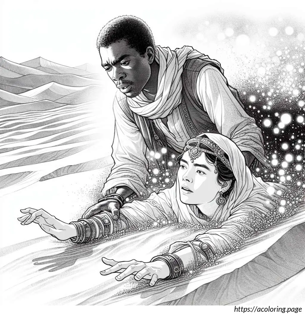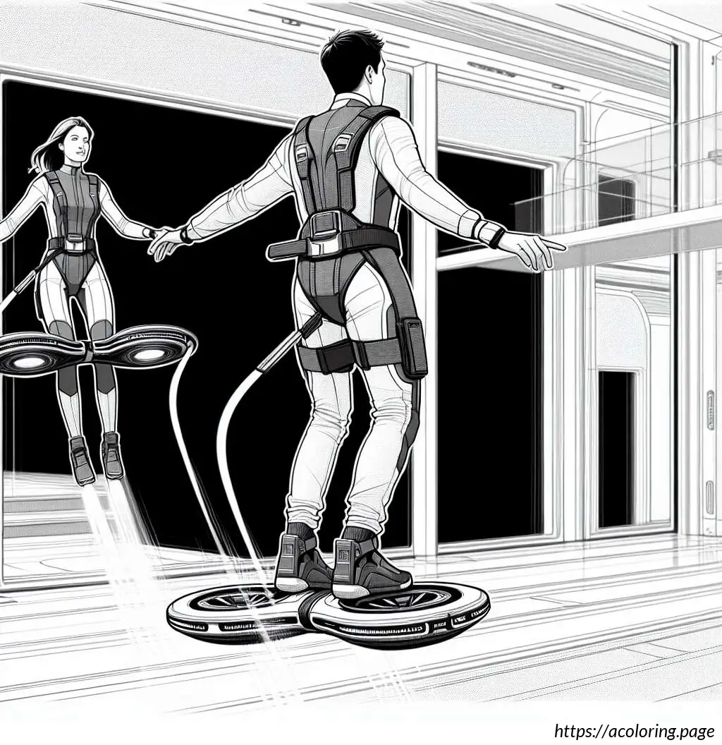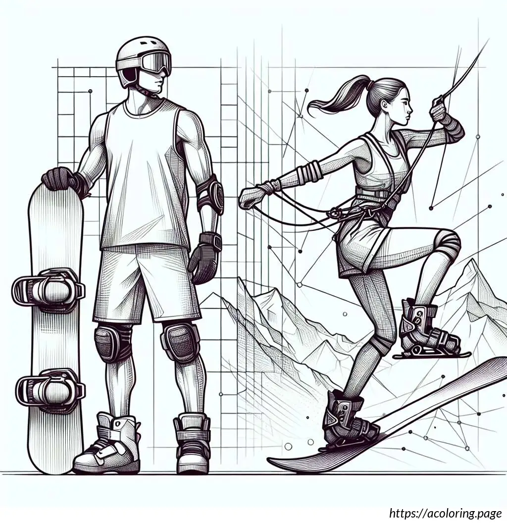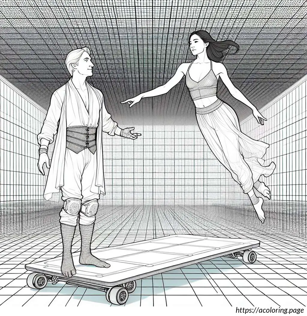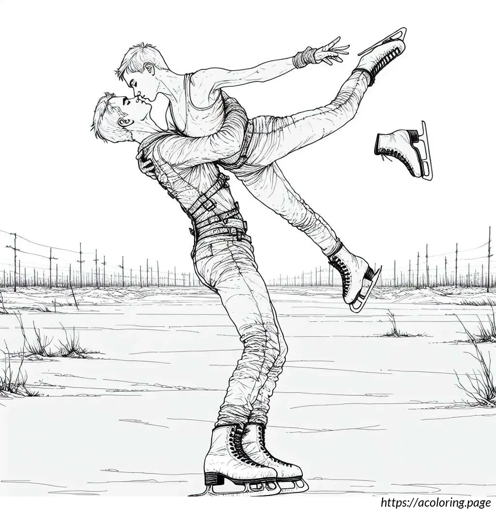 This is a black and white line drawing of two figures ice skating together on an indoor rink. The male figure is standing behind the female figure, both wearing ice skates and casual, sporty clothing. He is holding her in a lifted pose—the male skater’s one hand supports the female around her waist, and his other arm extends along with hers, both pointing towards their left. The female figure is leaning forward with her arms wide open in a graceful pose, her left leg lifted and bent at the knee, held in the male skater’s right hand. The background of the image is minimal, featuring the texture of the ice surface and the walls of the ice skating rink, suggesting movement and adding depth to the scene. The overall impression is energetic and artistic, depicting a moment of cooperative movement and balance.